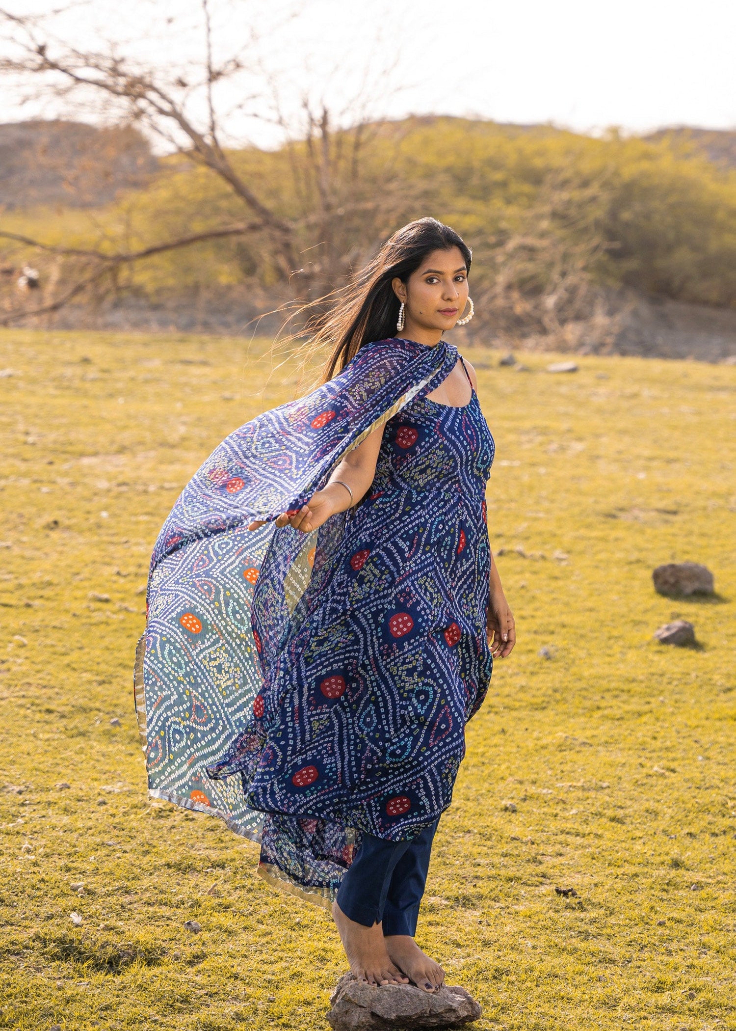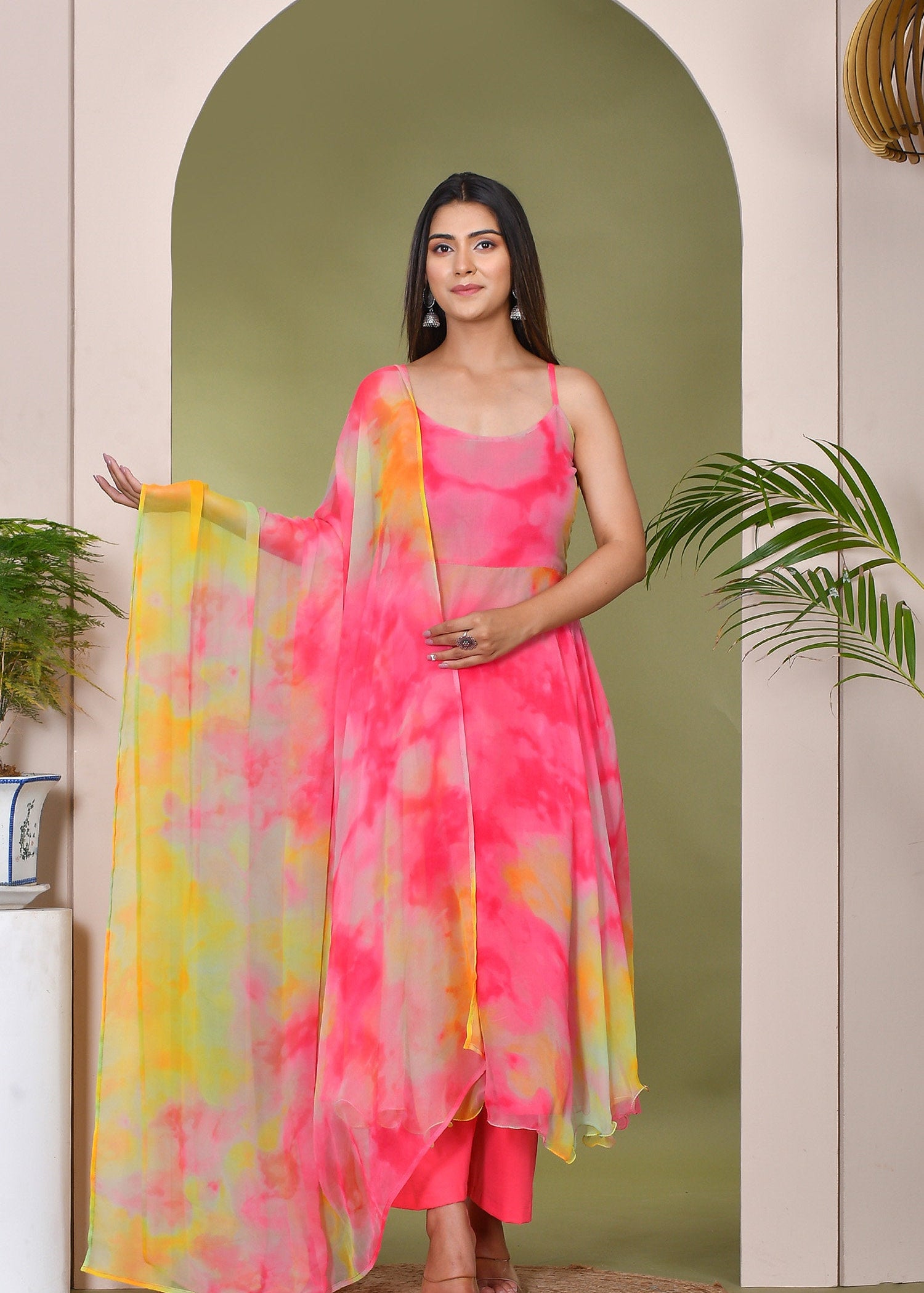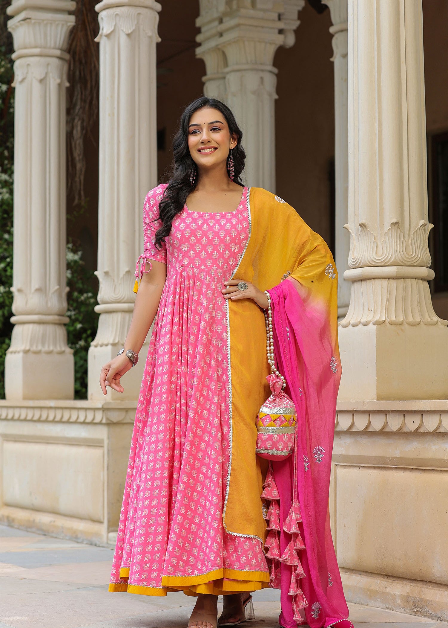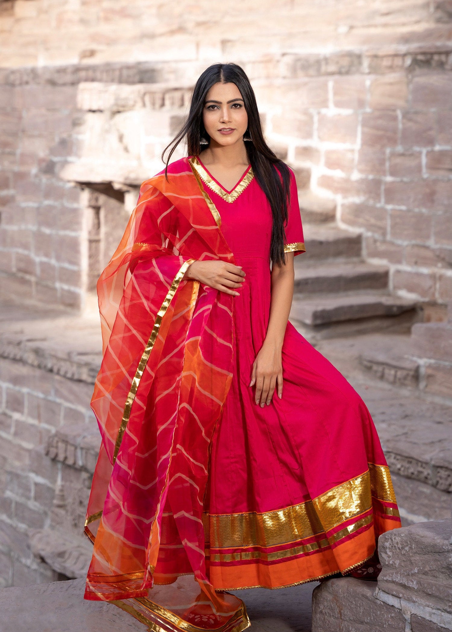 Bright Pink Chanderi Bandhani Printed Anarkali Set