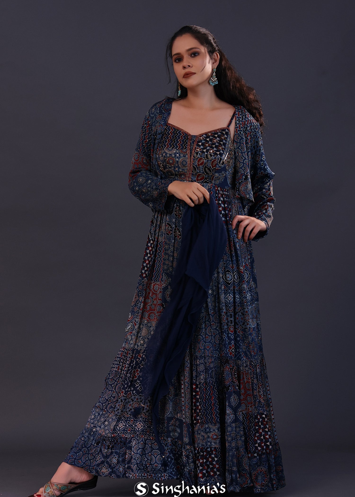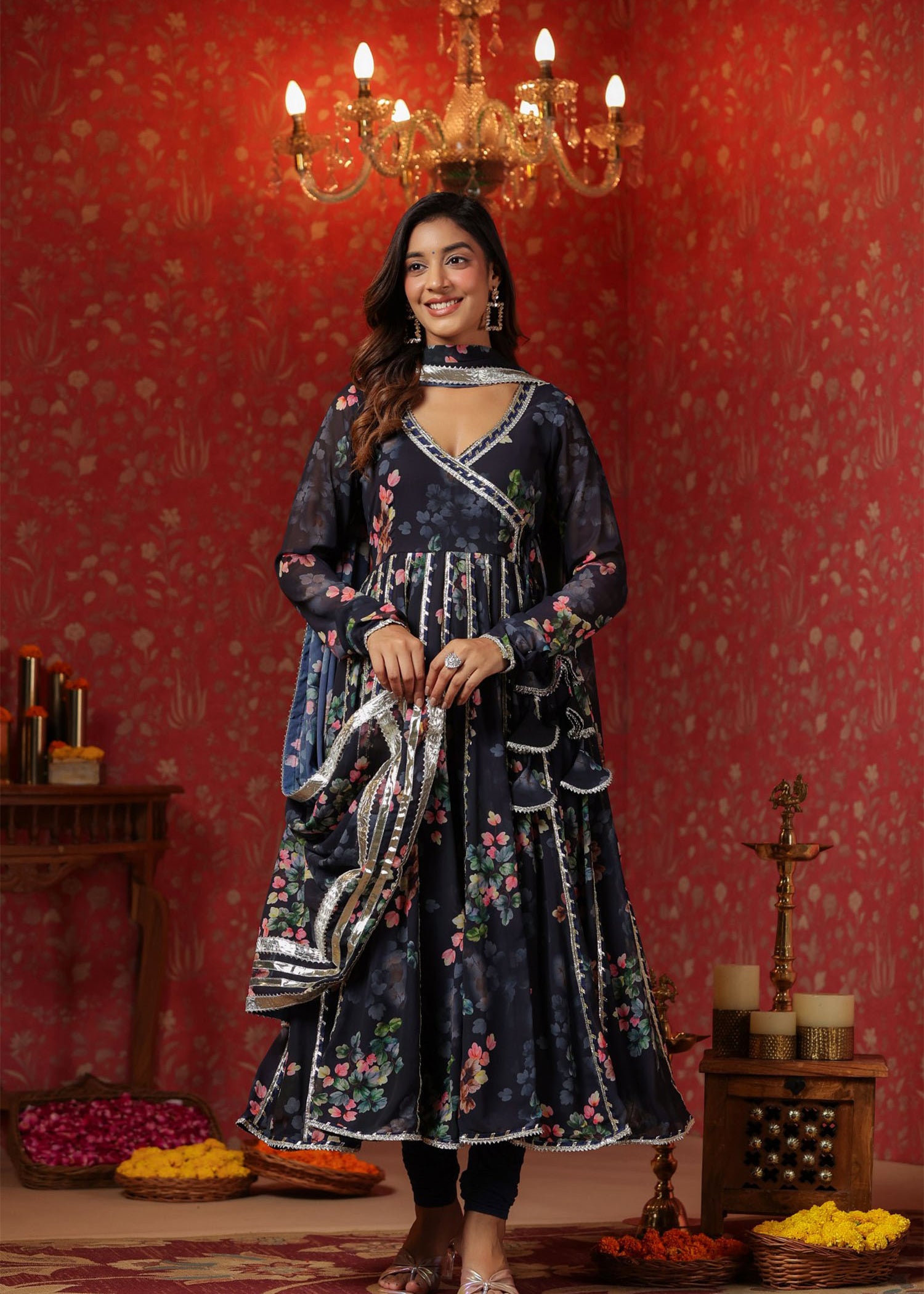 Dark Navy Blue Georgette Floral Printed Anarkali Set