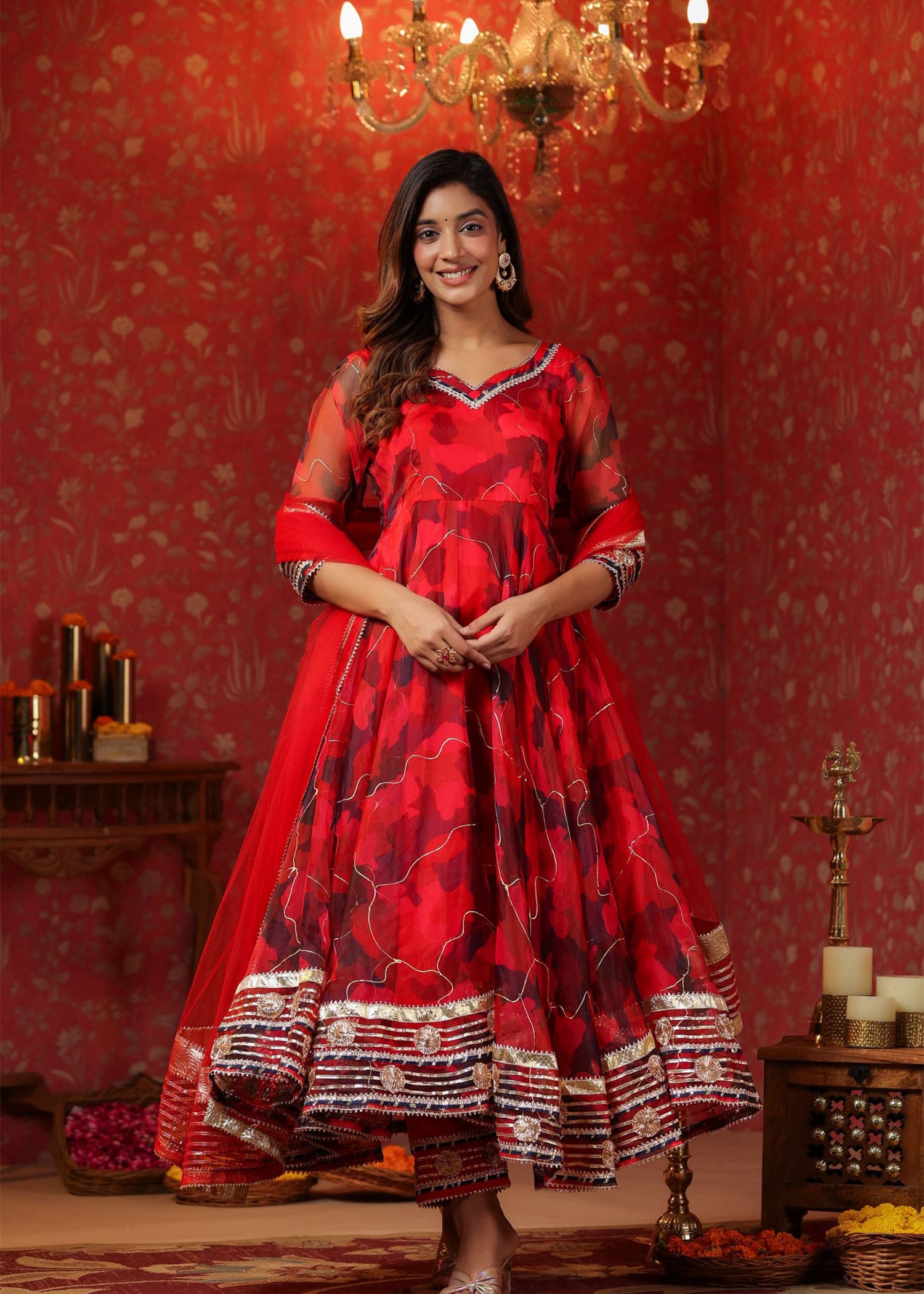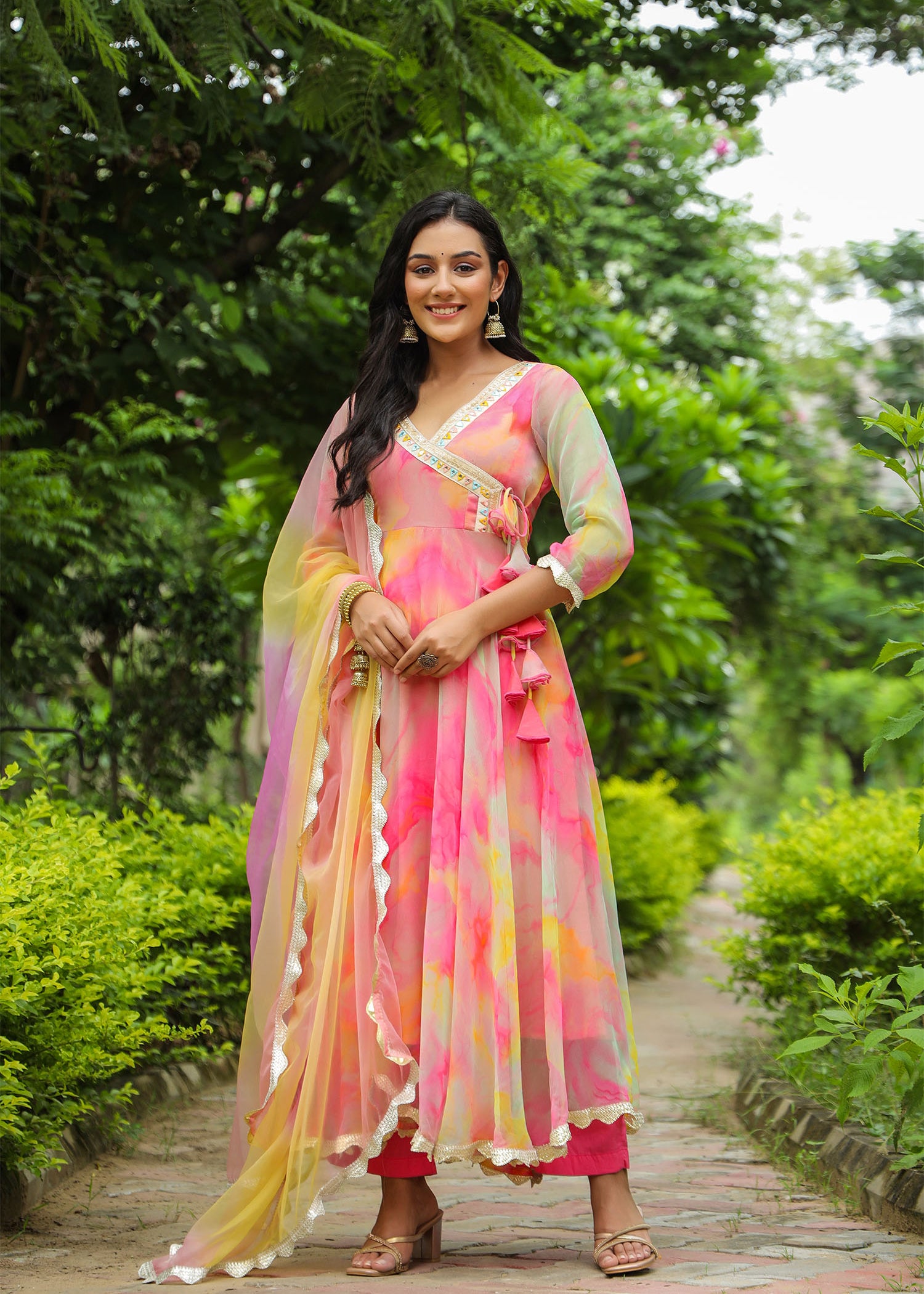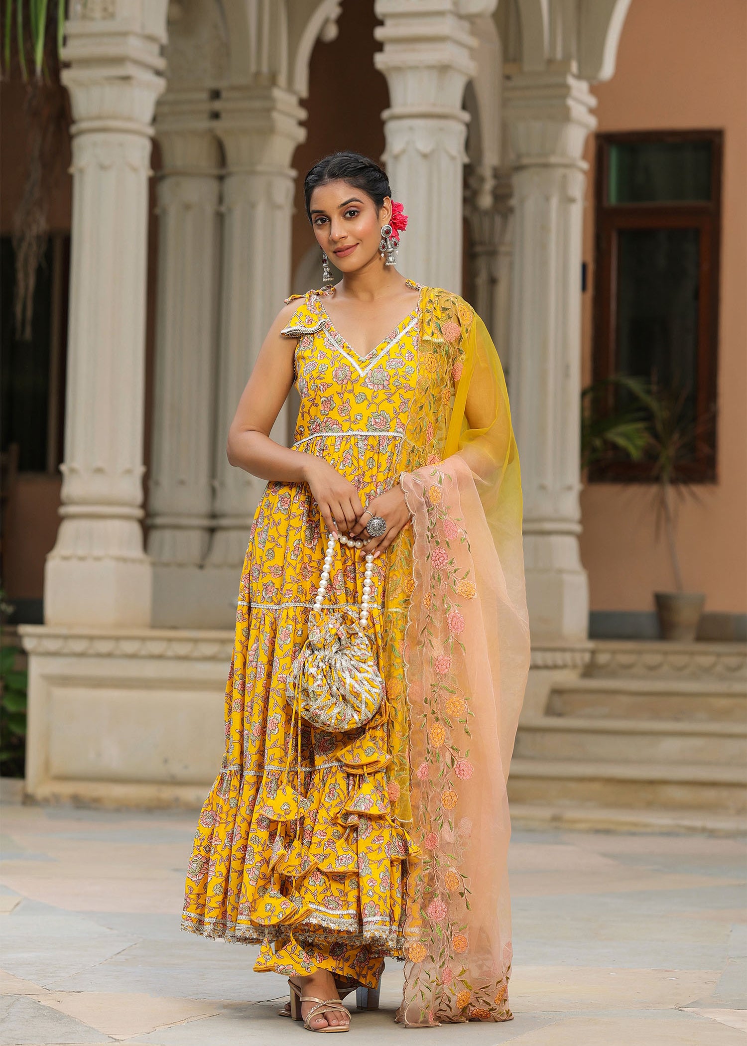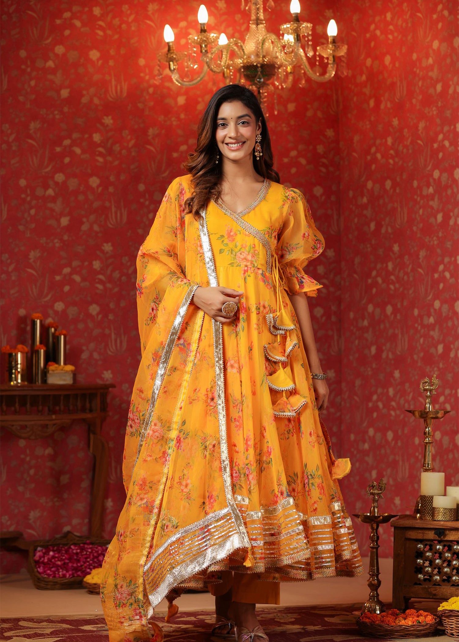 Saffron Yellow Organza Floral Printed Anarkali Set