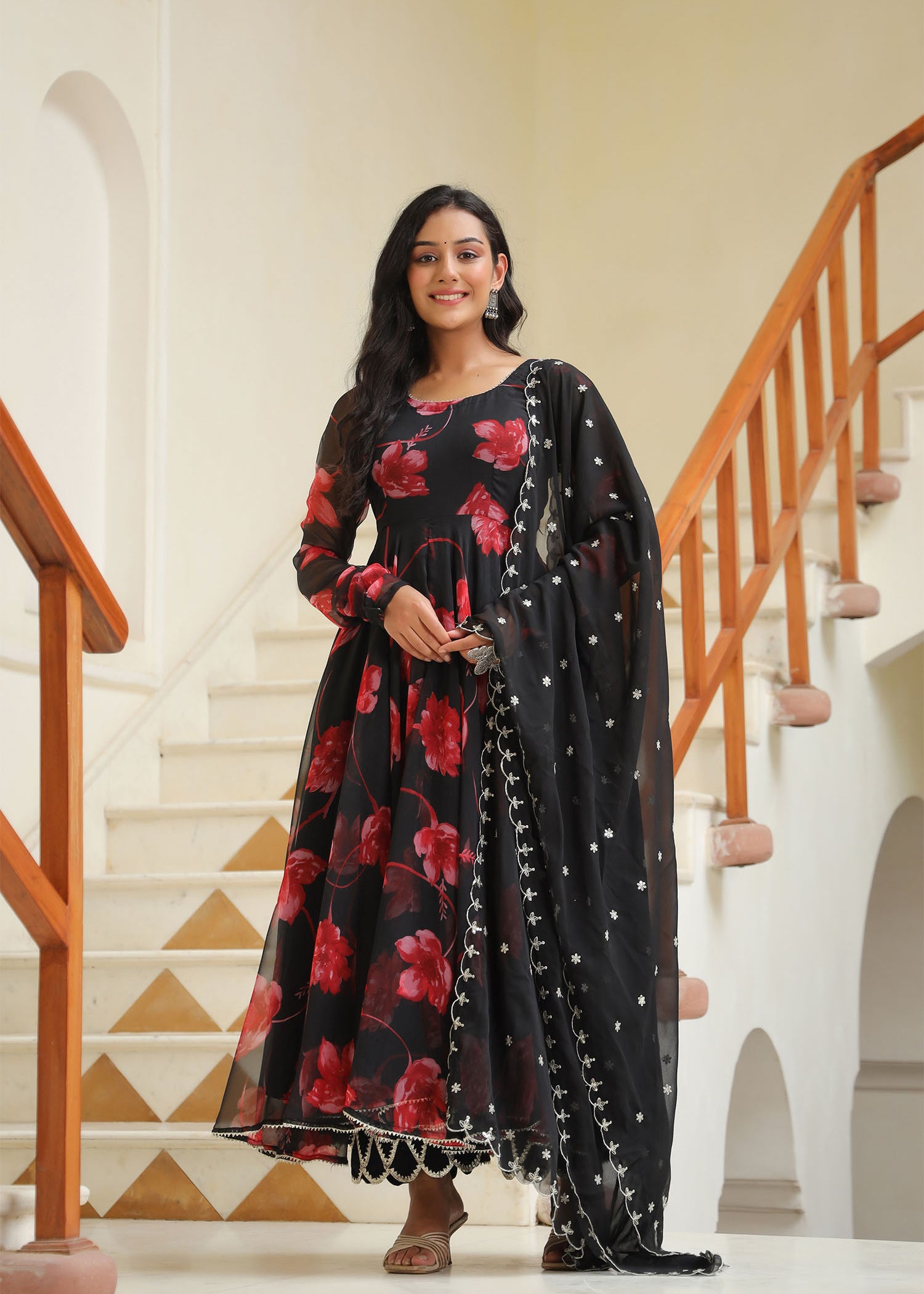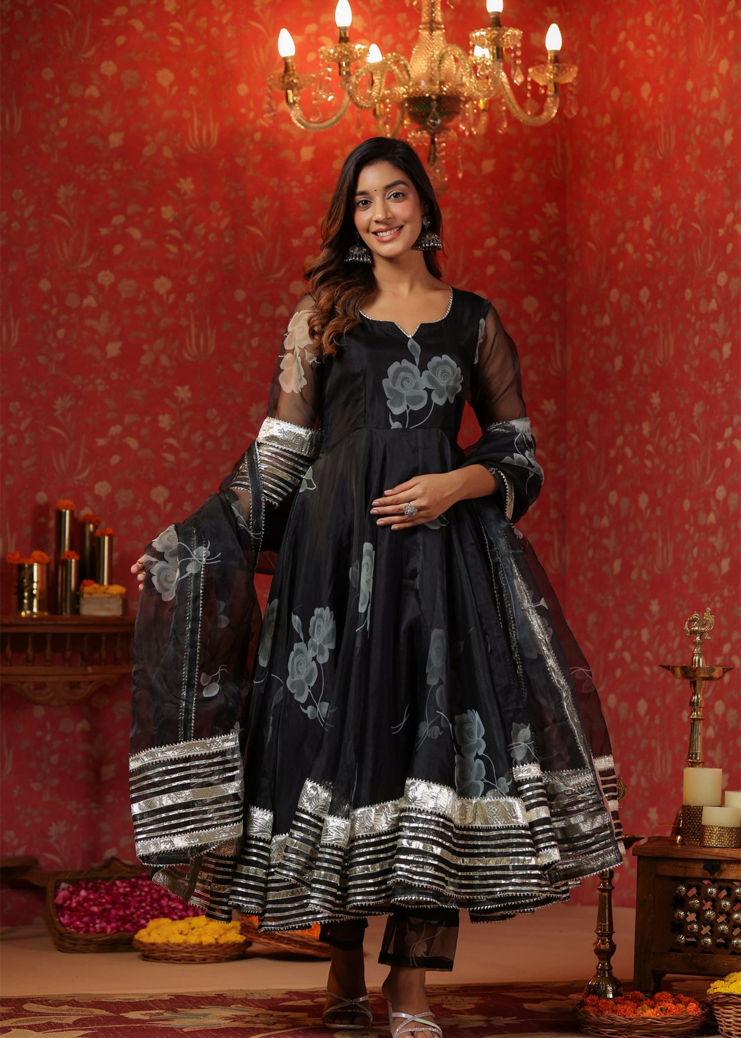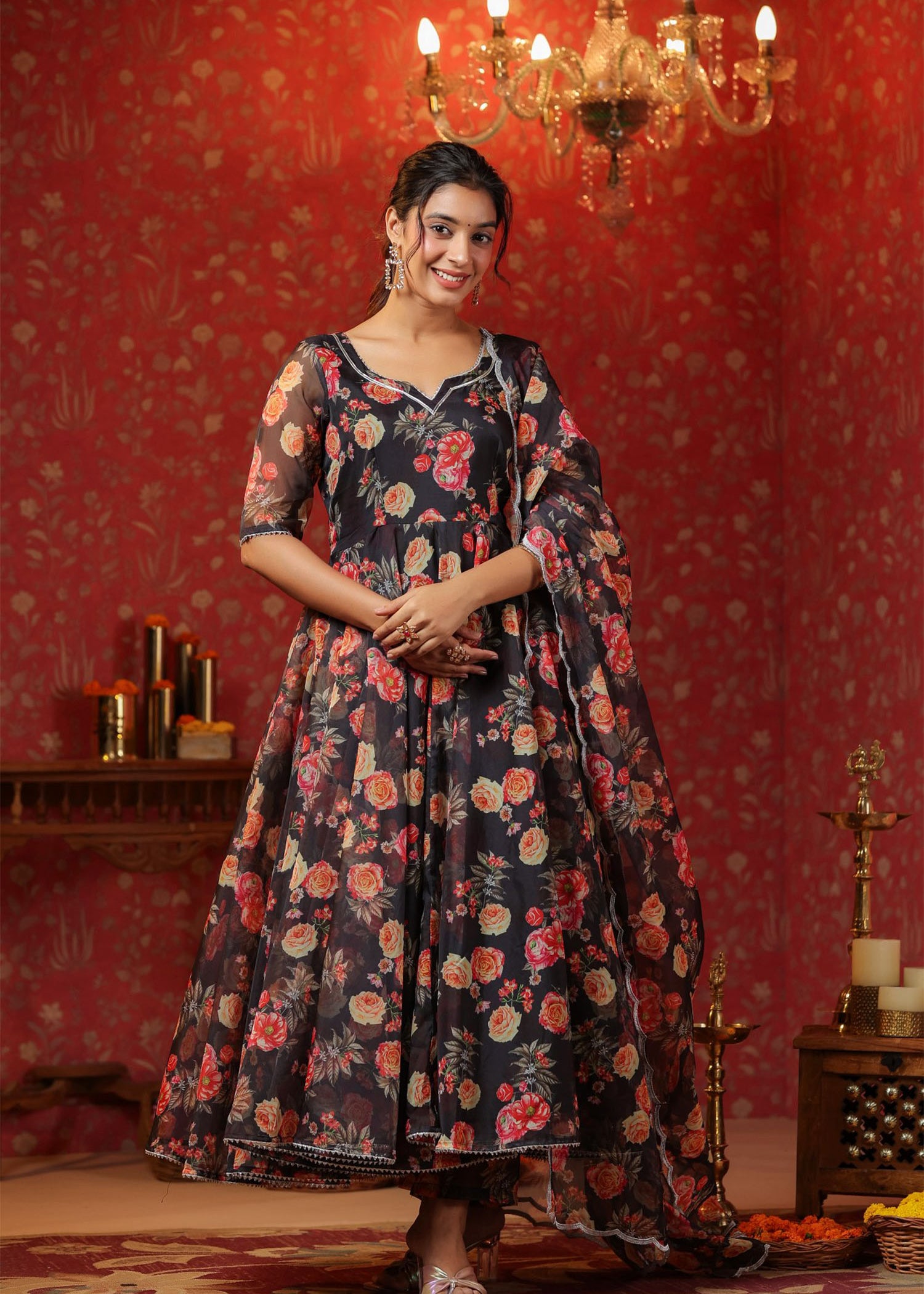Woodsmoke Black Organza Floral Printed Anarkali Set