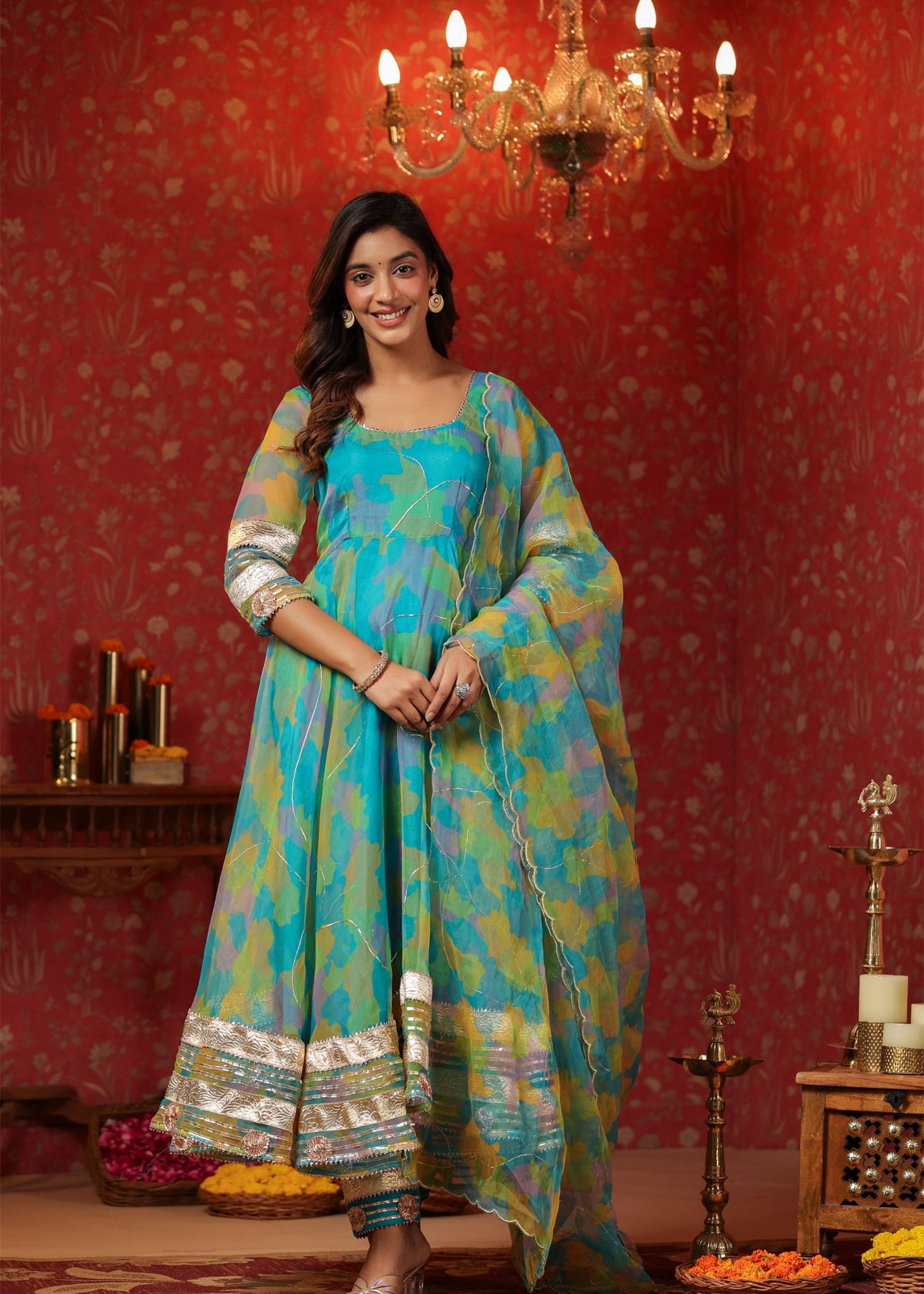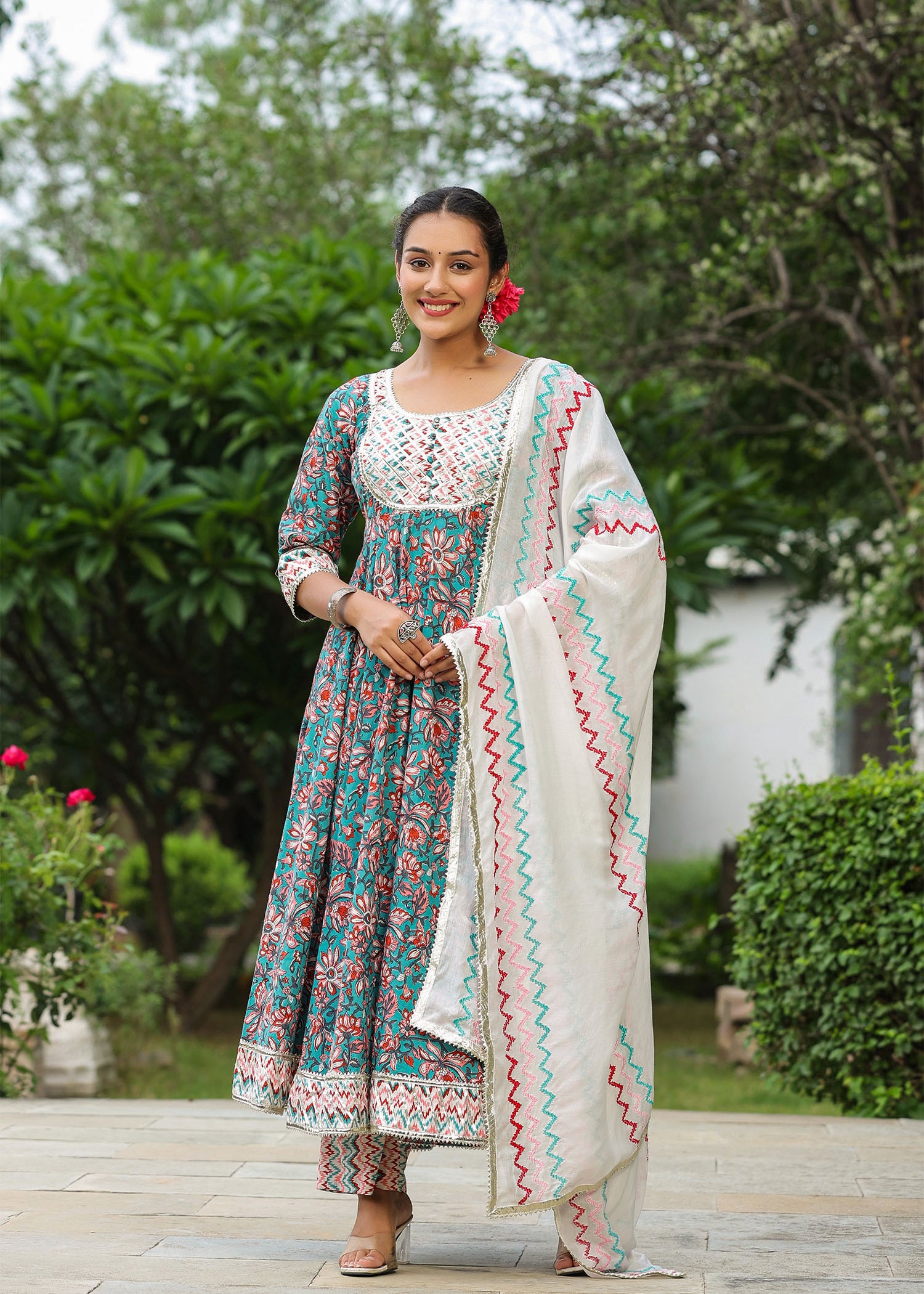 Turquoise Blue Cotton Floral Printed Anarkali Set