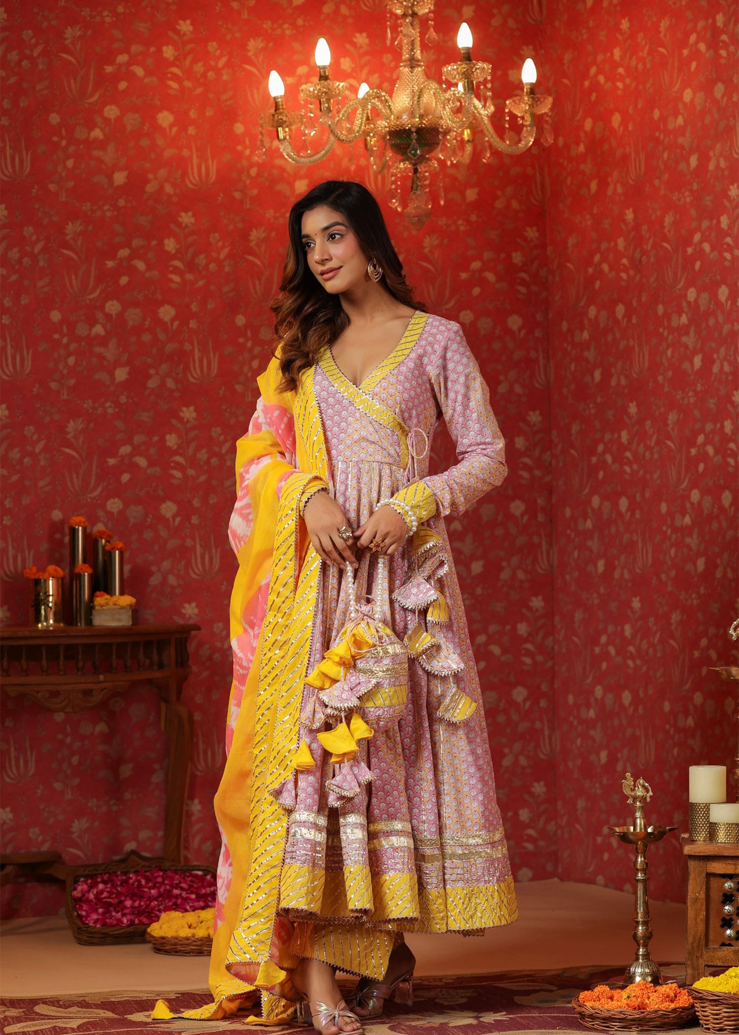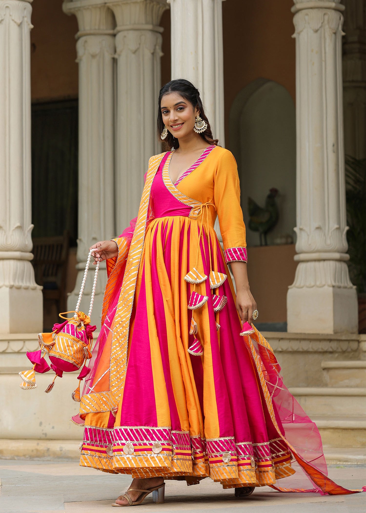Pink And Yellow Cotton Silk Solid Anarkali Set