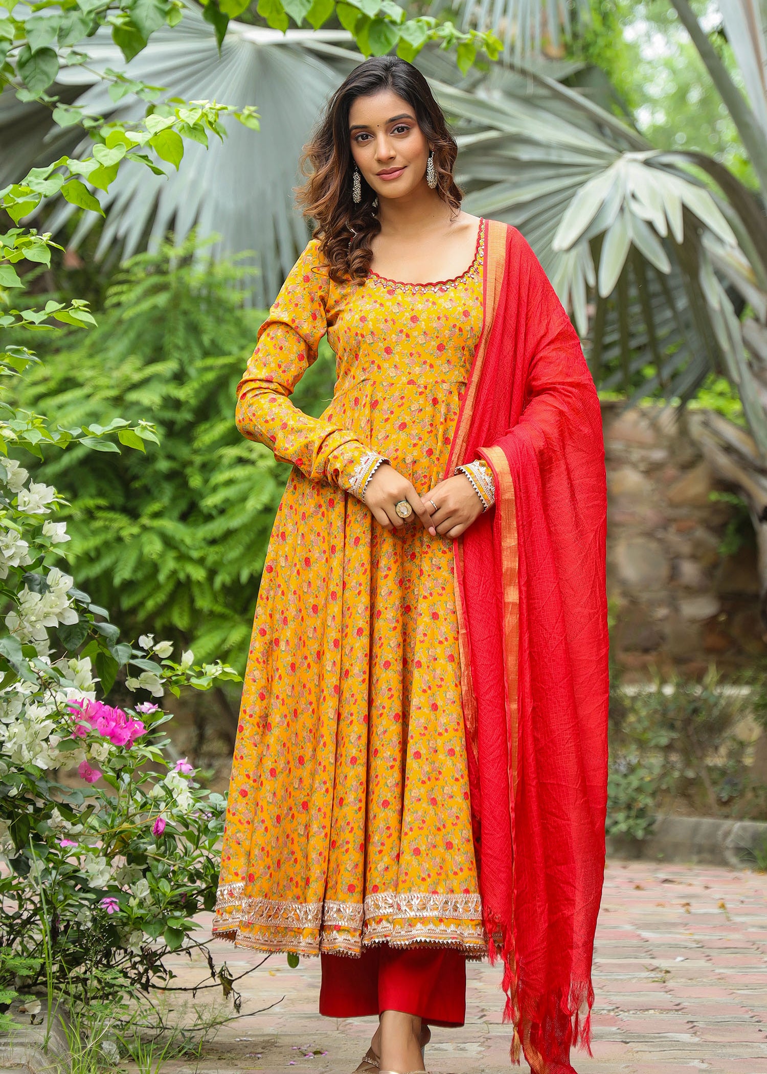 Saffron Yellow Cotton Floral Printed Anarkali Set
