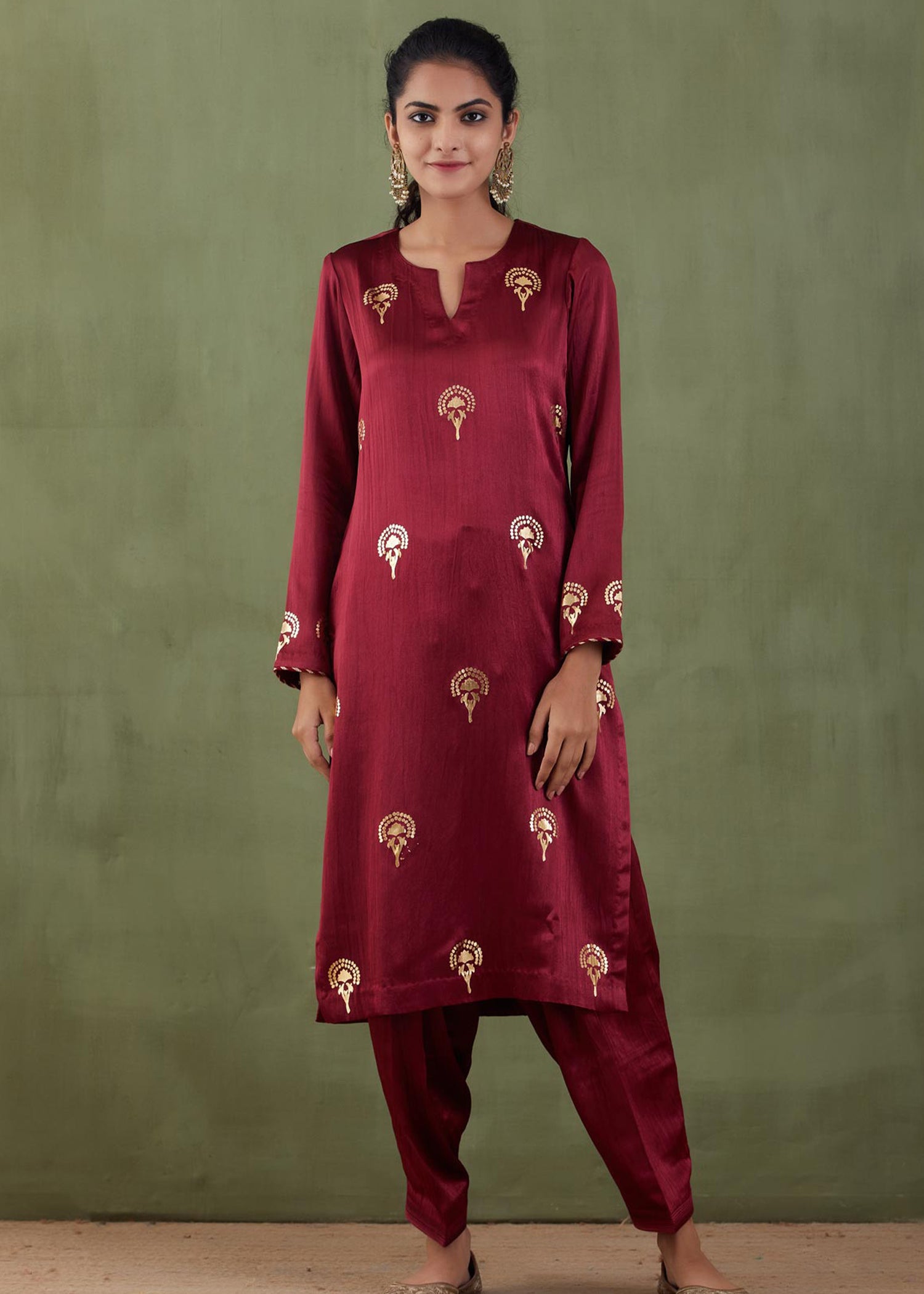 Maroon Foil Printed Mashru Silk Straight Kurta And Salwar With Velvet Shawl Set