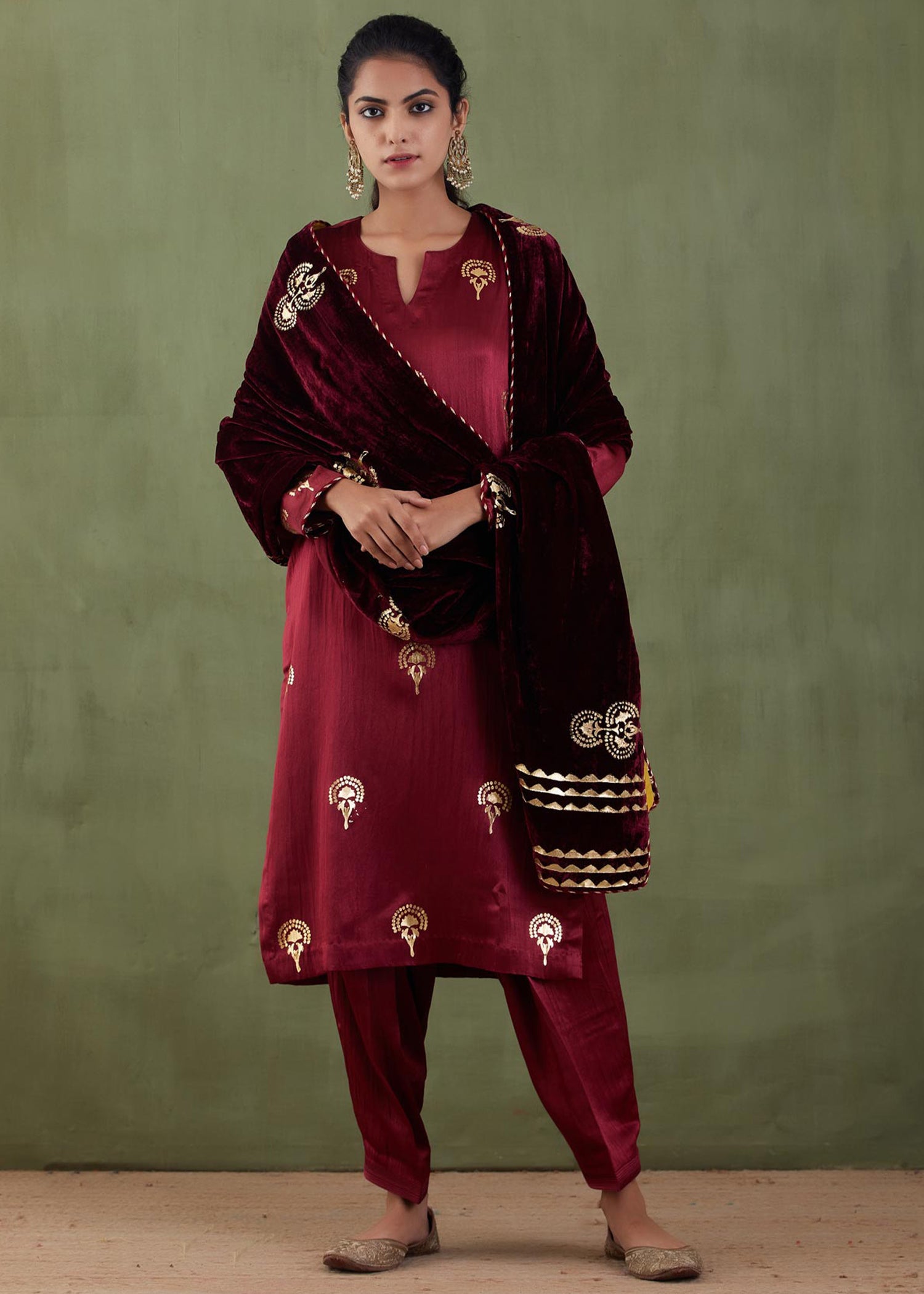 Floral Foil Print Dark Maroon Straight Kurta Set With Velvet Dupatta