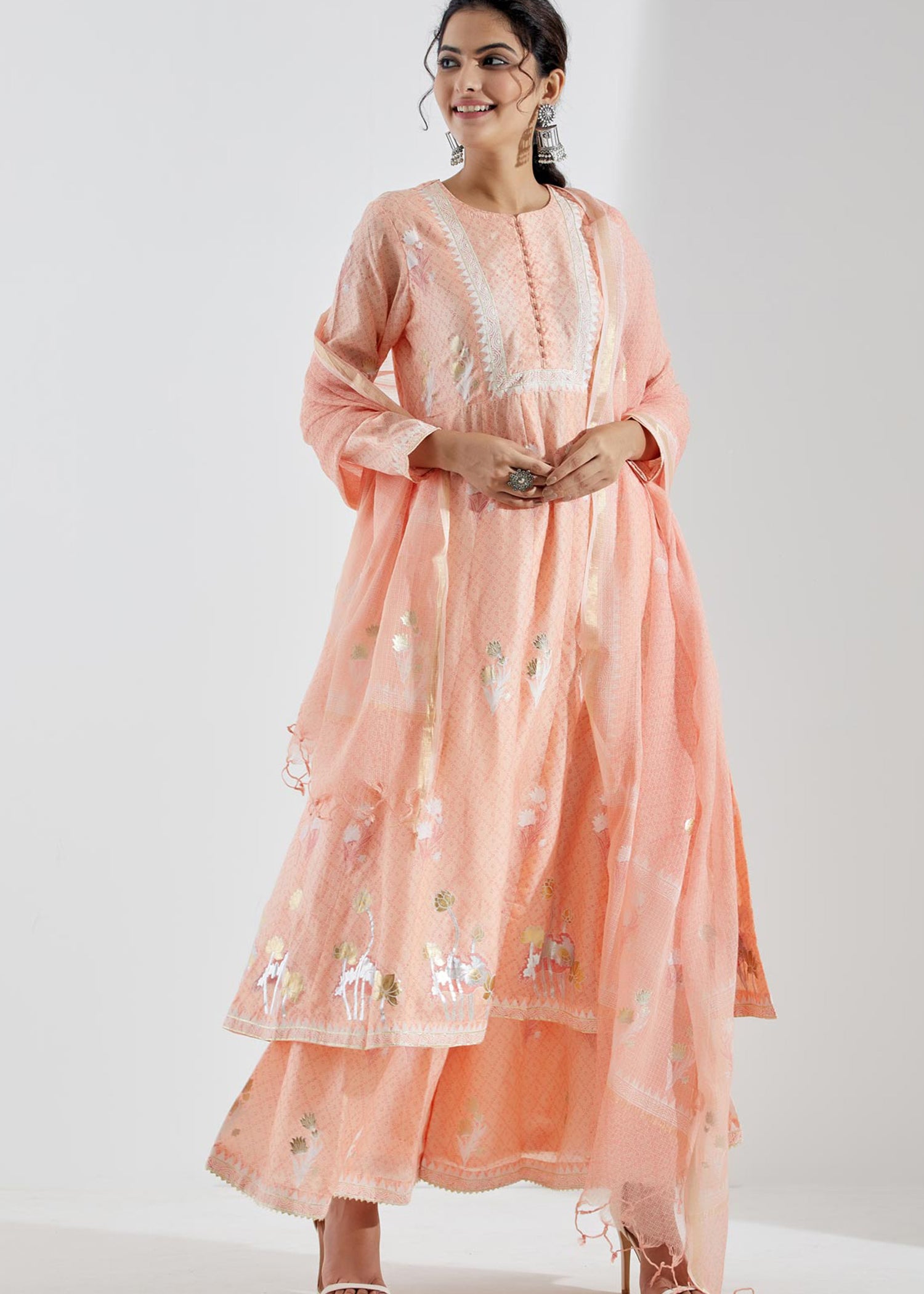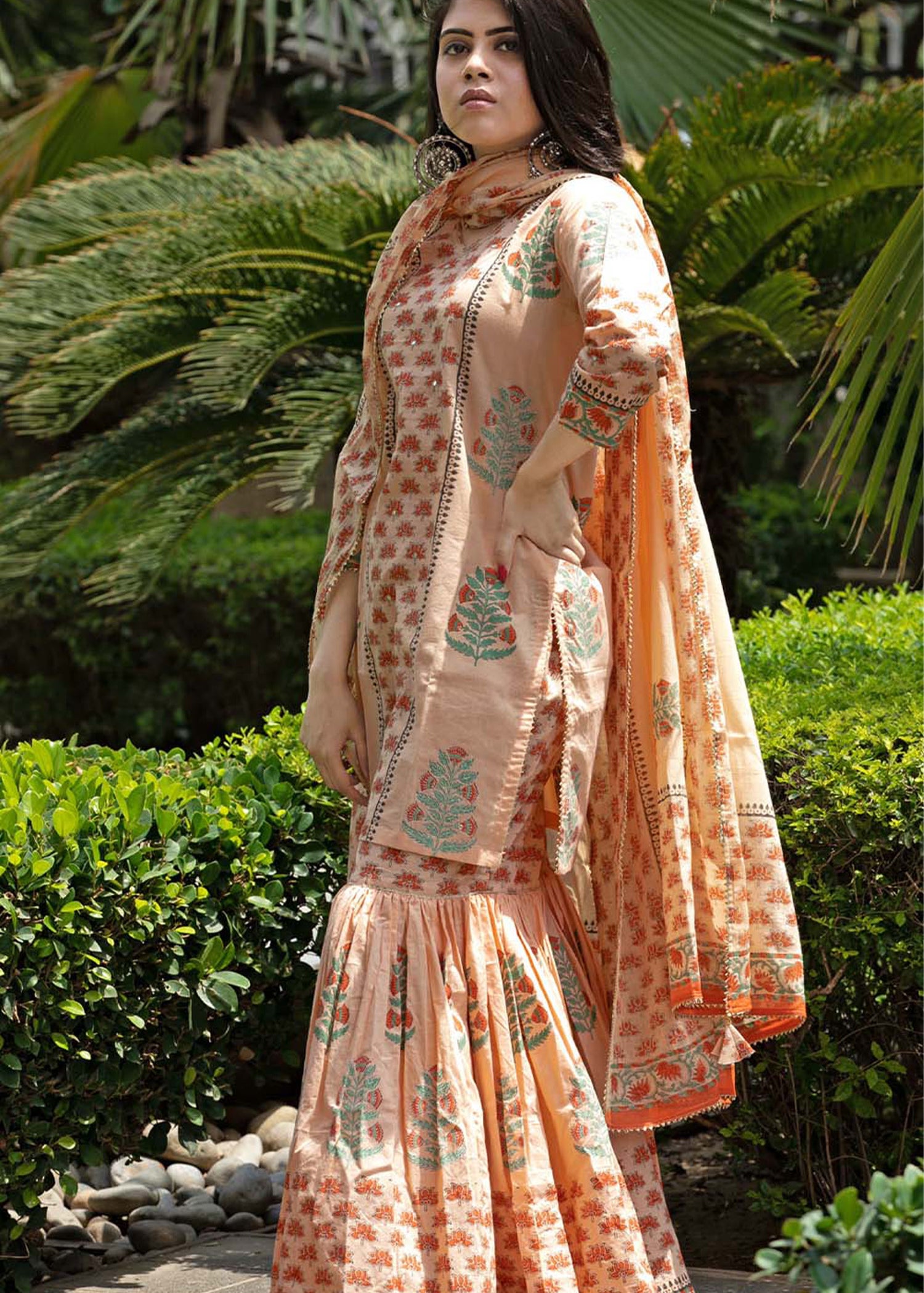 Printed Light Peach Floral Cotton Silk Anarkali Set