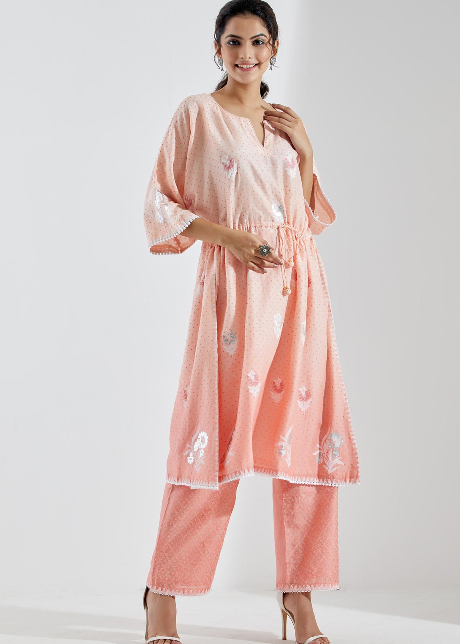 Ethnic Peach Colour Kurta With Silver Floral Patterns