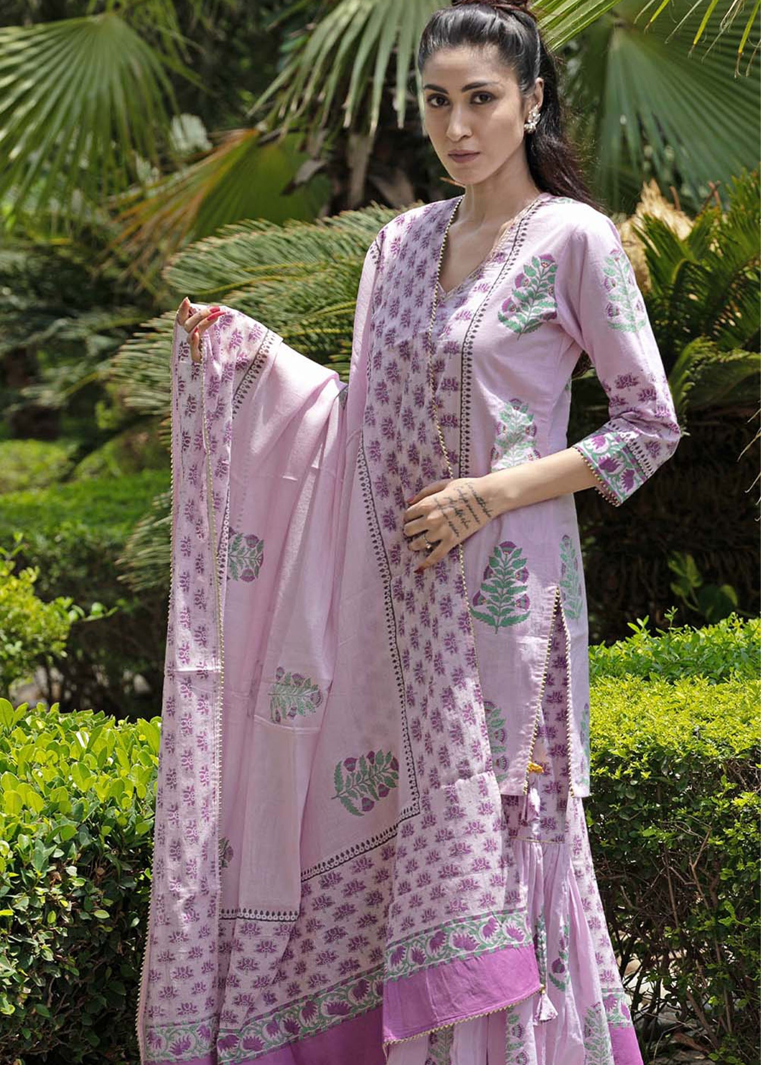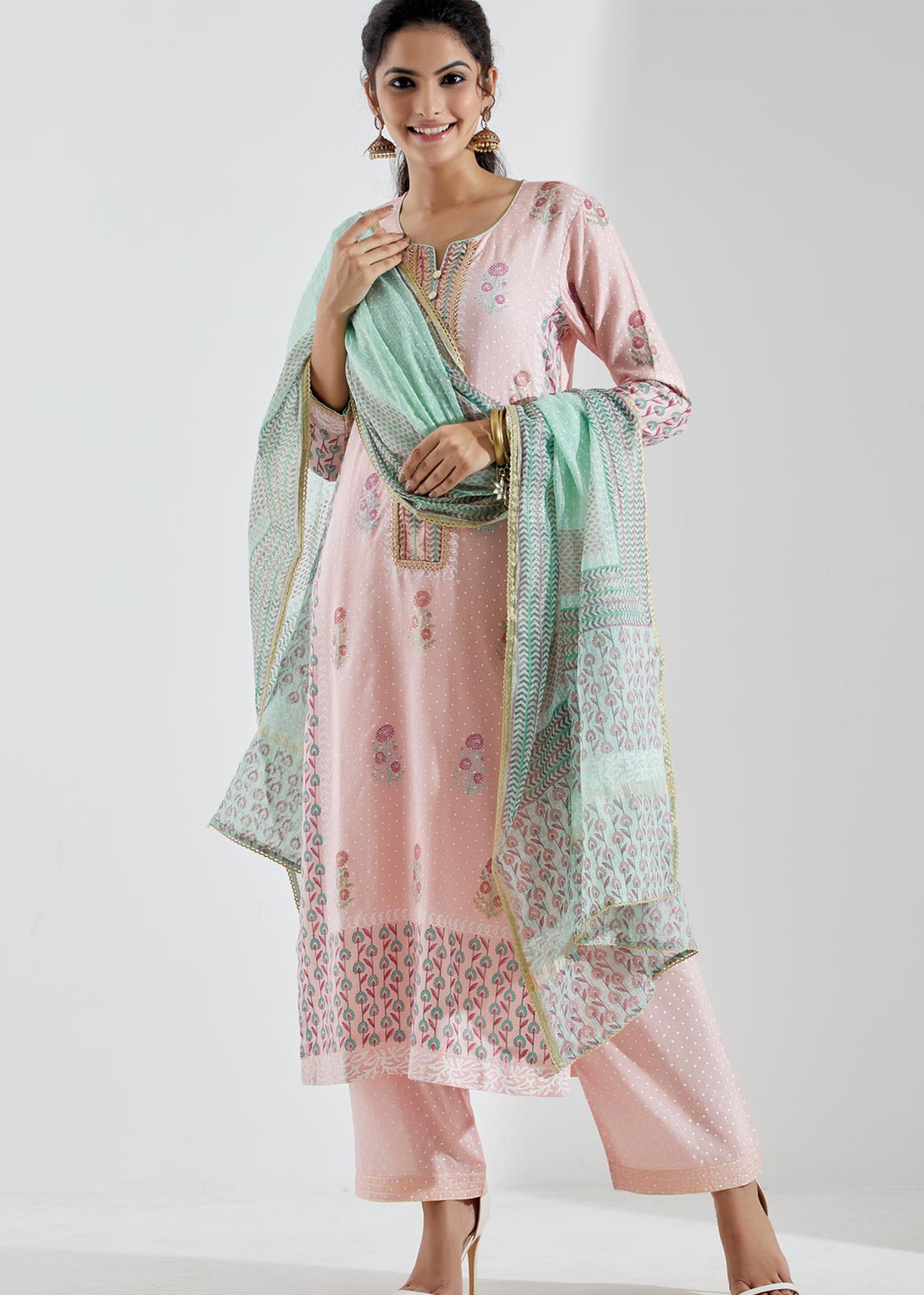Light Pink Cotton Silk Ethnic Suit Set With Subtle Floral Design