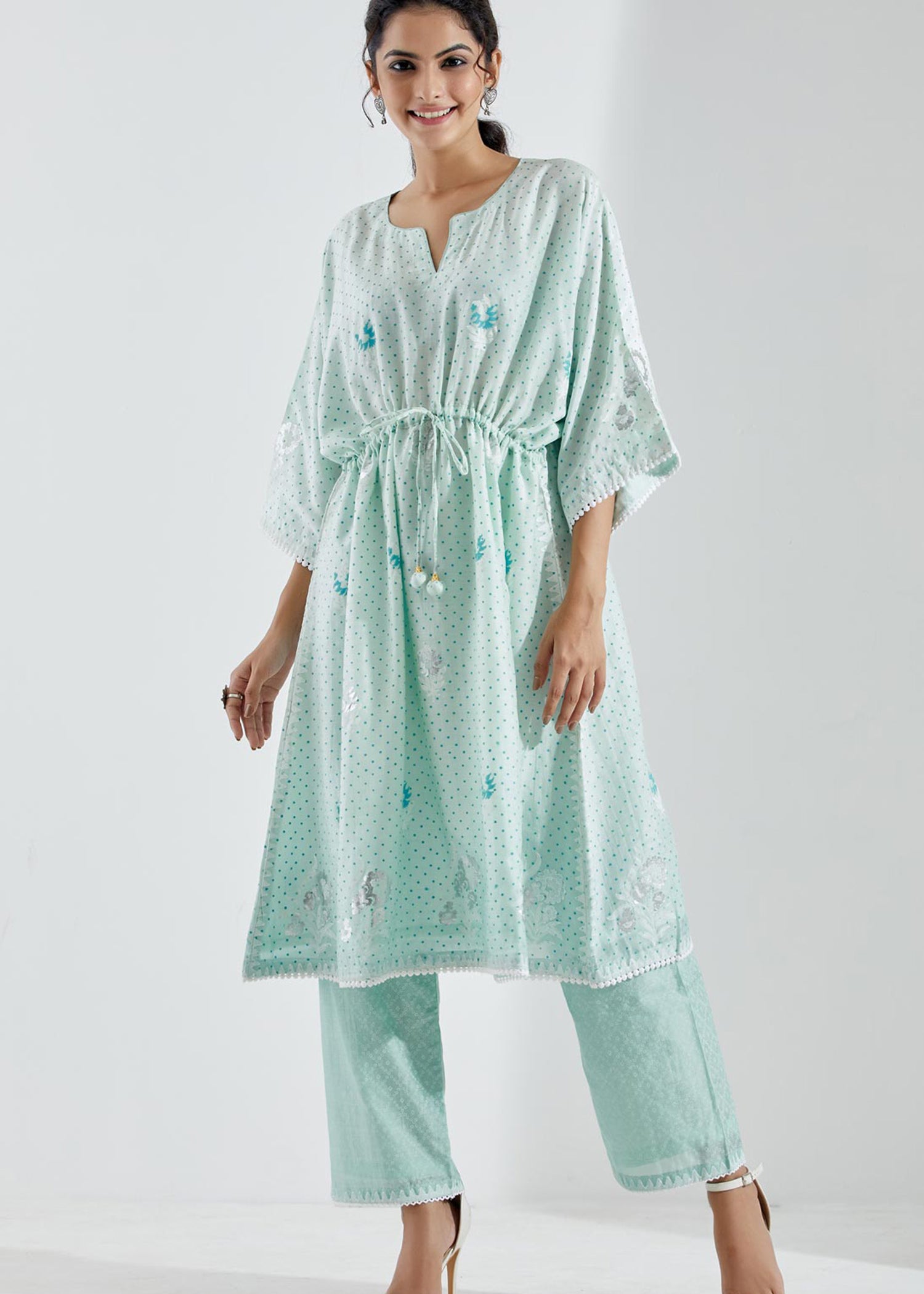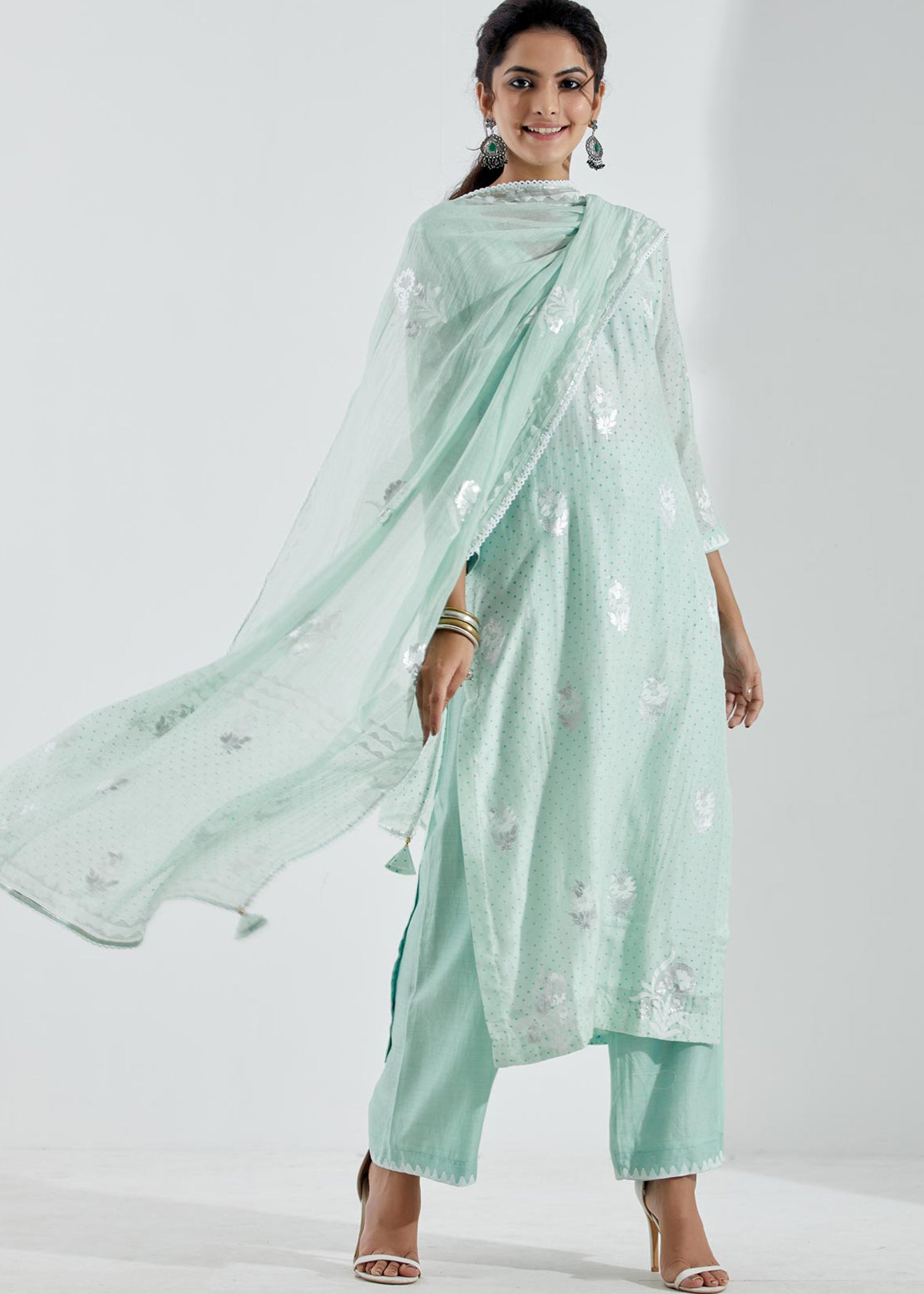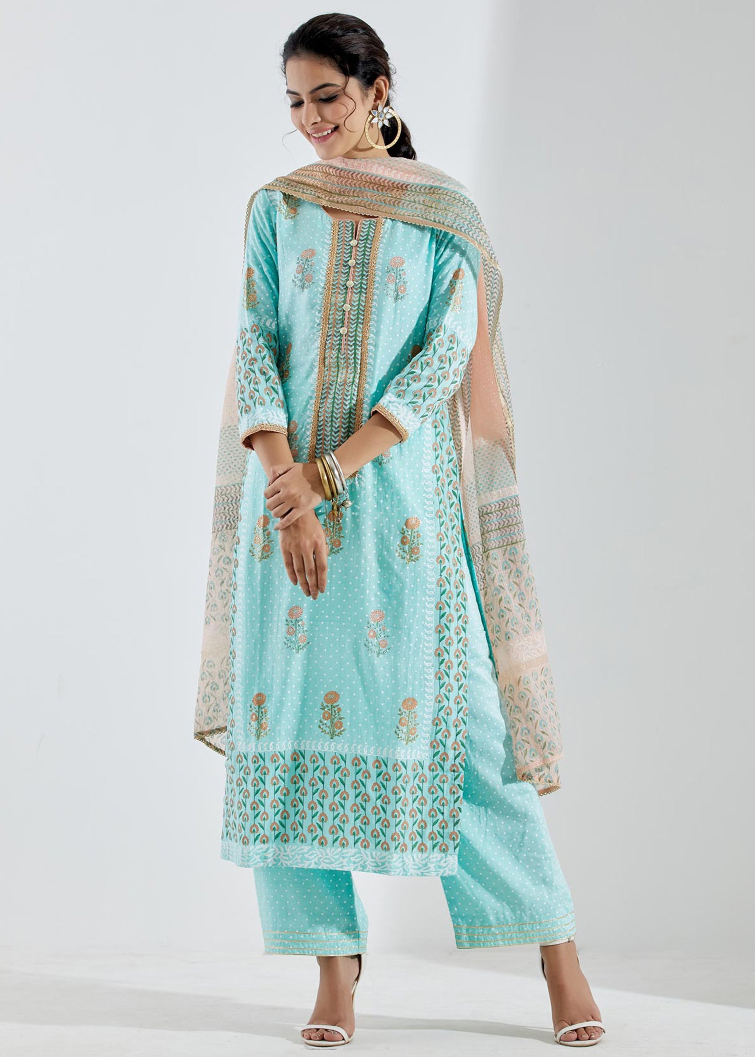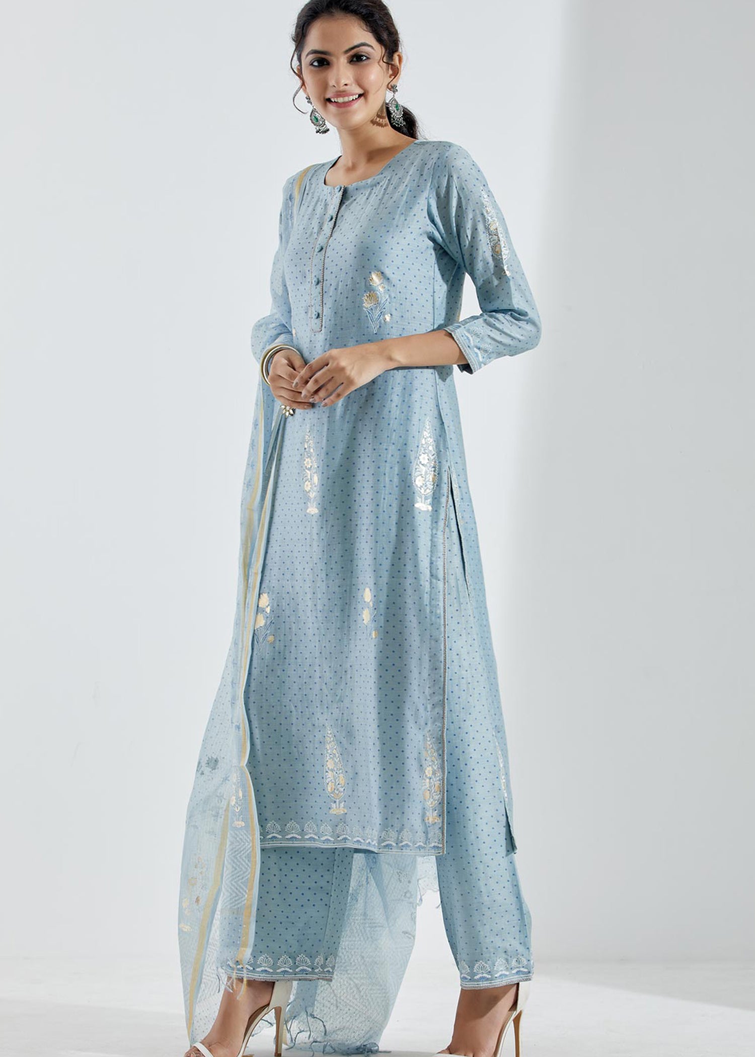 Printed Light Blue Kurti Set With Golden And Silver Floral Design