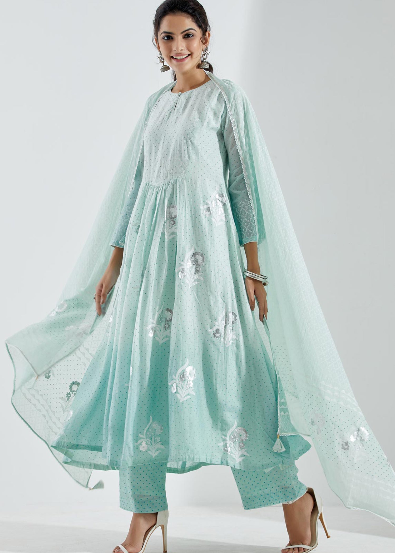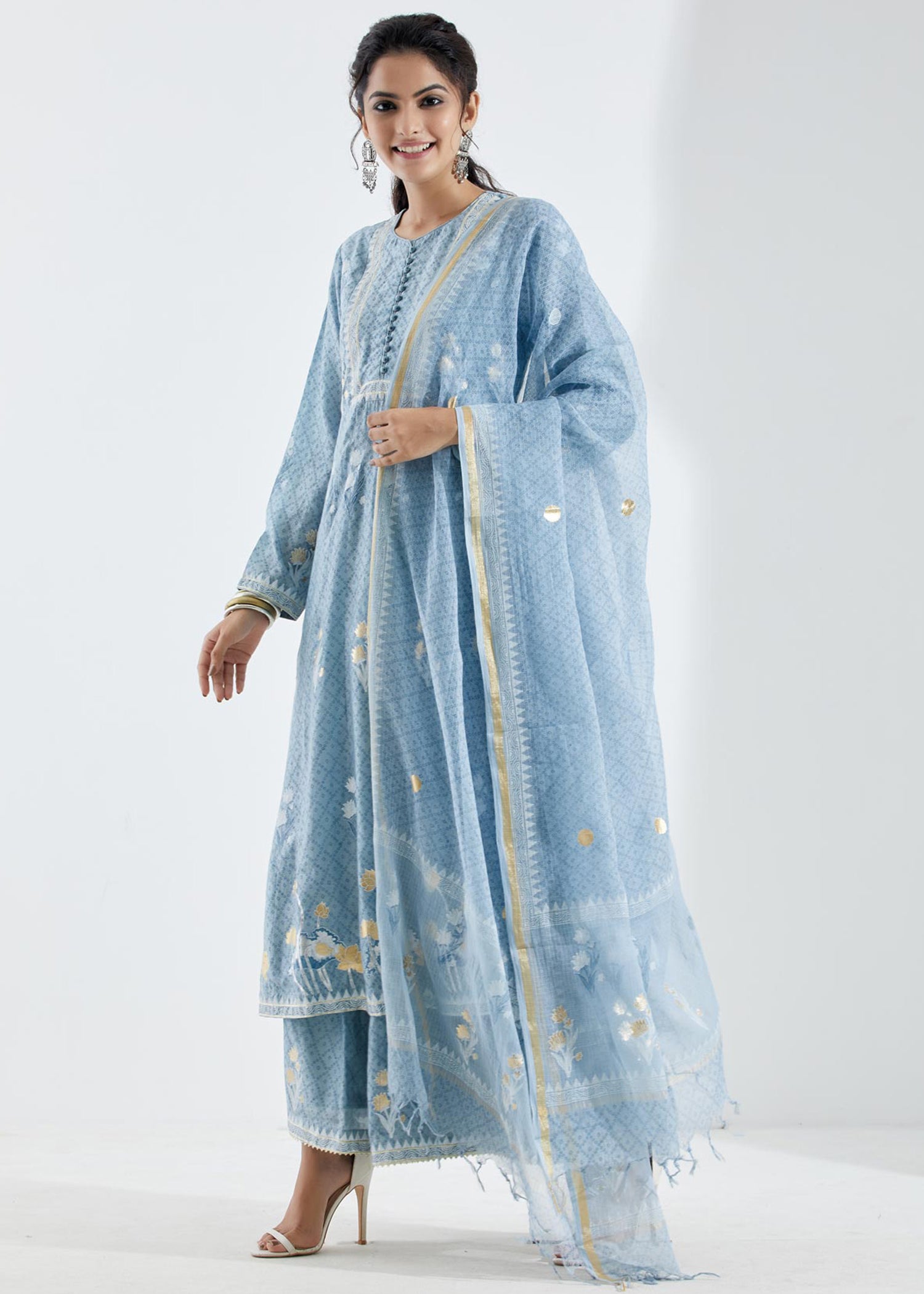 Printed Light Blue Cotton Silk Floral Anarkali Set