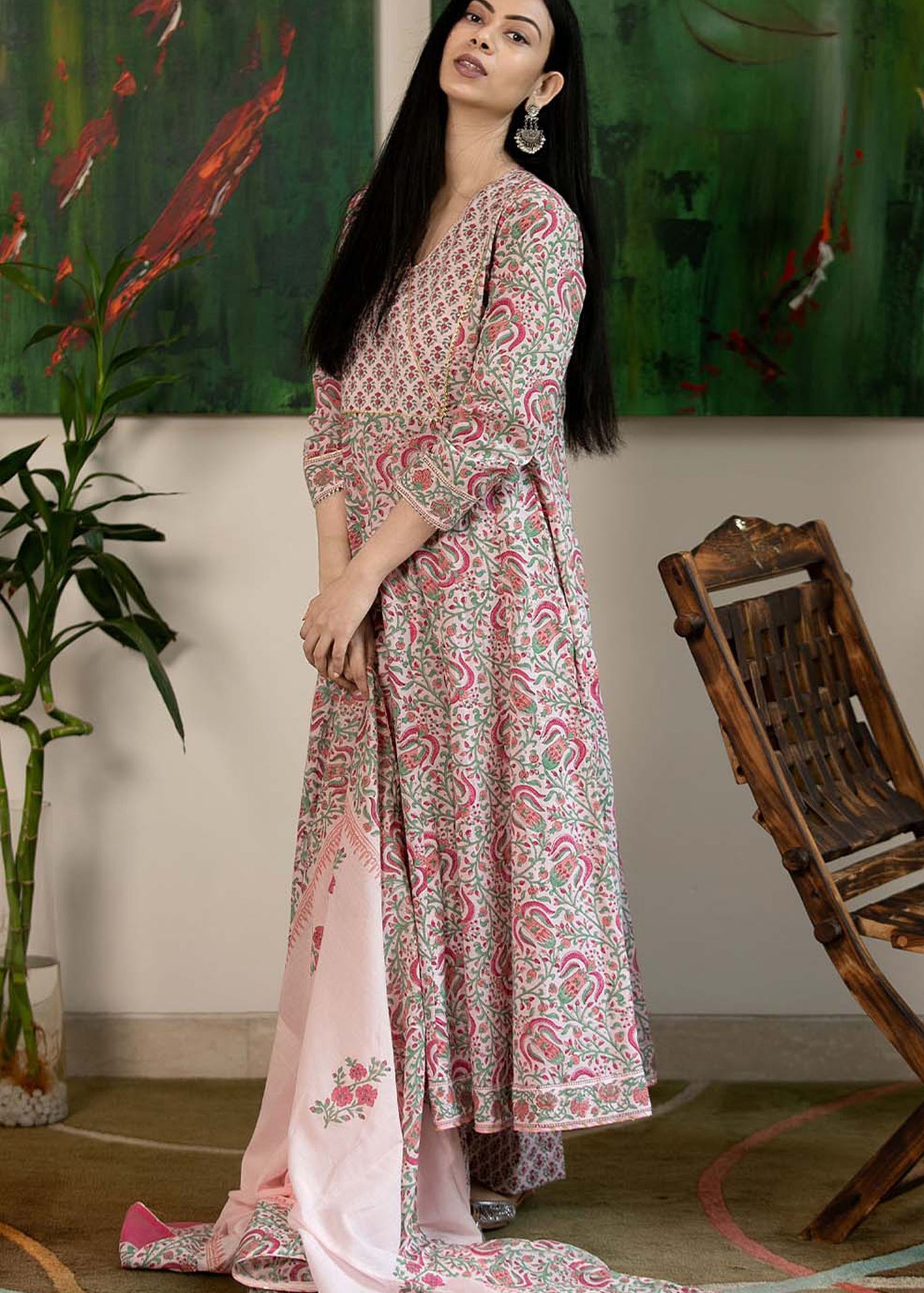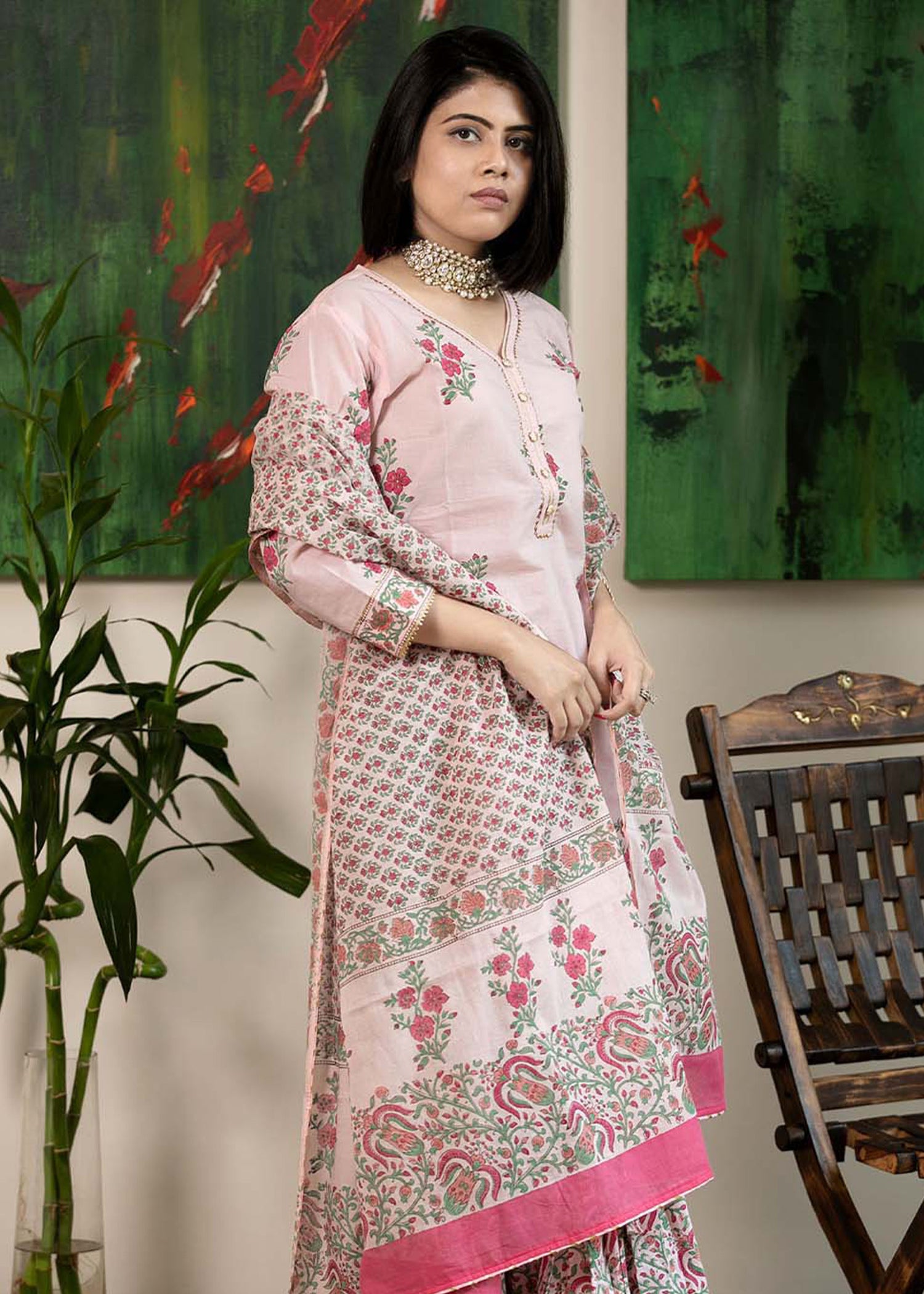 Block Printed Light Pink Cotton Suit Set With Floral Patterns