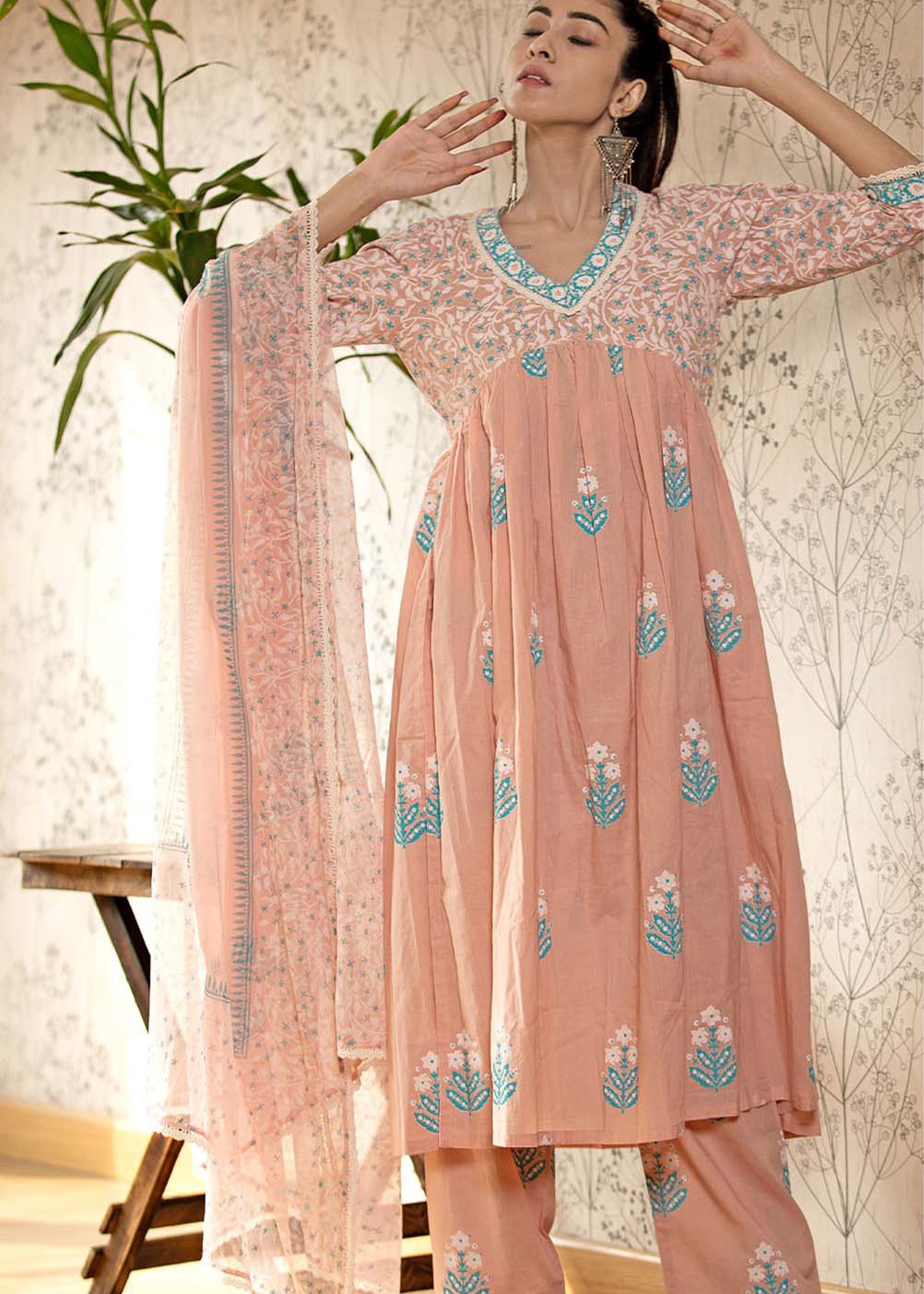 Bright Peach Block Printed Cotton Kurta Set With Floral Pattern