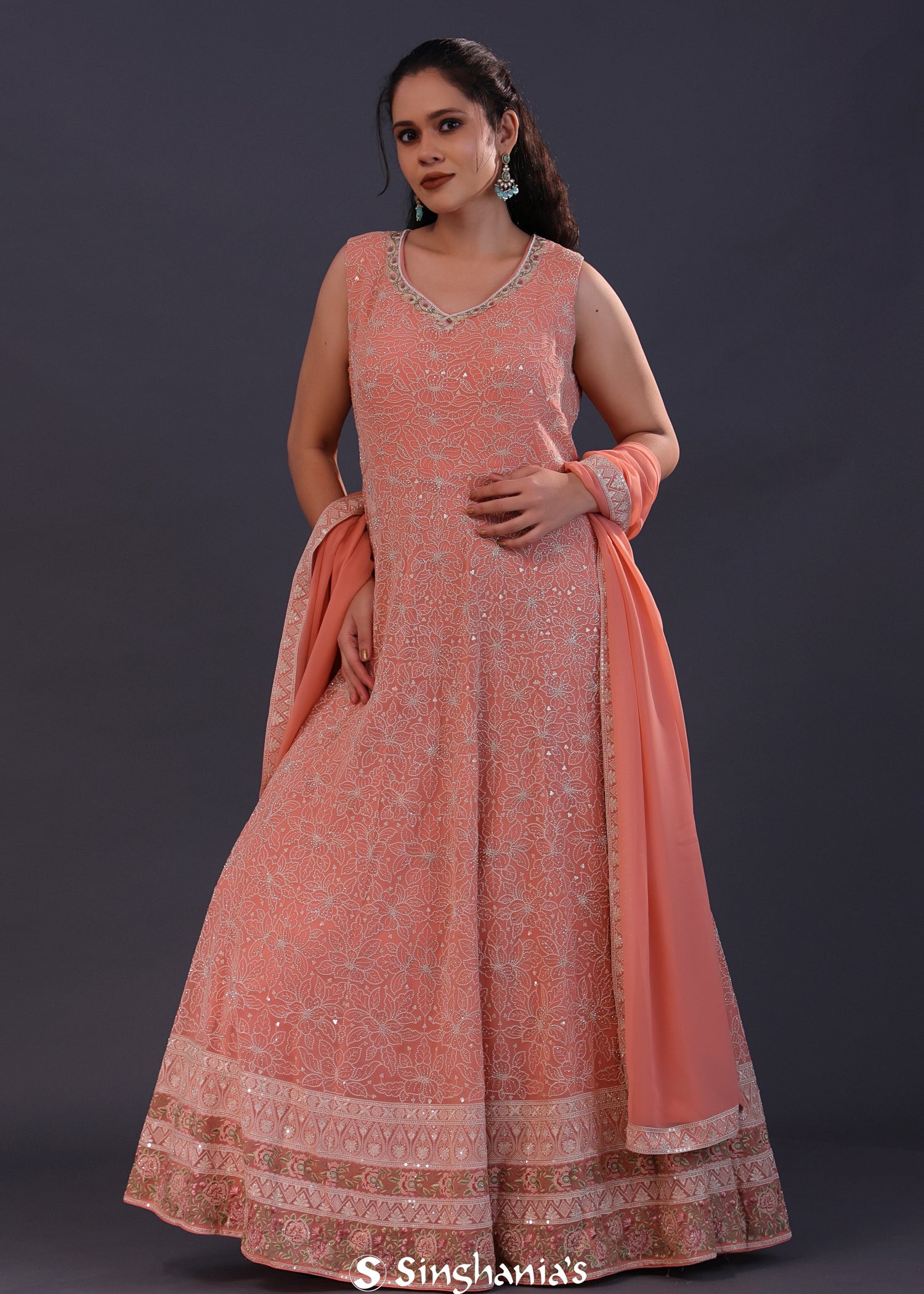 Peach Pink Chiffon Georgette Embroidered Anarkali Set