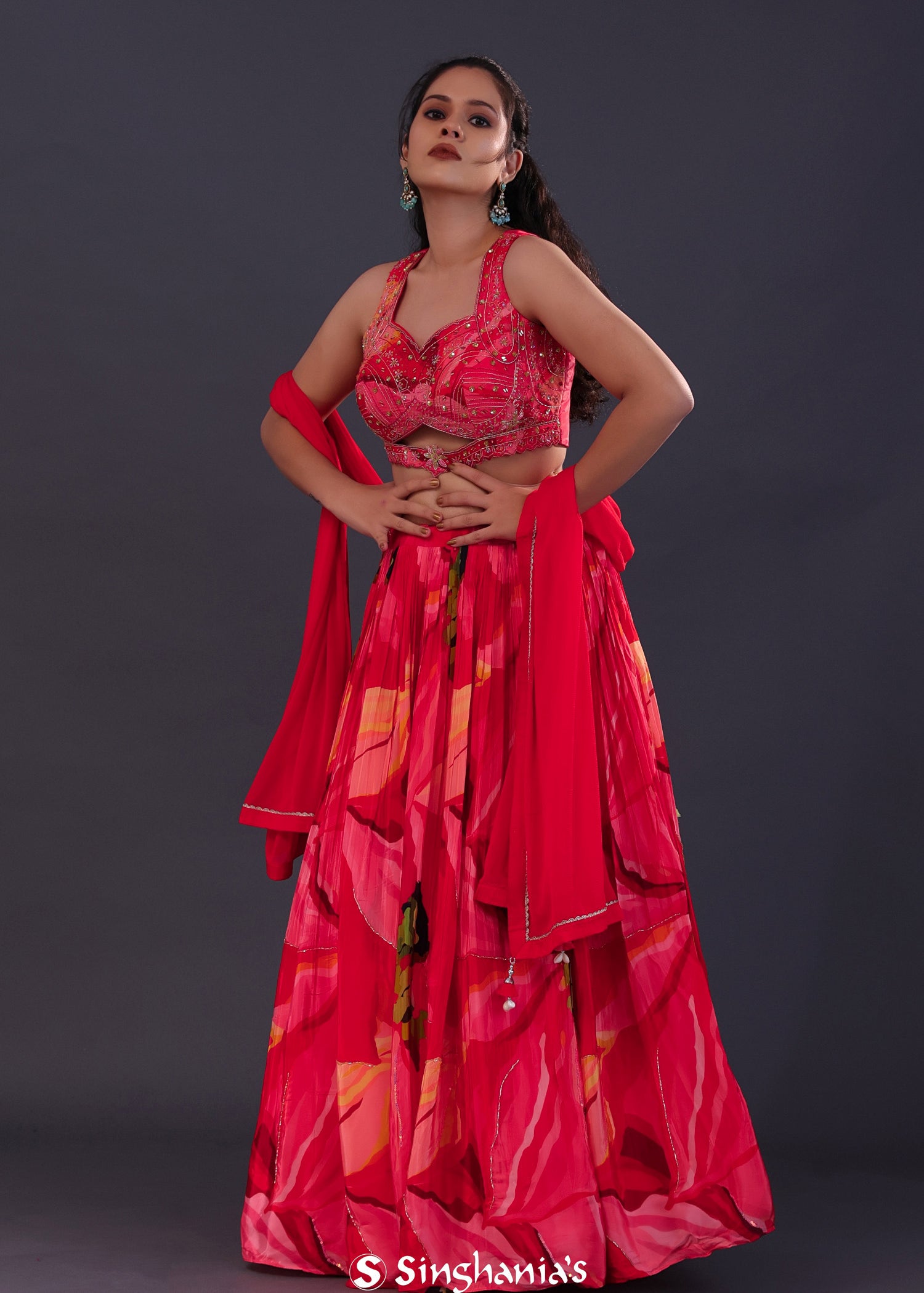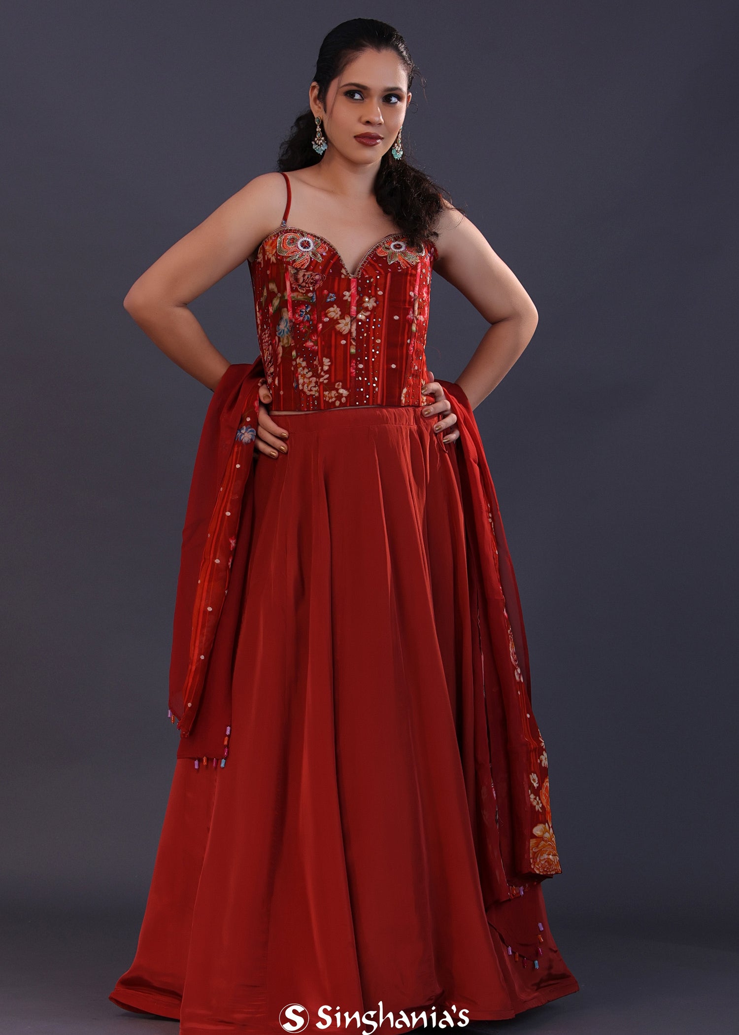 Ruby Red Satin Crepe Floral Printed Lehenga Set