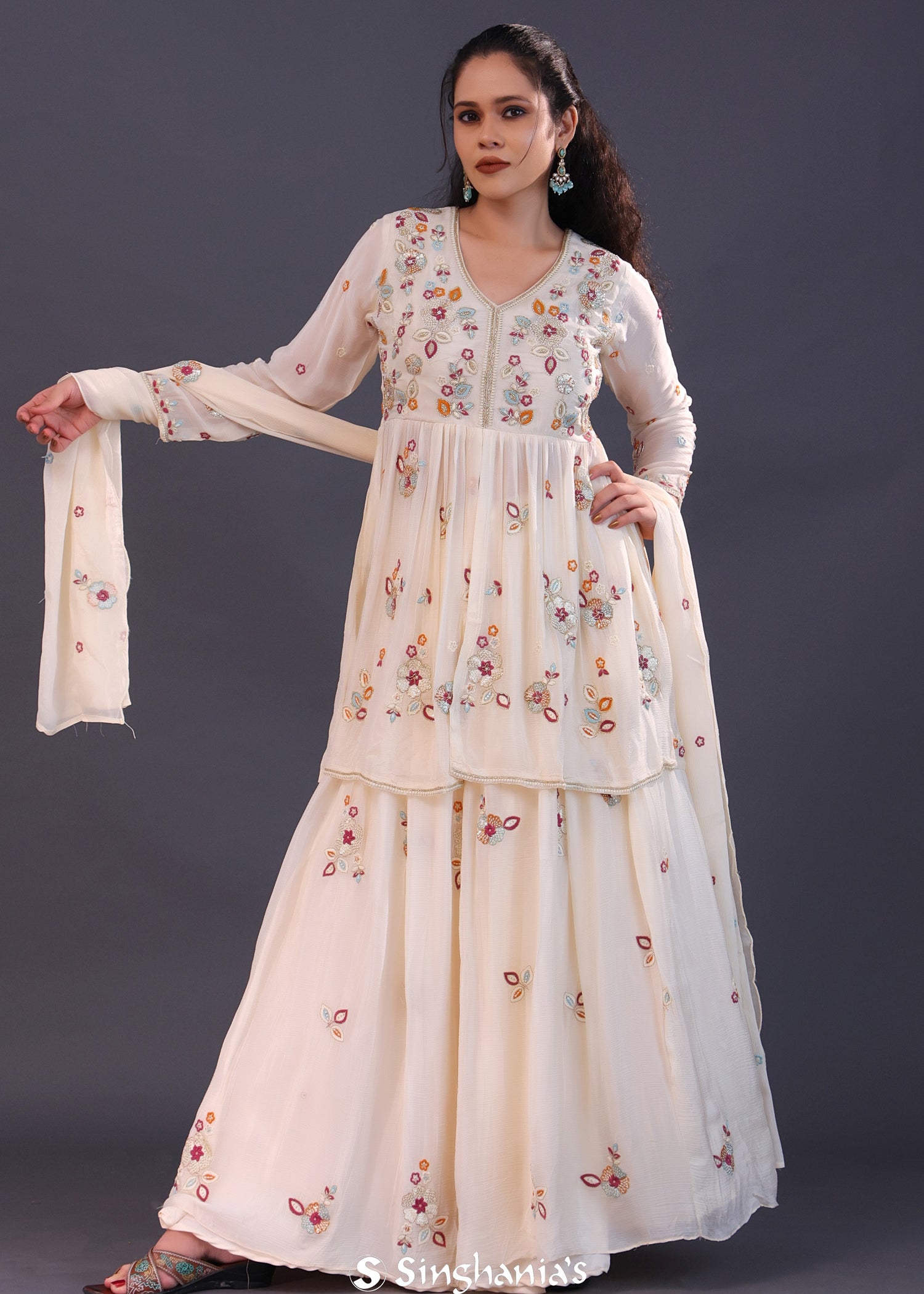 White Chiffon Georgette Thread Embroidered Kurti Set