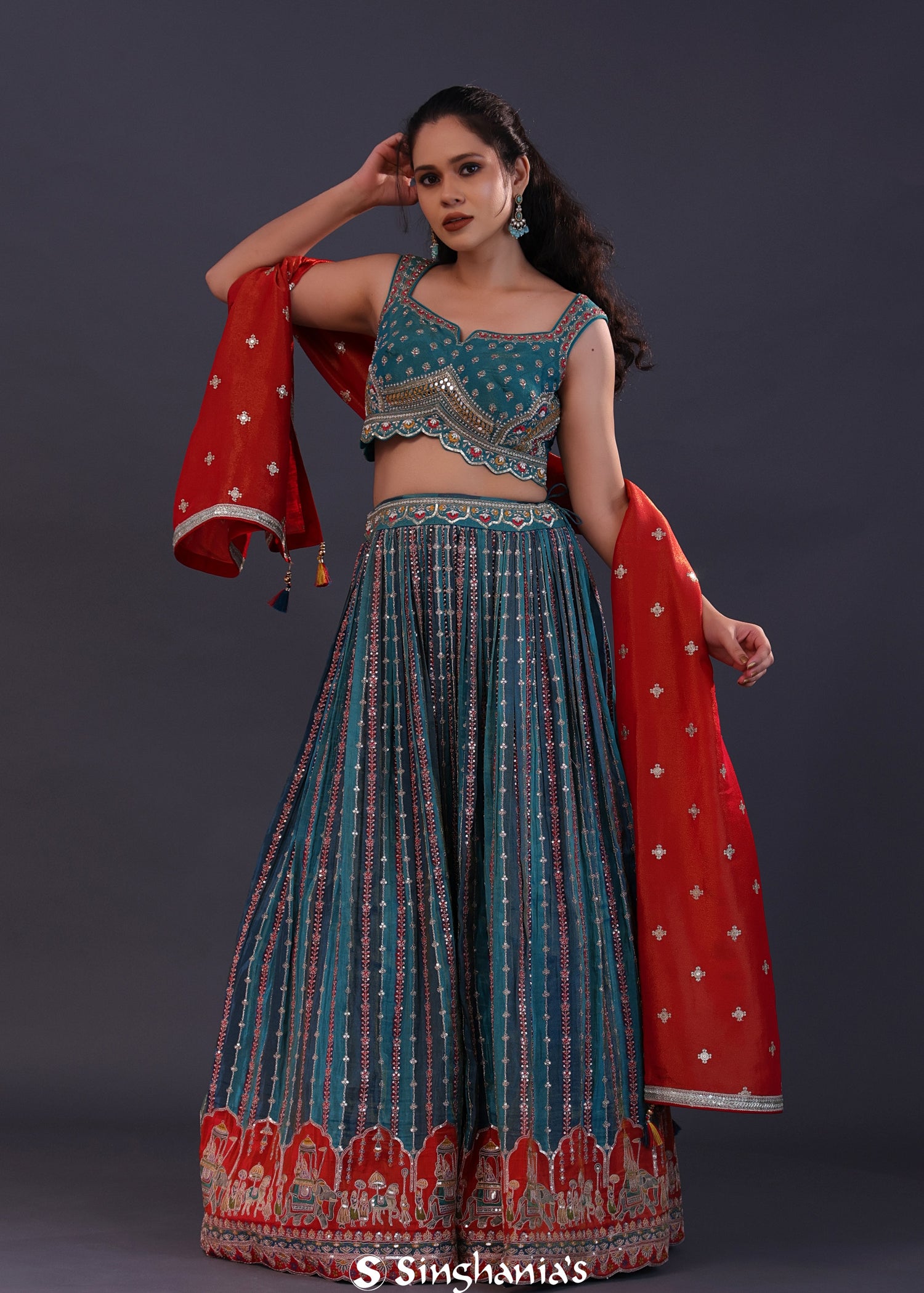 Emerald Green Chinon Silk Embroidered Lehenga Set