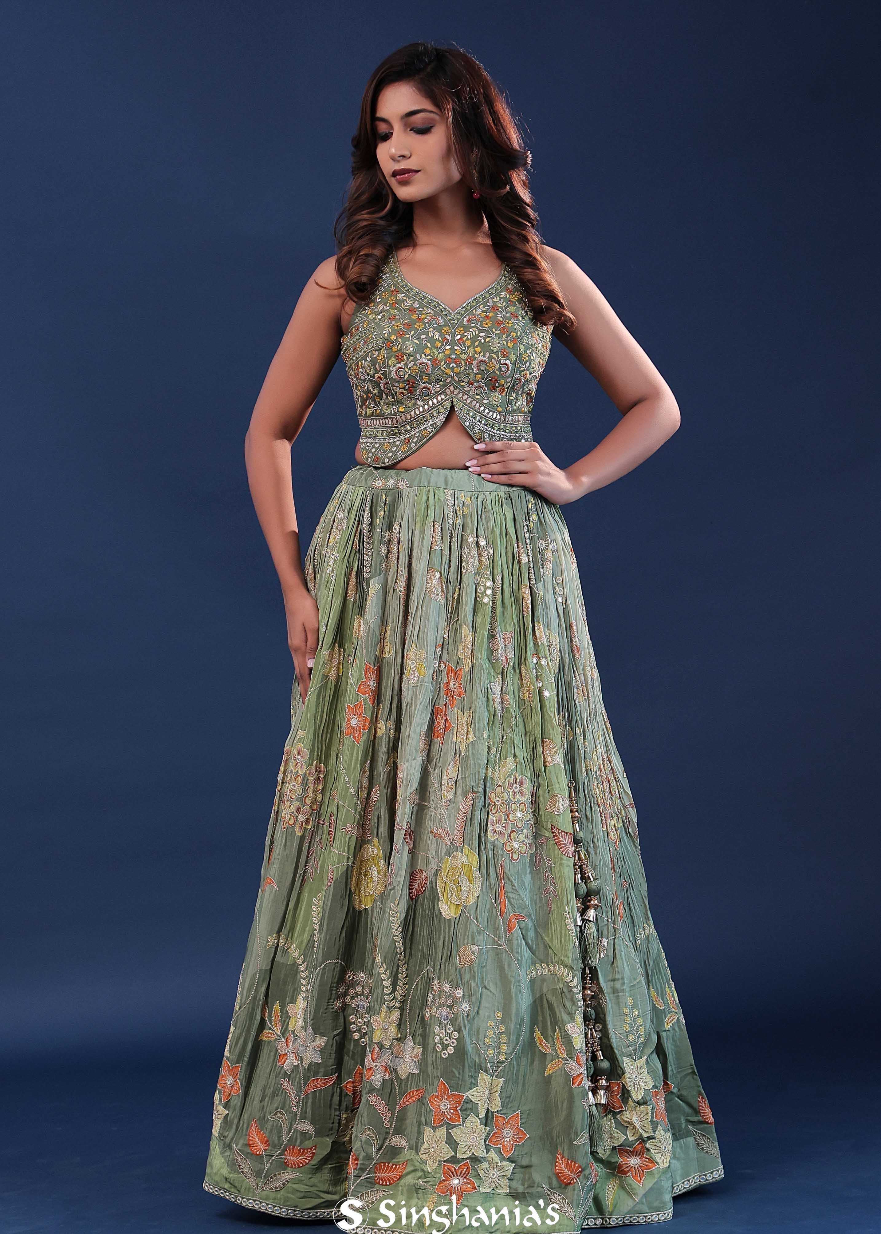 Pista Green Chinon Georgette Crush Lehenga Set