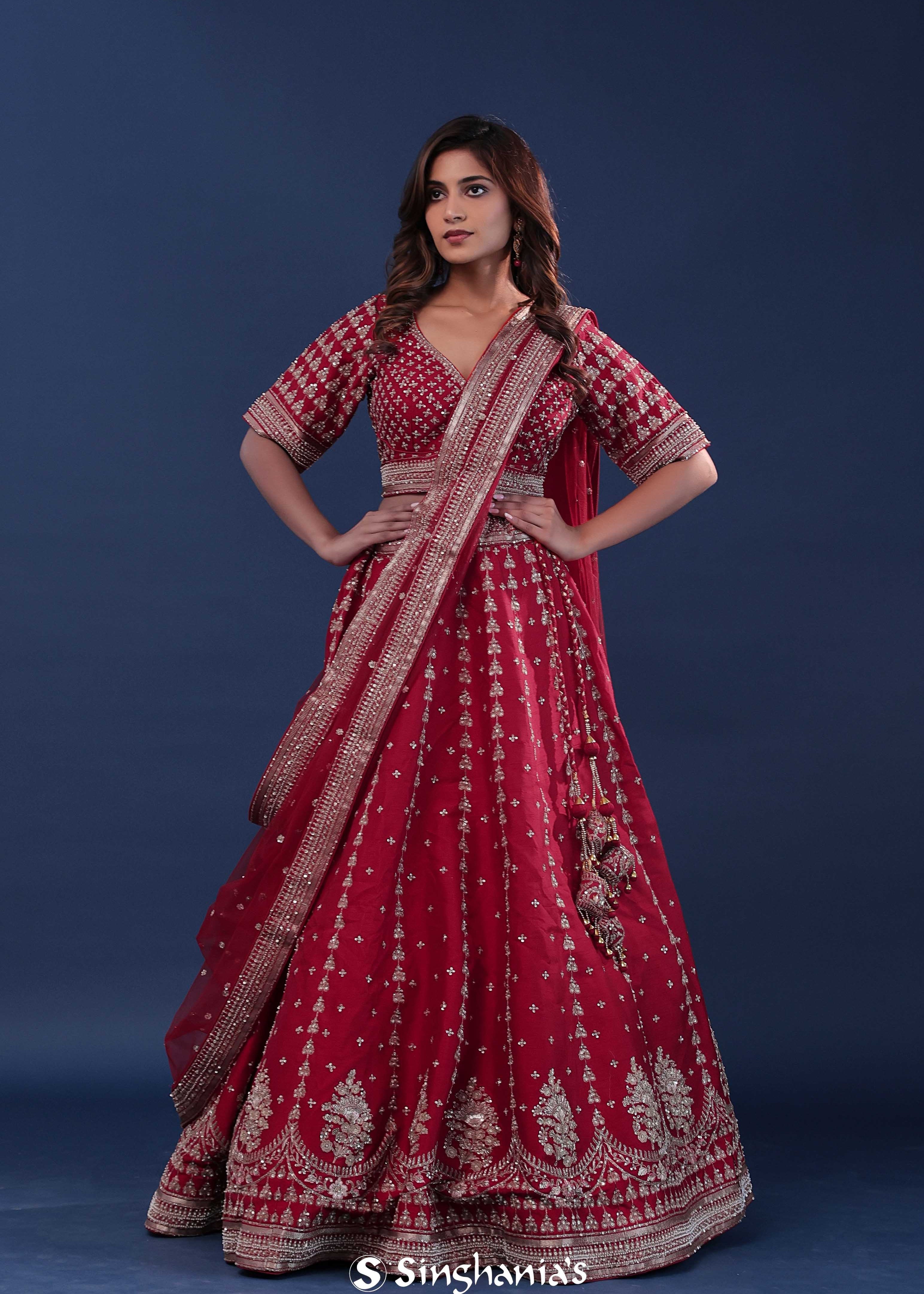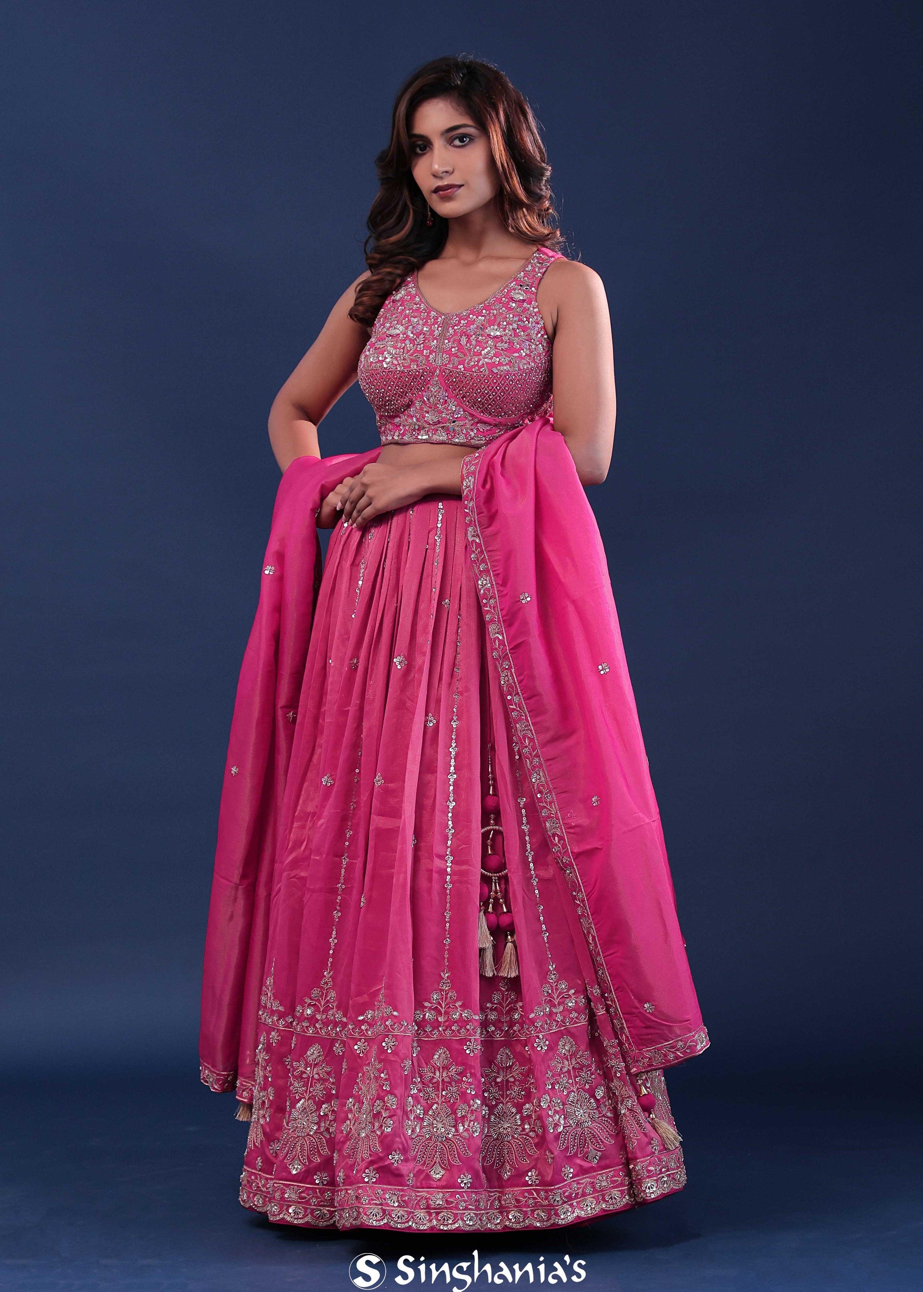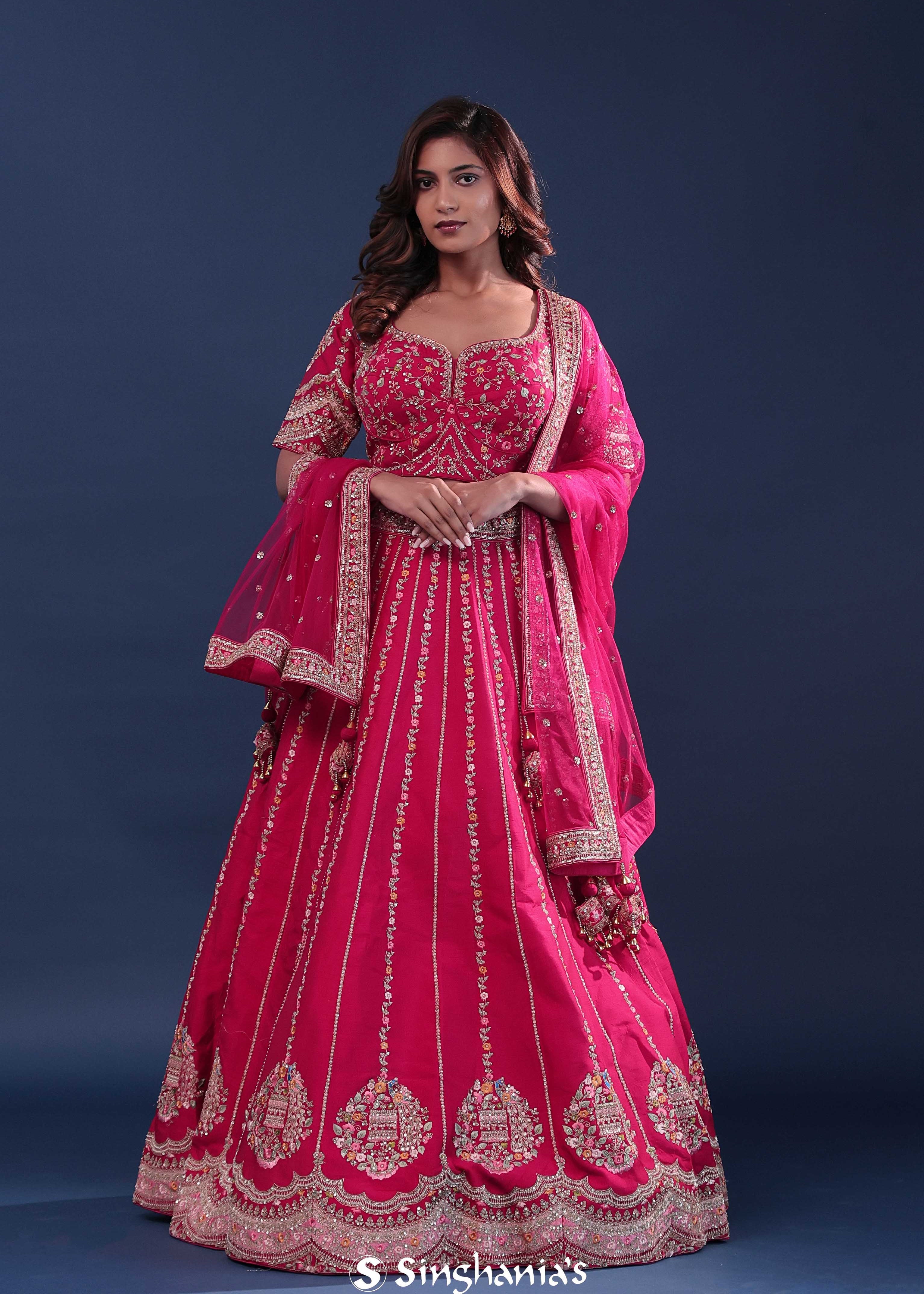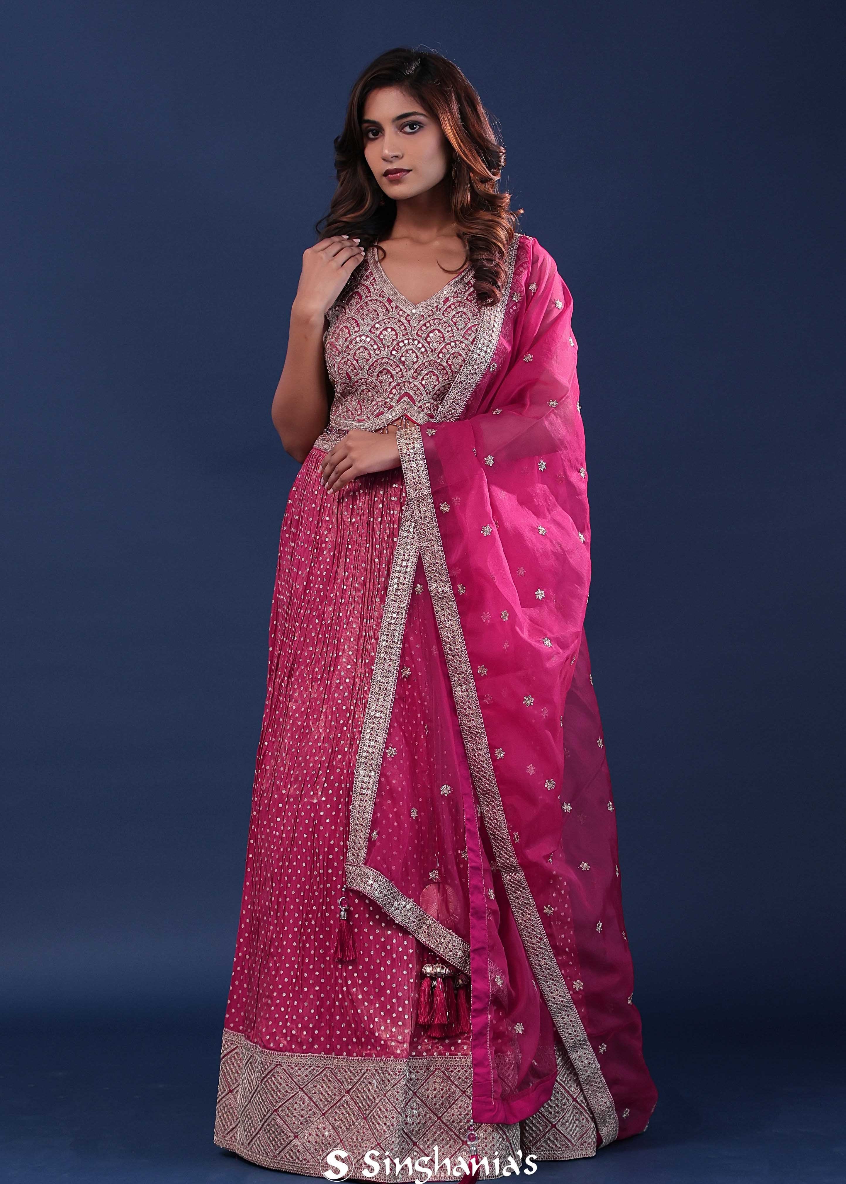 Deep Pink Silk Lehenga Set With Net Dupatta