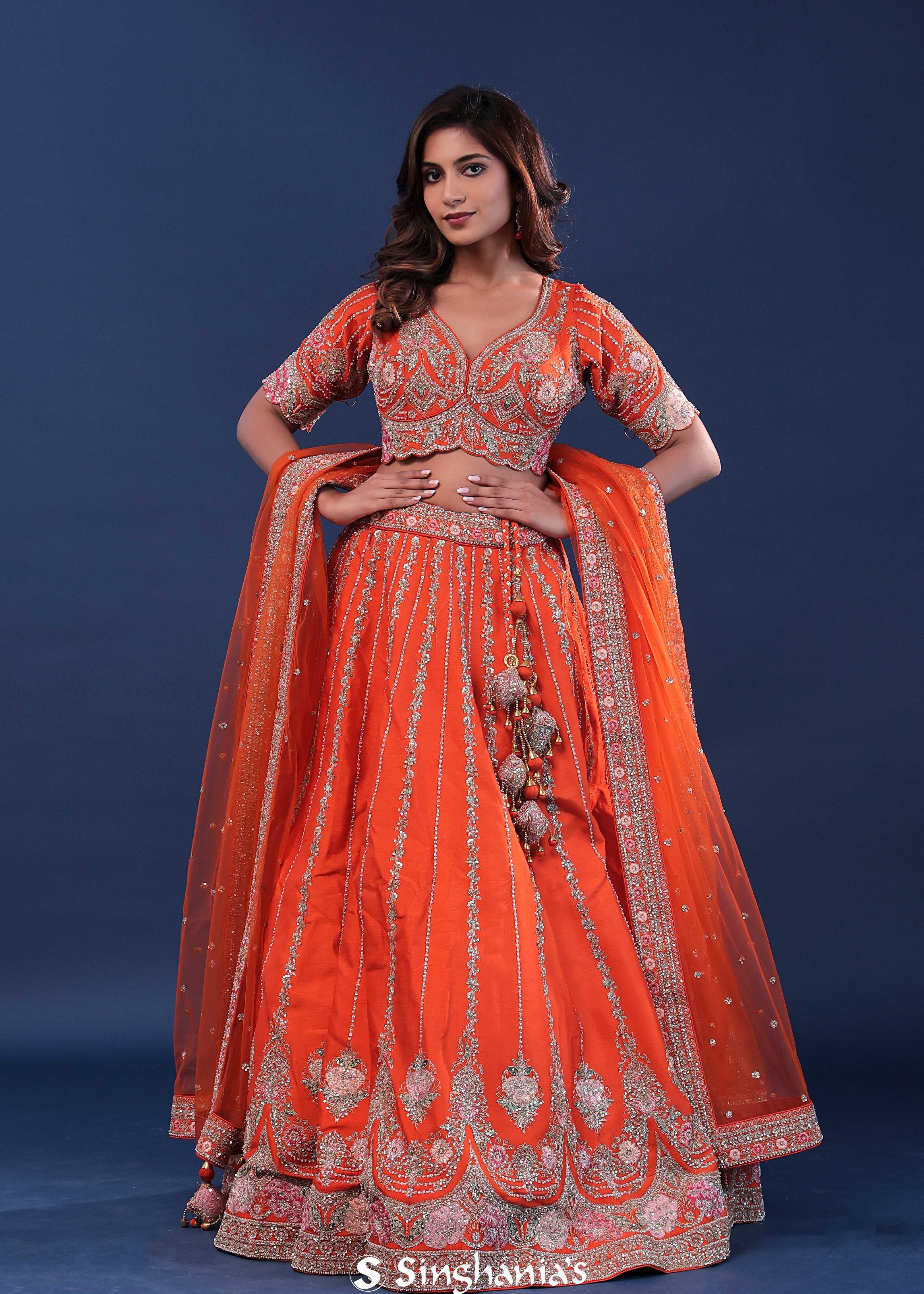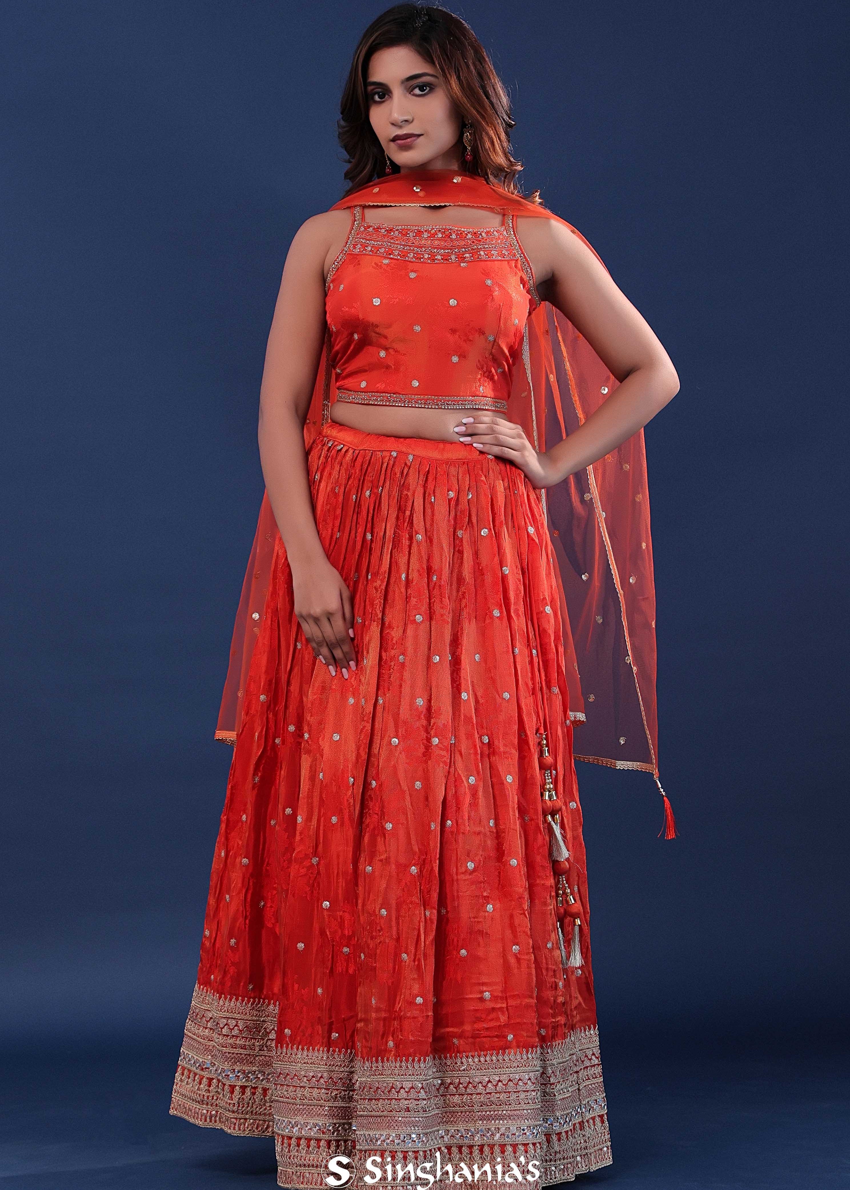 International Orange Organza Lehenga Set With Net Dupatta