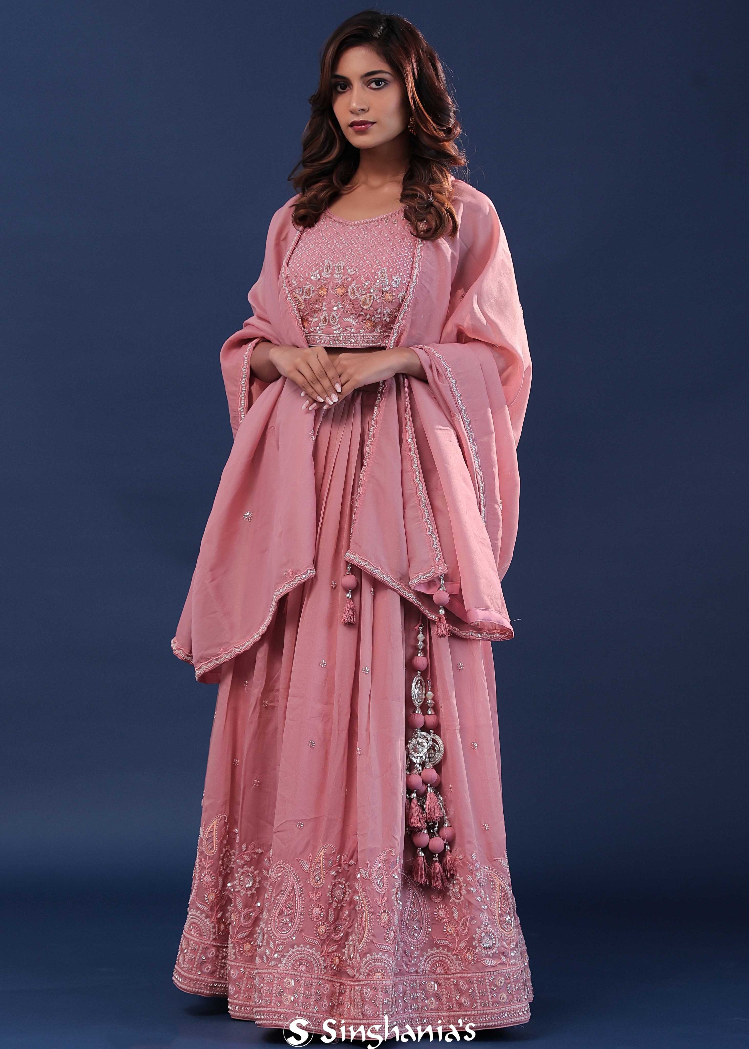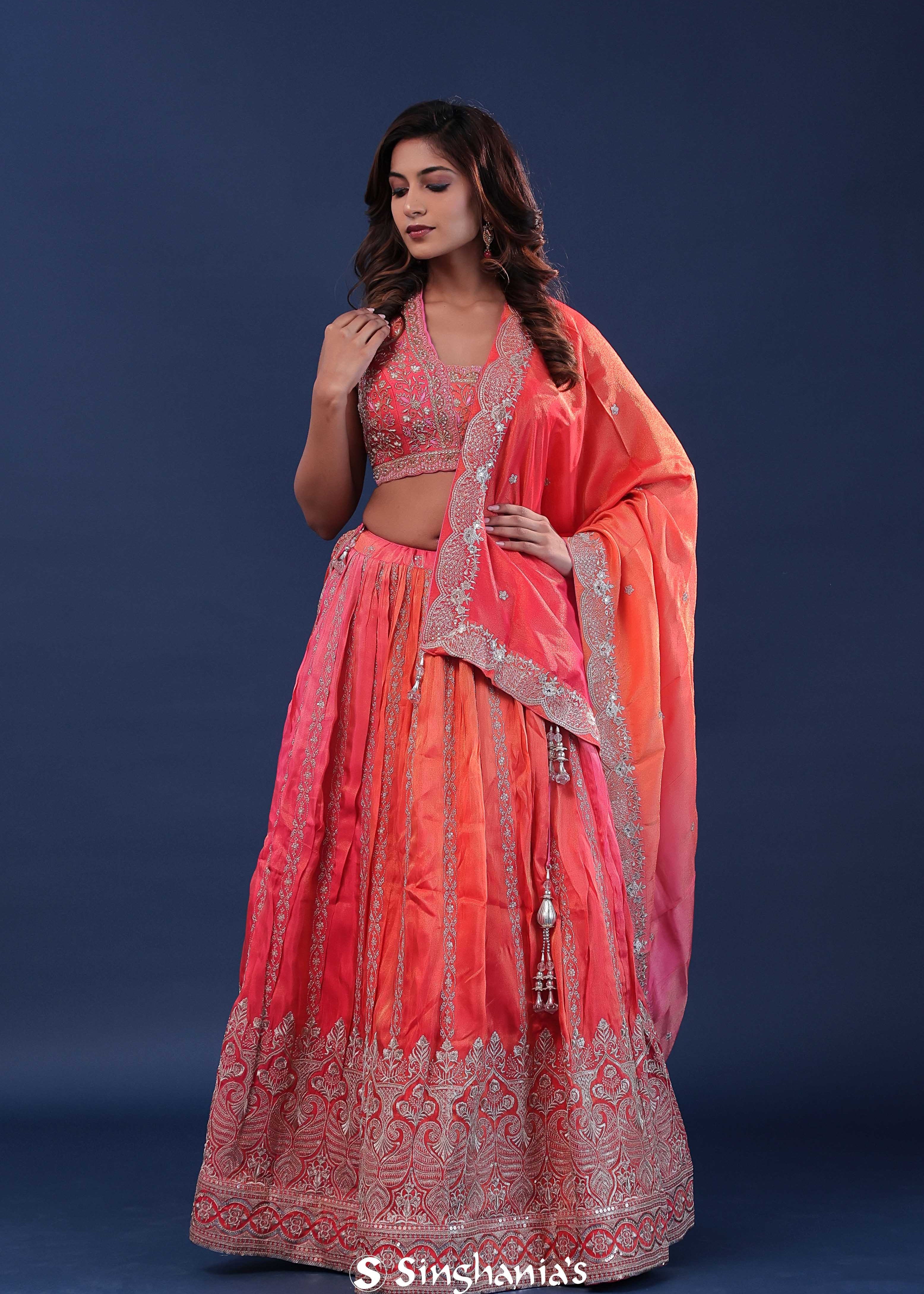 Coral Pink Silk Lehenga Set With Organga Dupatta