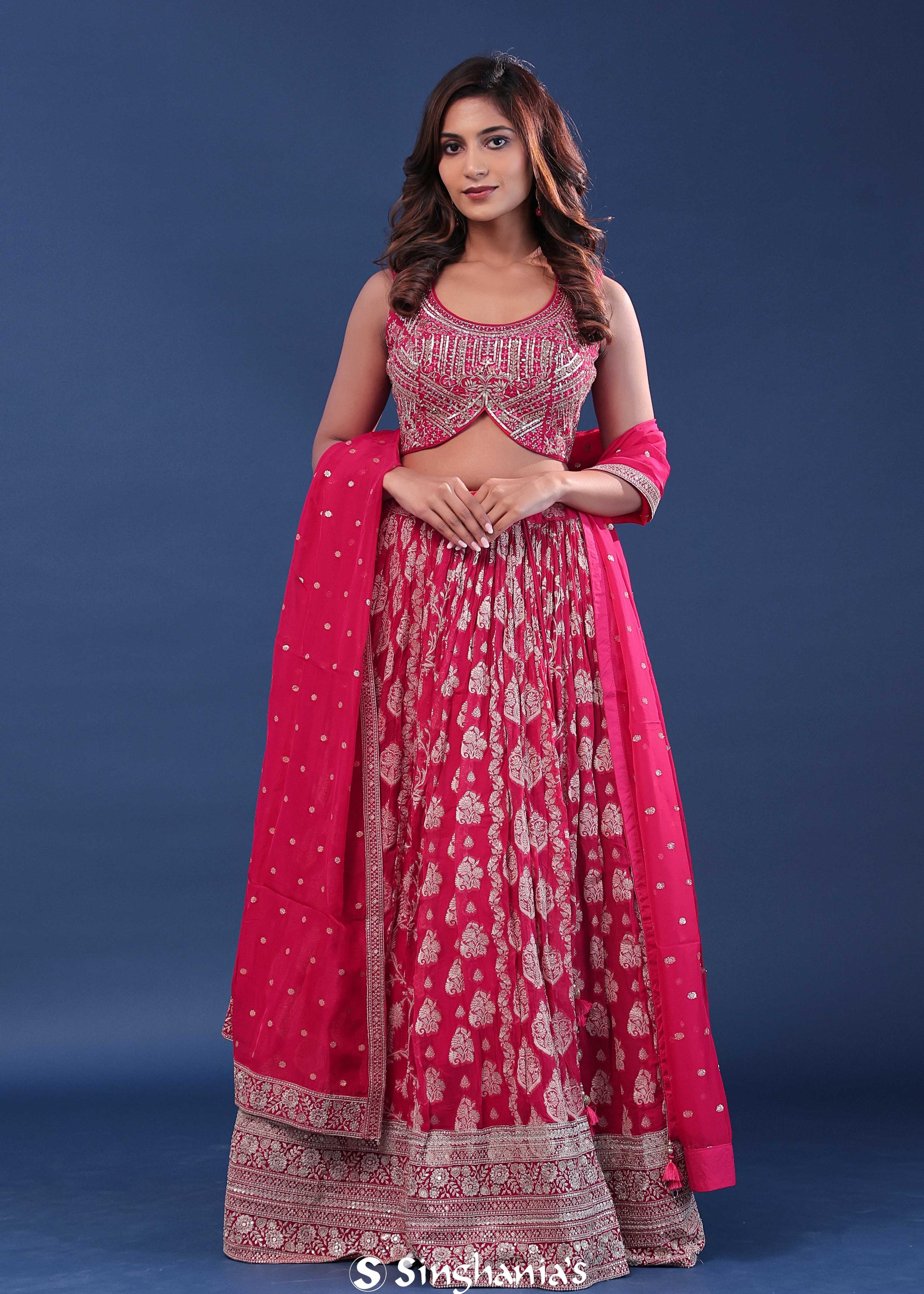 Magenta Pink Banarasi Lehenga Set With Organza Dupatta