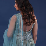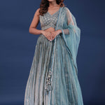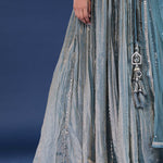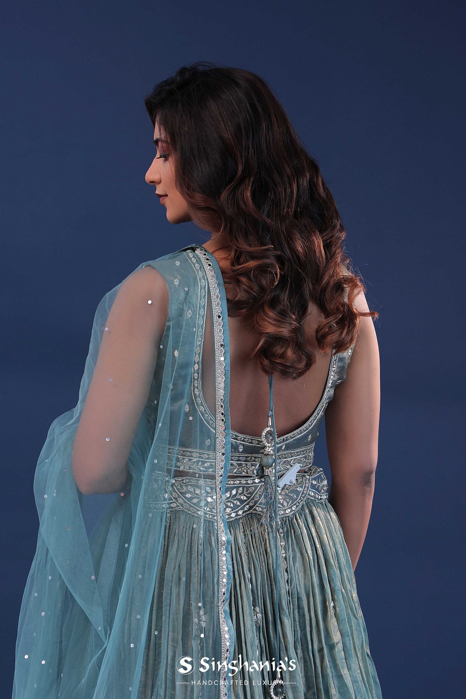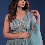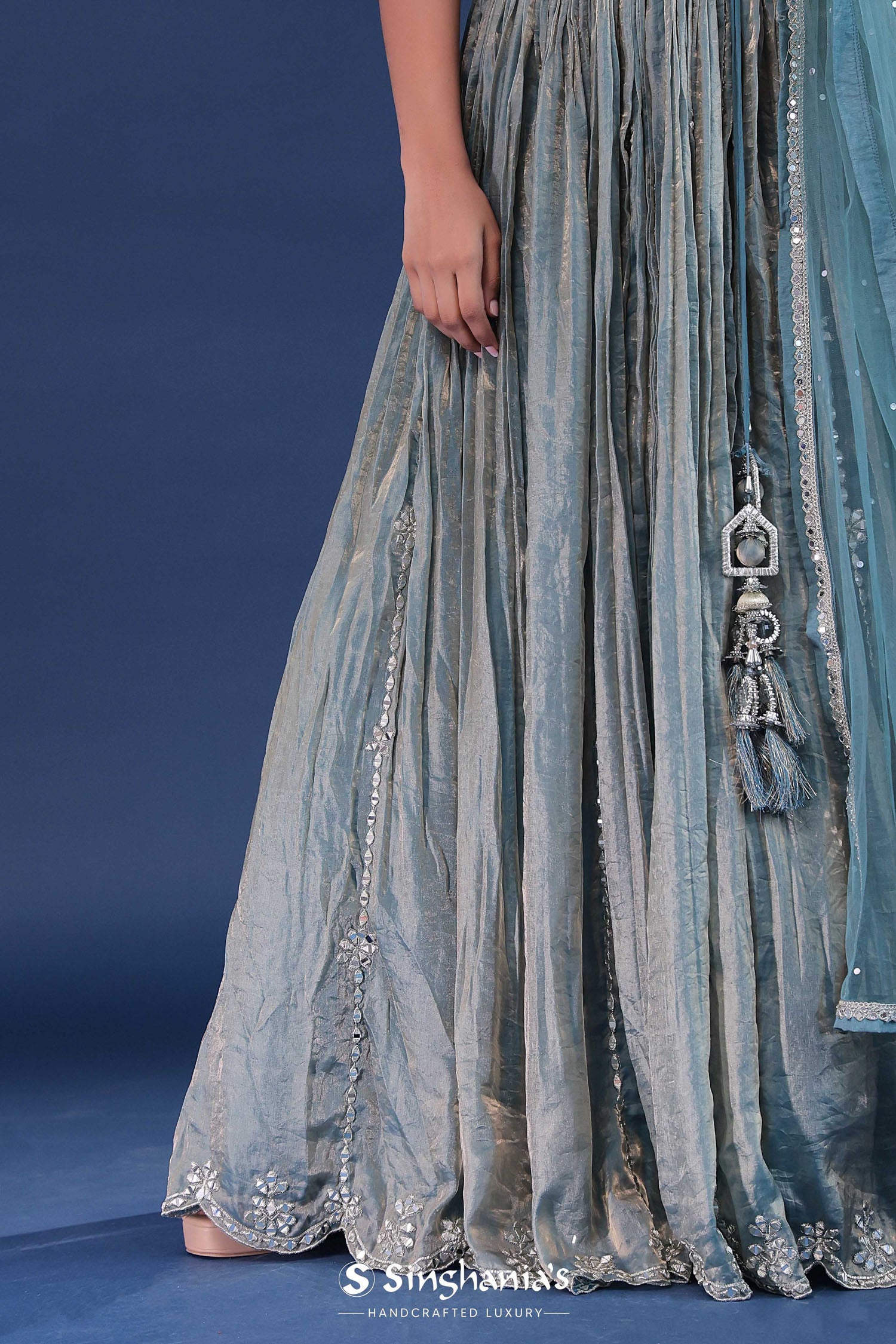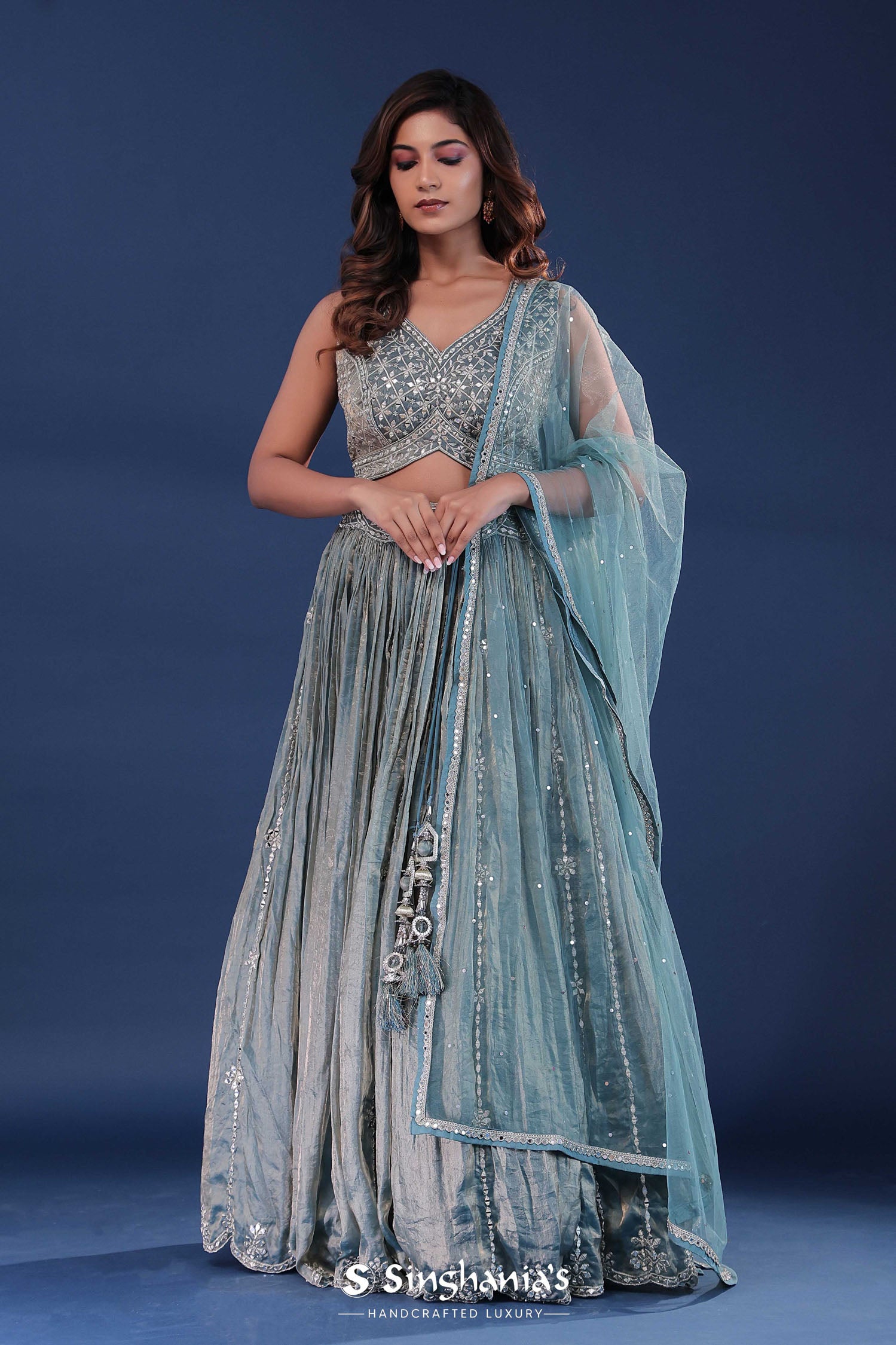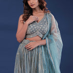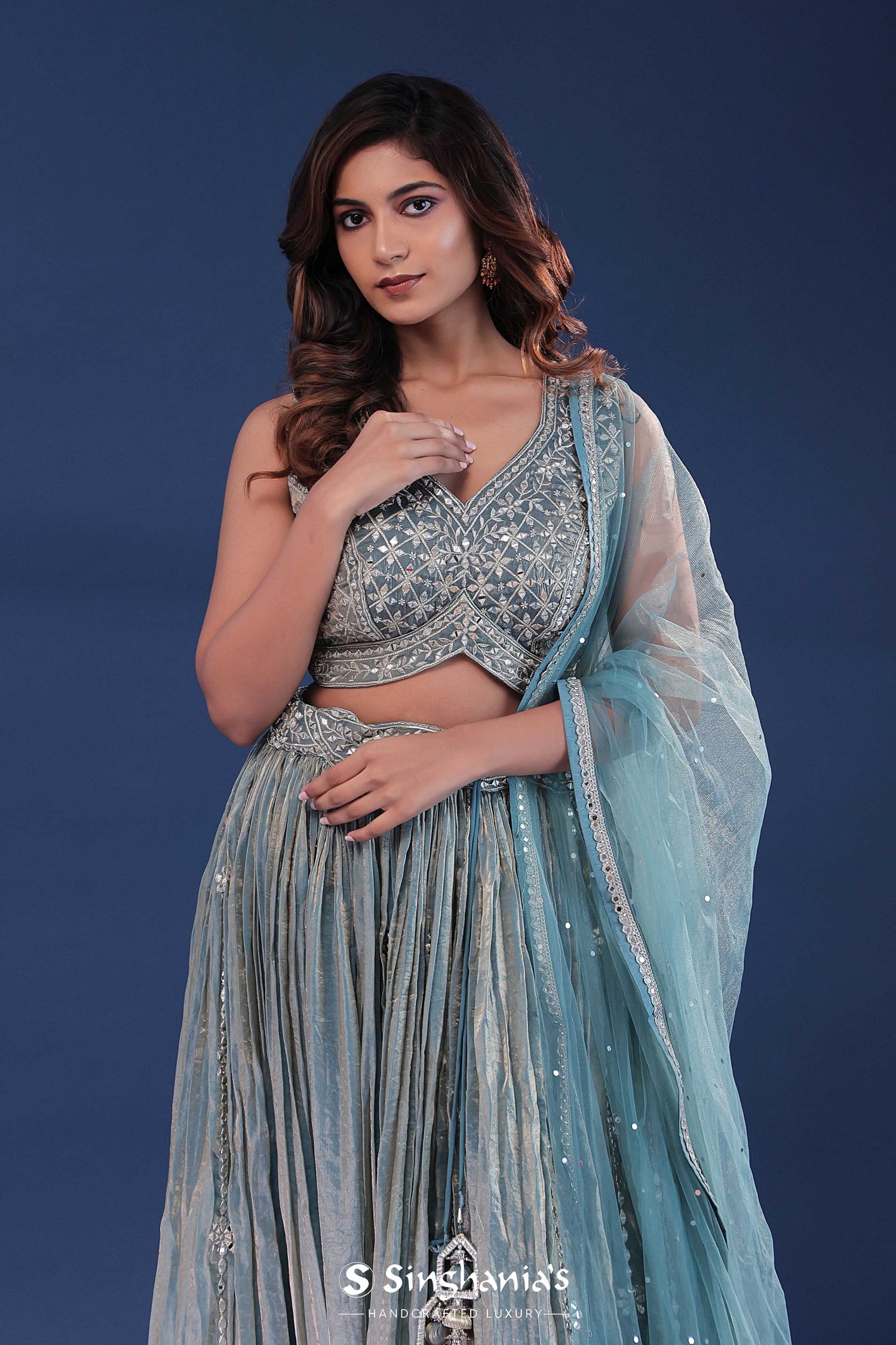 Baby blue organza lehenga set features V neckline soft silk blouse adorned with mirror work along with lehenga embellished with simple mirror work . The dupatta is adorned with butti's accompanied with small width border .