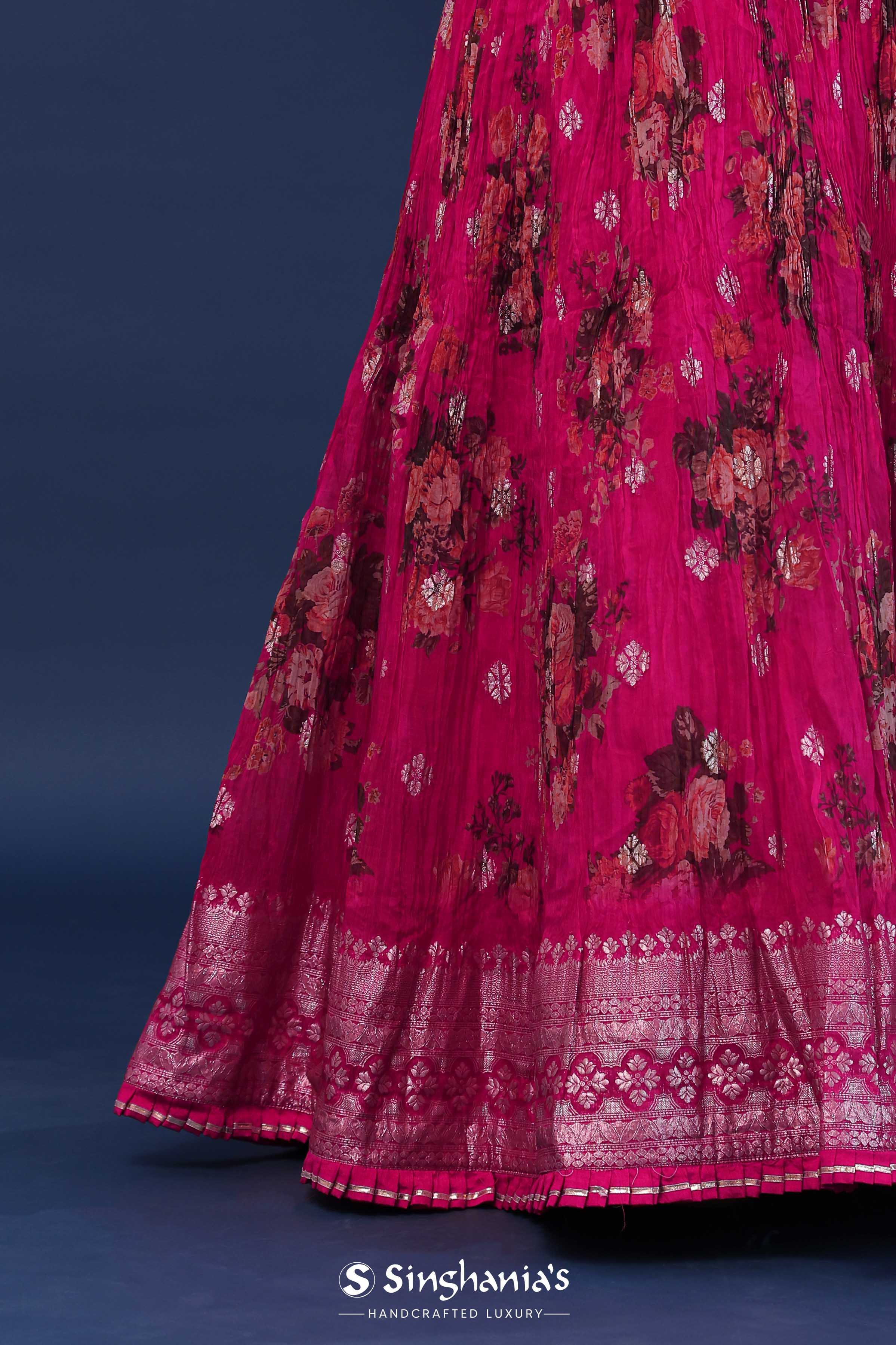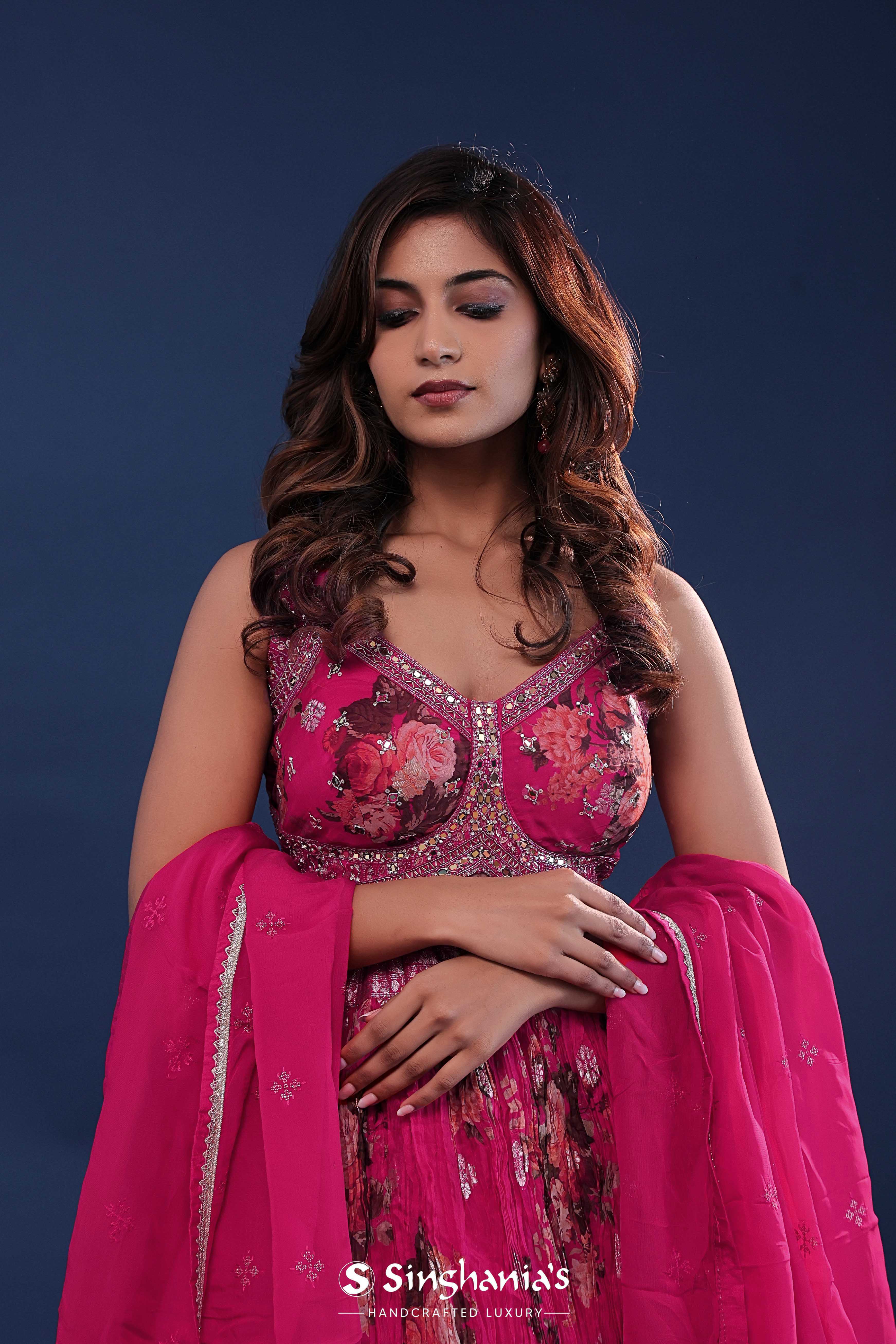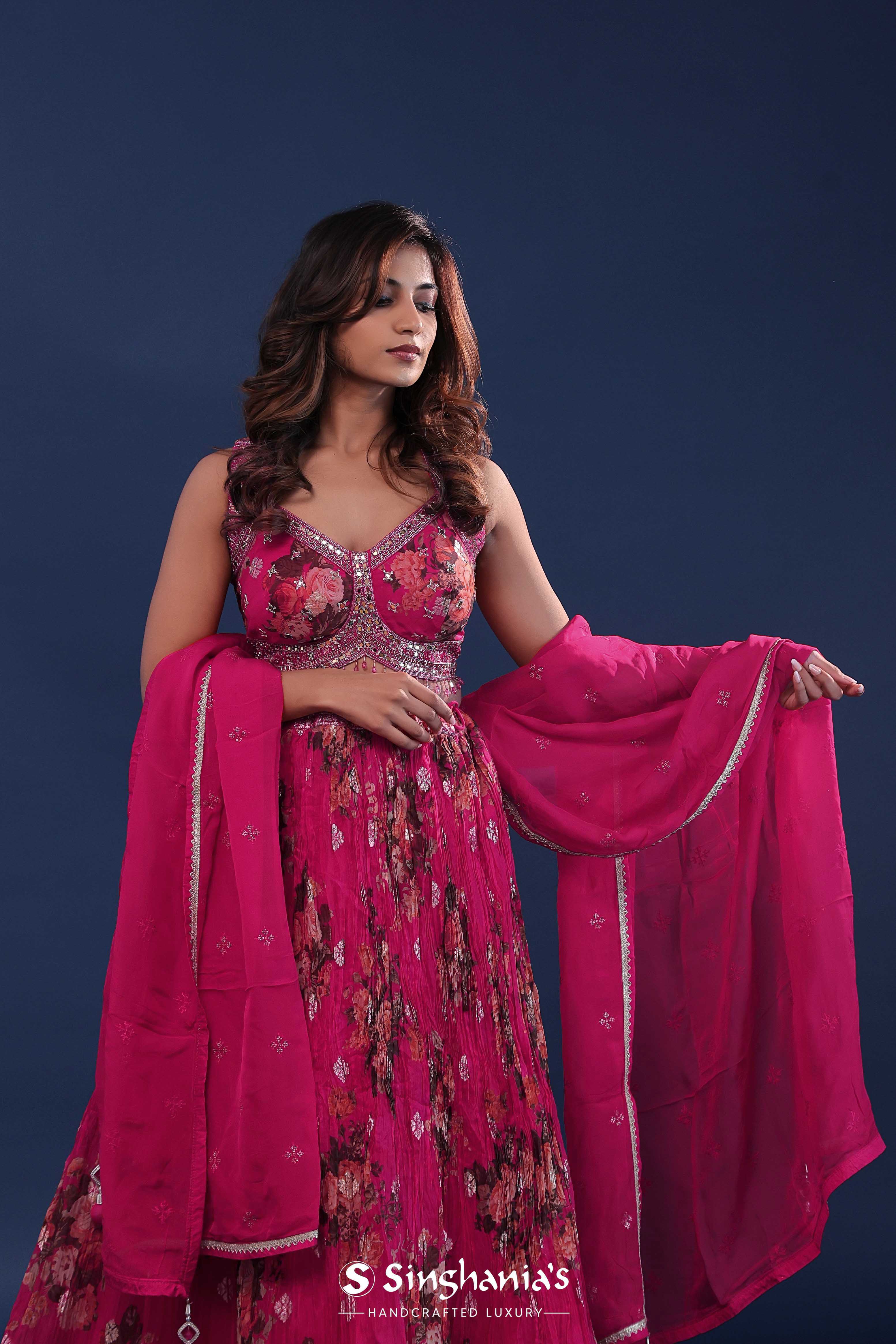 Barbie pink chinon georgette crush lehenga set features soft silk blouse which is rose prints of red,pink and white shades adorned with sequins,kardana and beaded work on V neckline and trim along the hem includes small hanging bead details. The look is completed by the dupatta which is embellished with butti's scattered all across the fabric along with small contrast border