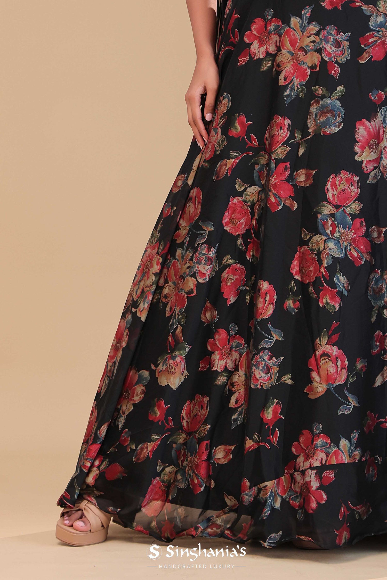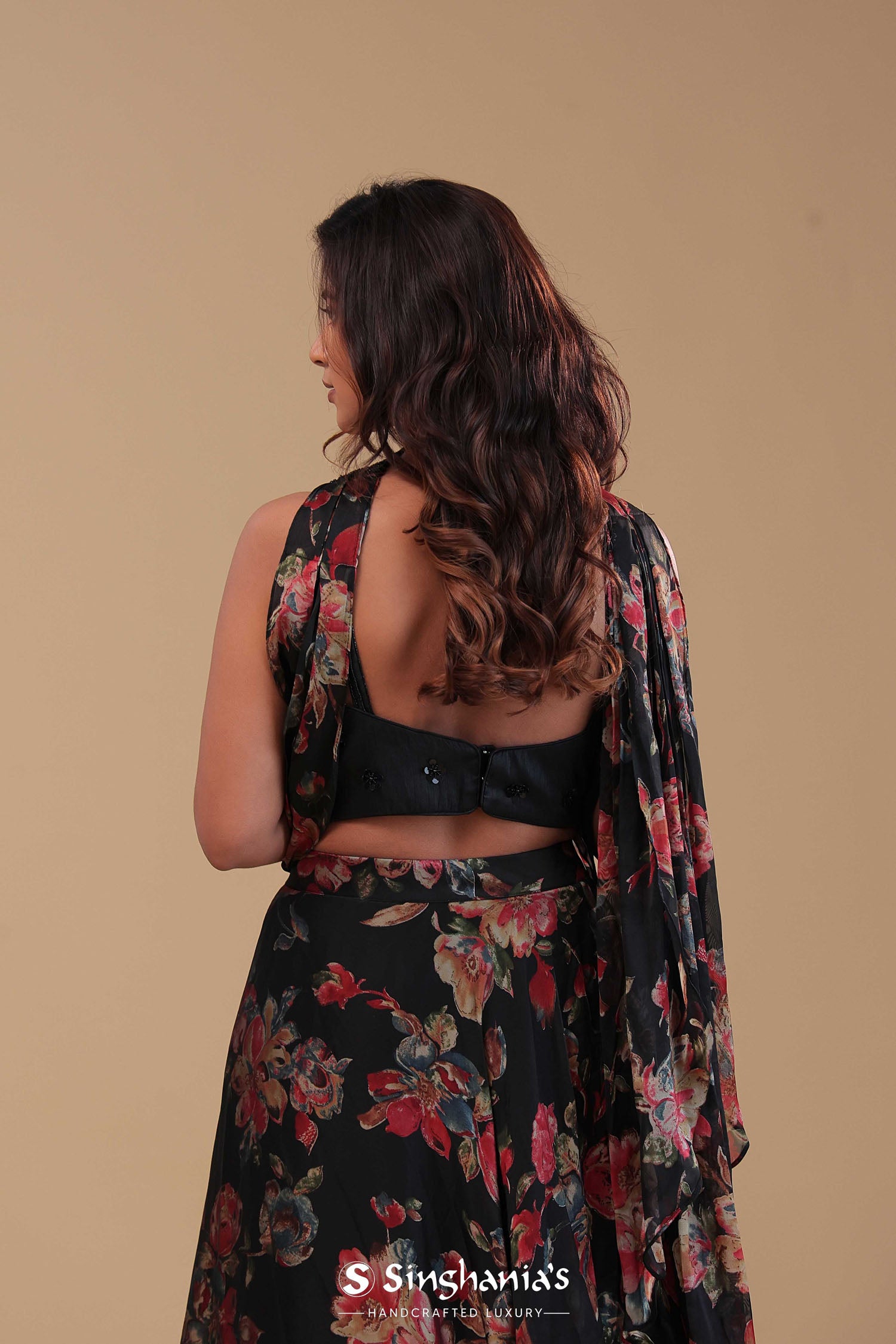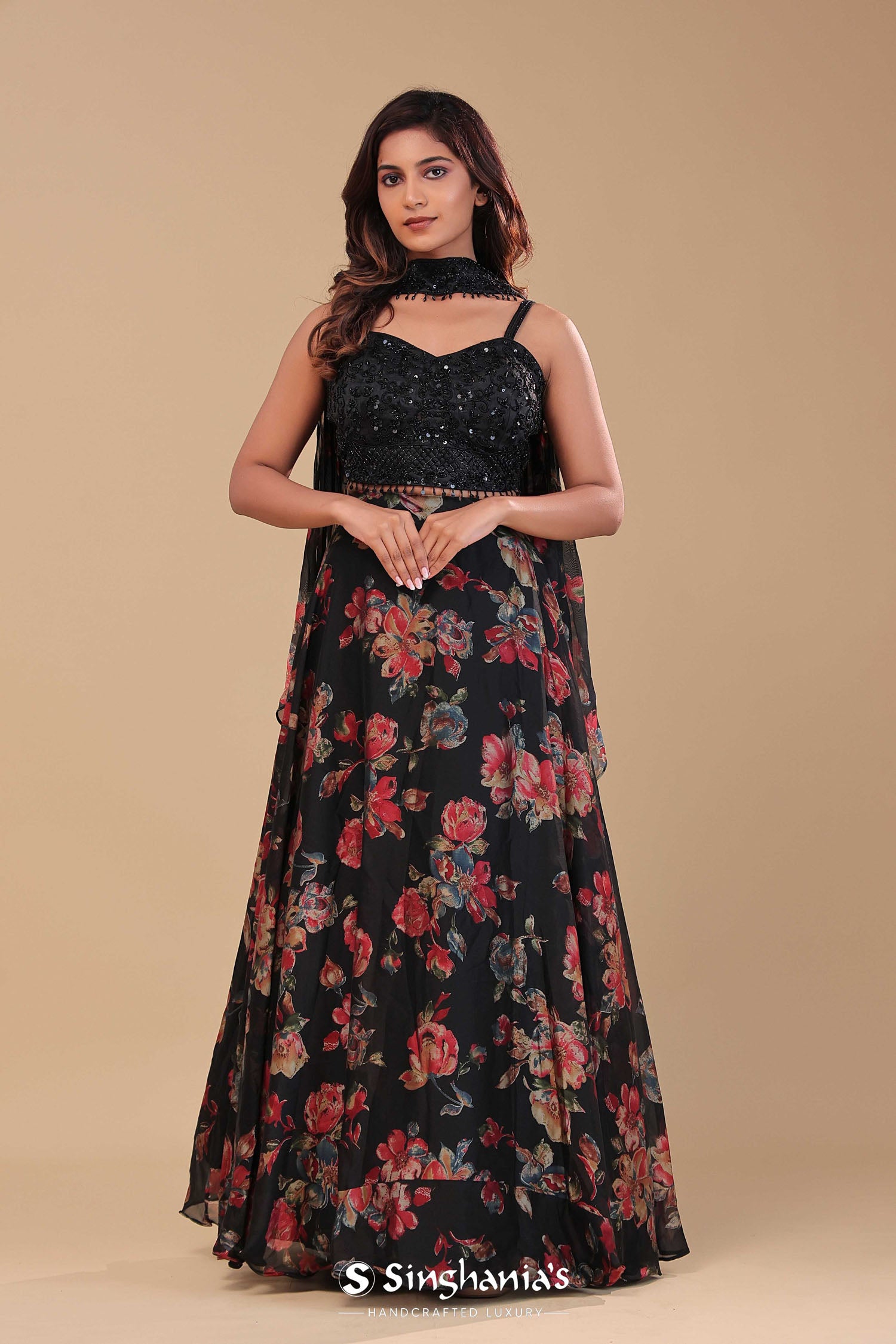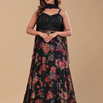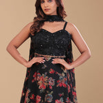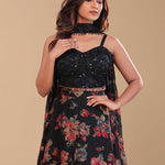 This Black georgette lehenga set features black georgette sweetheart neckline adorned with sequins and beads work . The lehenga is adorned with floral printed design creating a beautiful contrast with choker dupatta