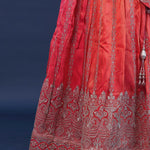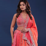 Dual shades chinon lehenga set features tissue V neck blouse adorned with zardosi and pearls work with scallop design. The kardana and sequins work forming a pattern spread across the lehenga with heavy and densely embroidered design on self border.The scallop border adorned with sequins and embroidery work with butti's spread all across the matching dupatta adds the finishing touch to the entire garment