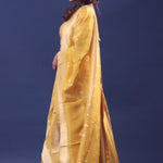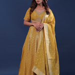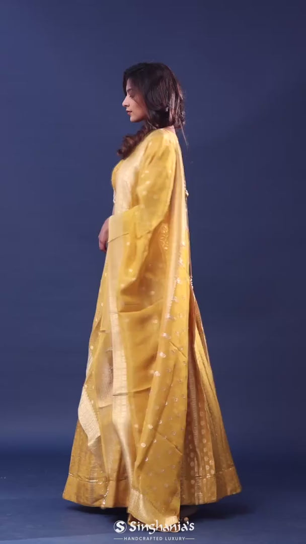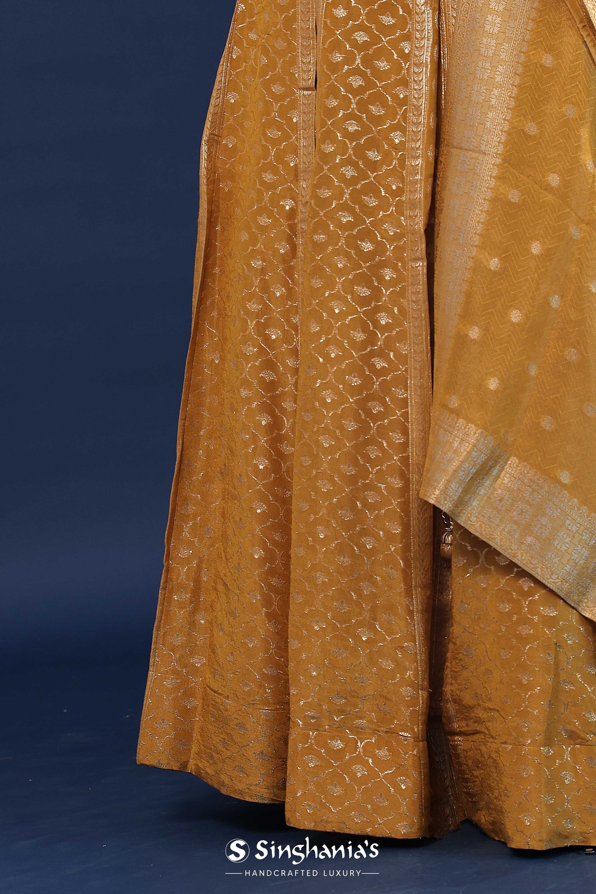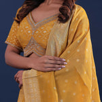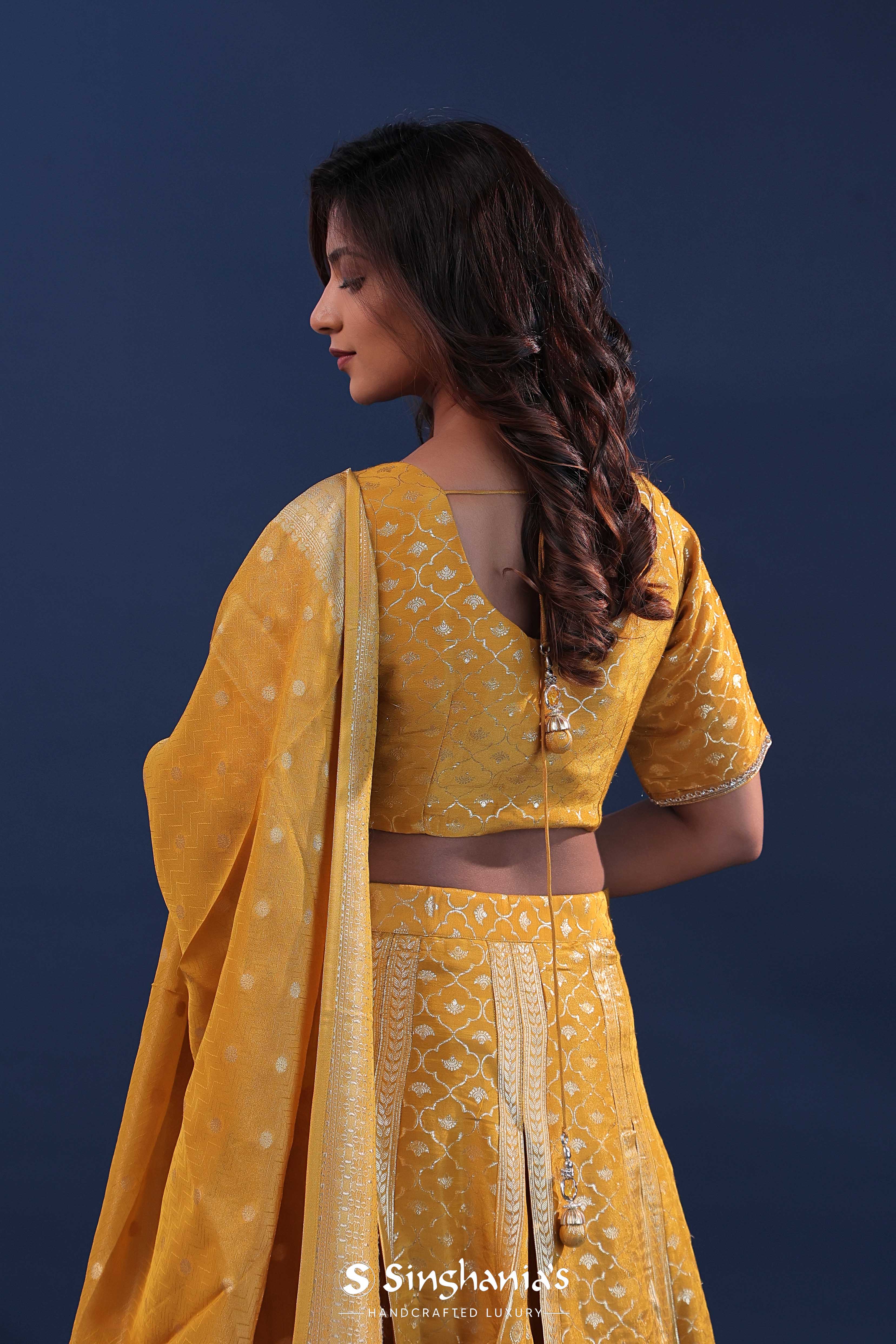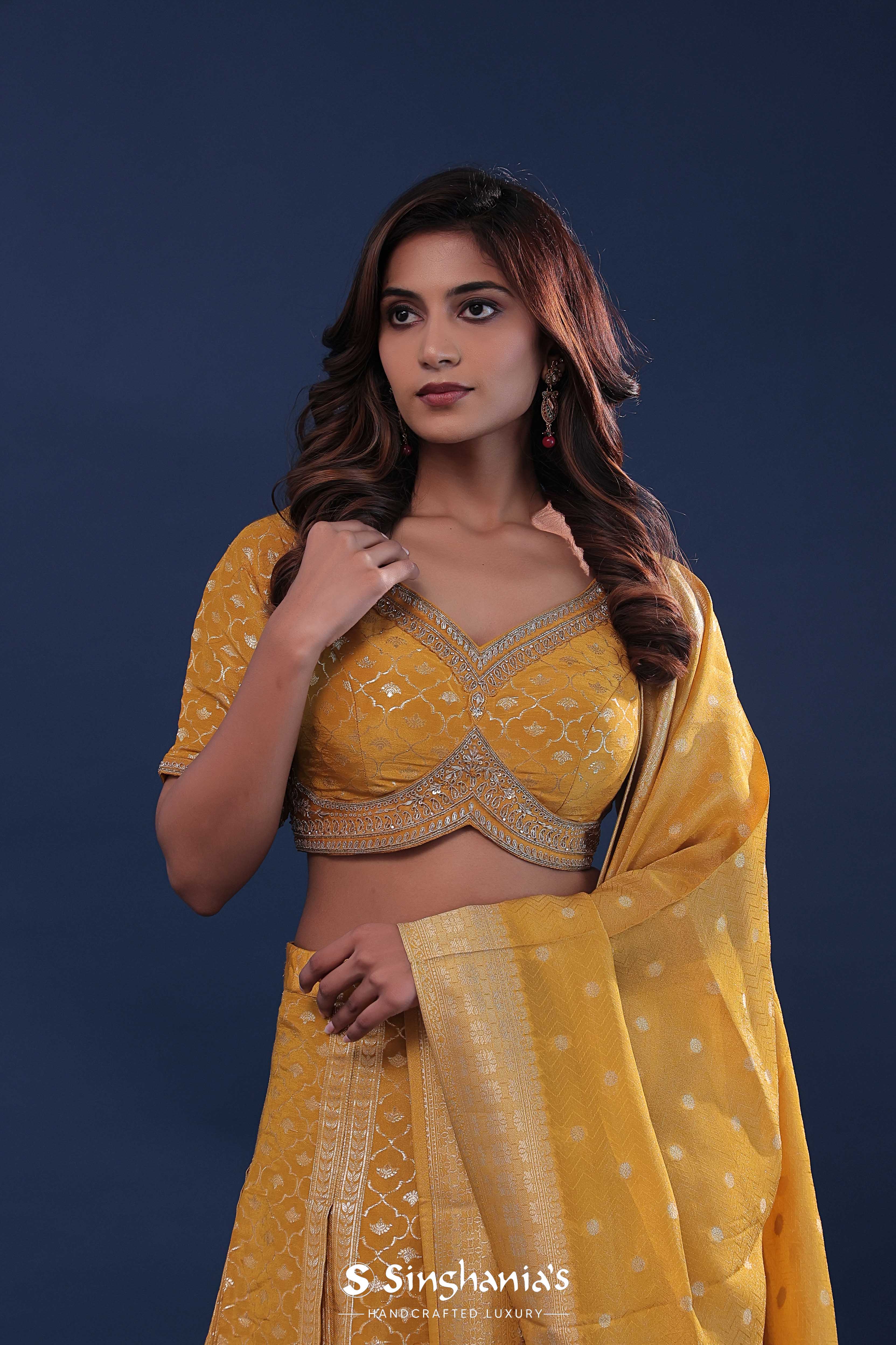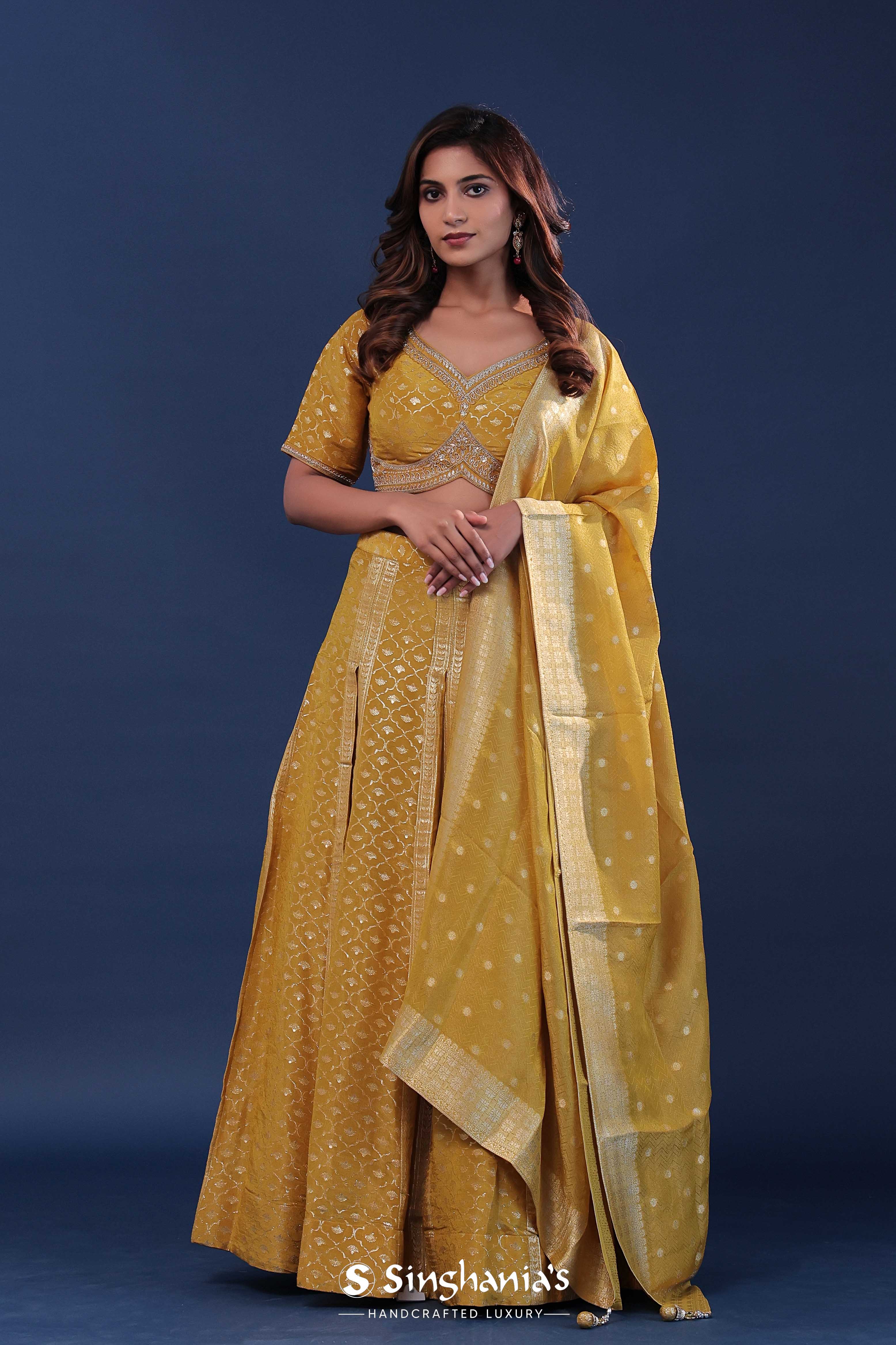 Mustard yellow banarasi lehenga set features banaras blouse adorned with embroidery work around the neckline complemented lehenga with multiple slits and entire garment is woven with gold zari forming a quatrefoil patterns . The banarsi dupatta adding a finishing touch to the entire garment