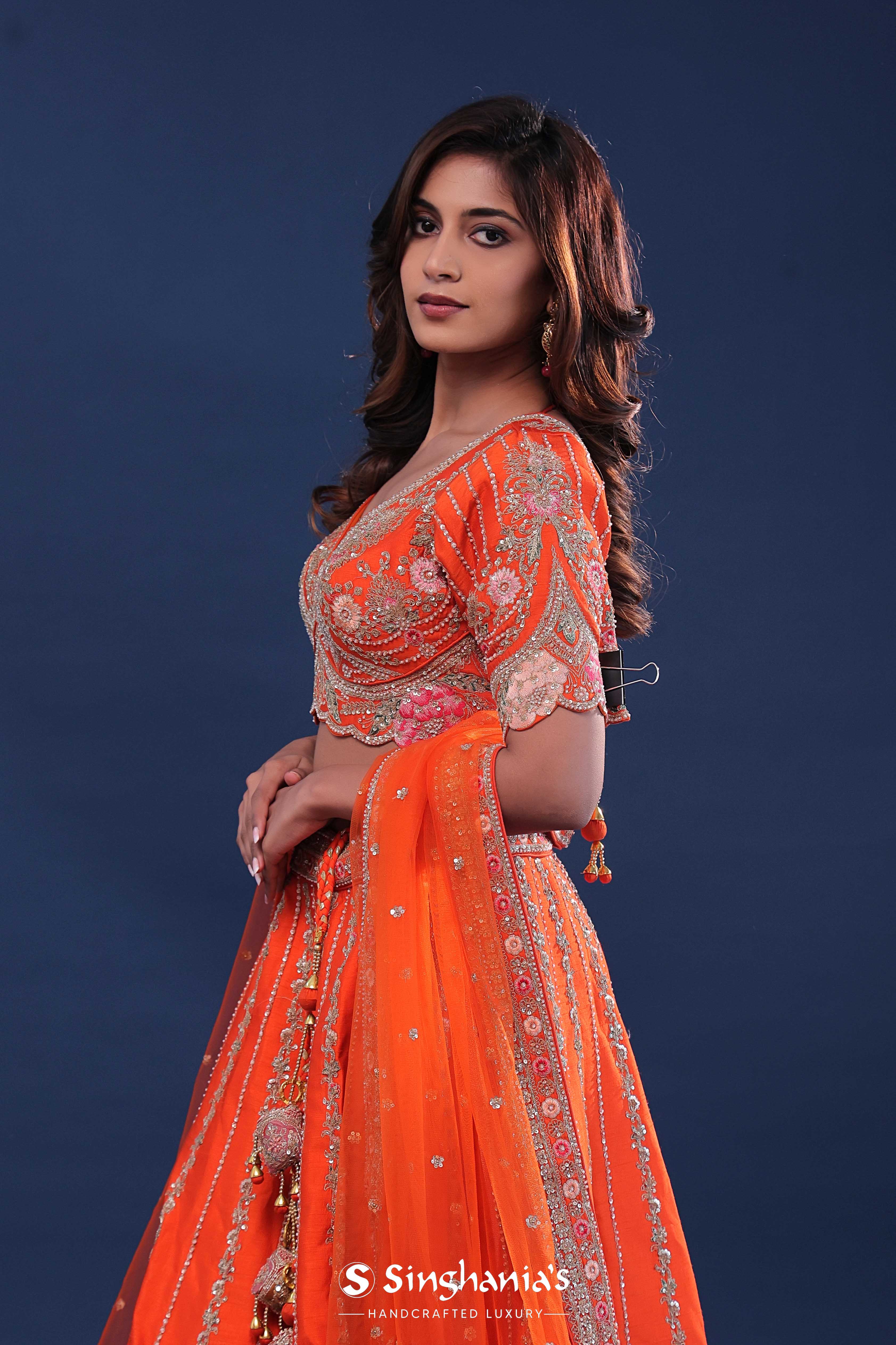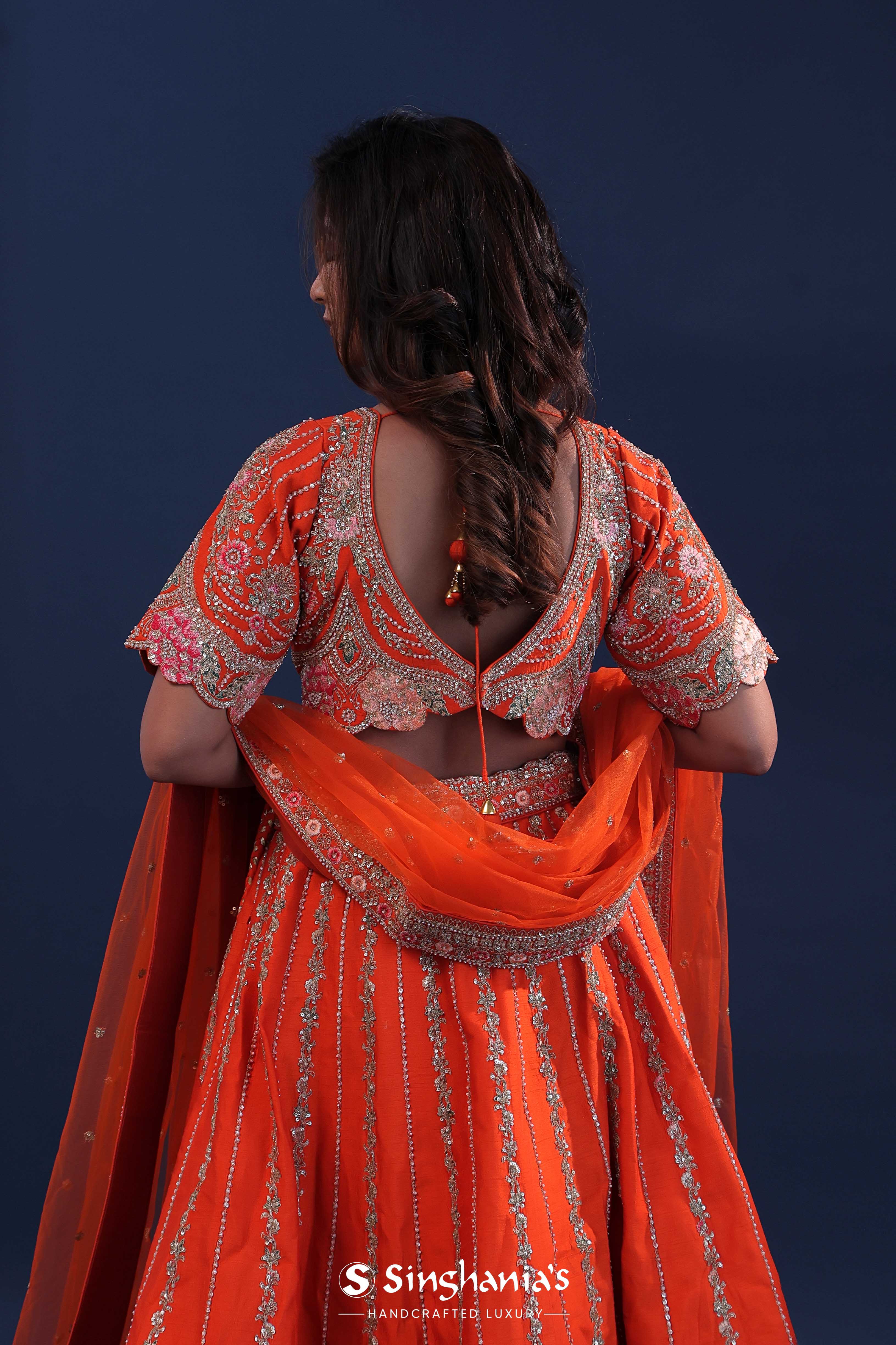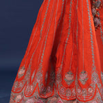 Orange raw silk lehenga set features raw silk blouse with embroidery and sequins work with sleeves upto elbow length.The lehenga is adorned with pearls and floral embroidery work aligned parallel to each other alternatively in wave pattern. The netted dupatta adorned with sequins butti's and small width self border making it ideal choice for your favourite occasions