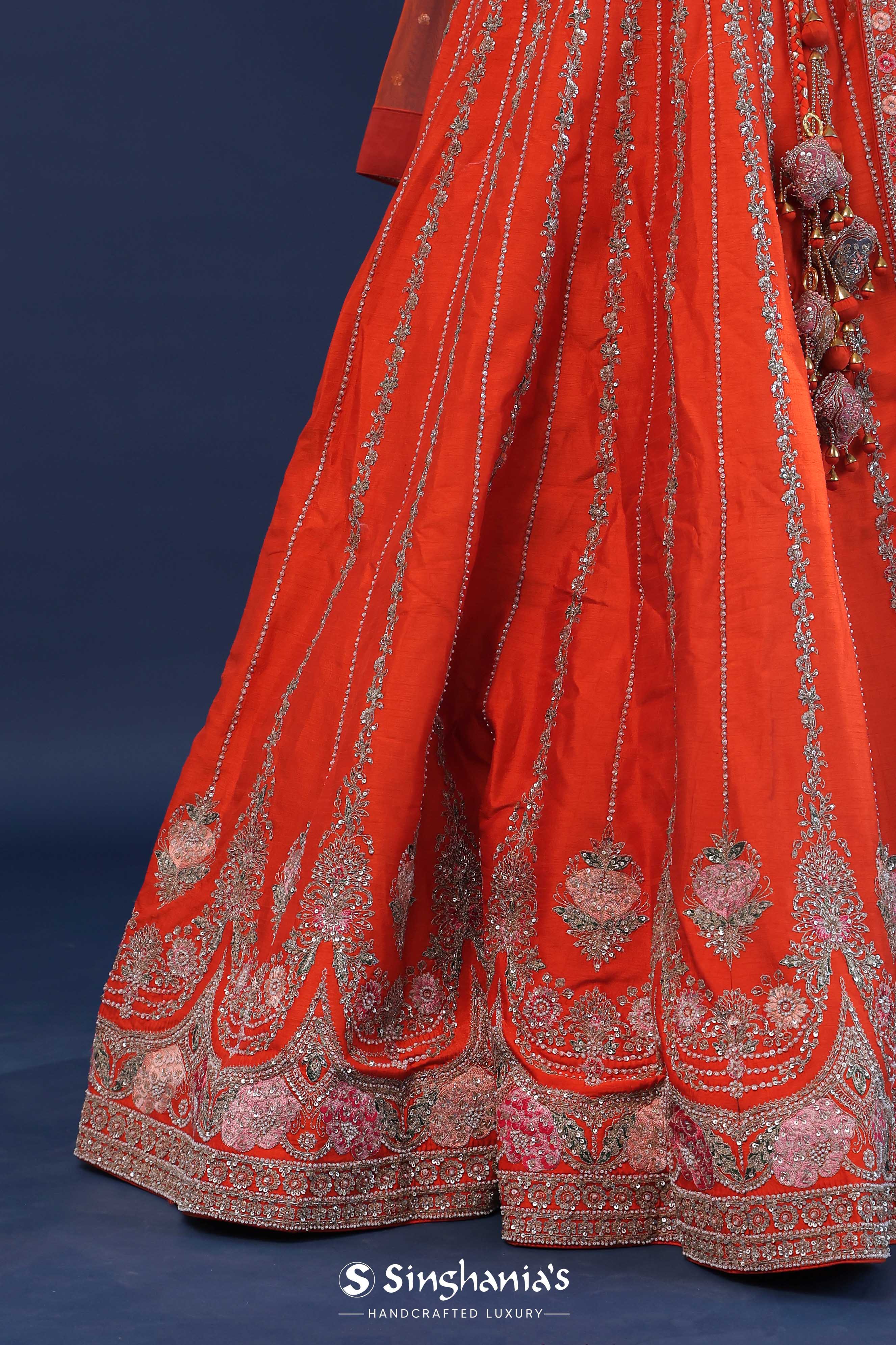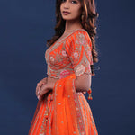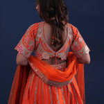 Orange Raw Silk Lehenga Set With Netted Dupatta