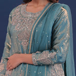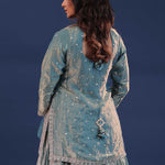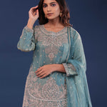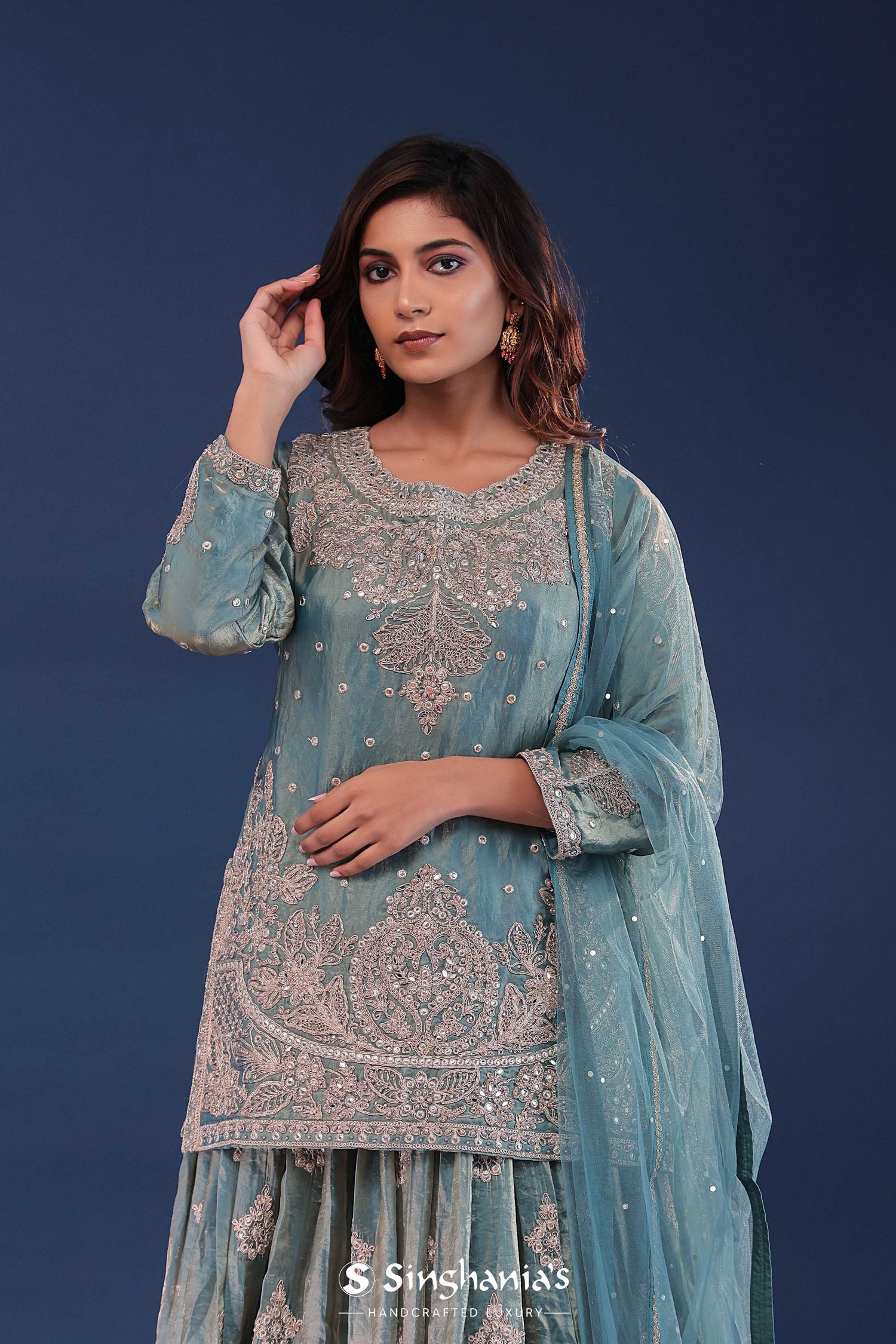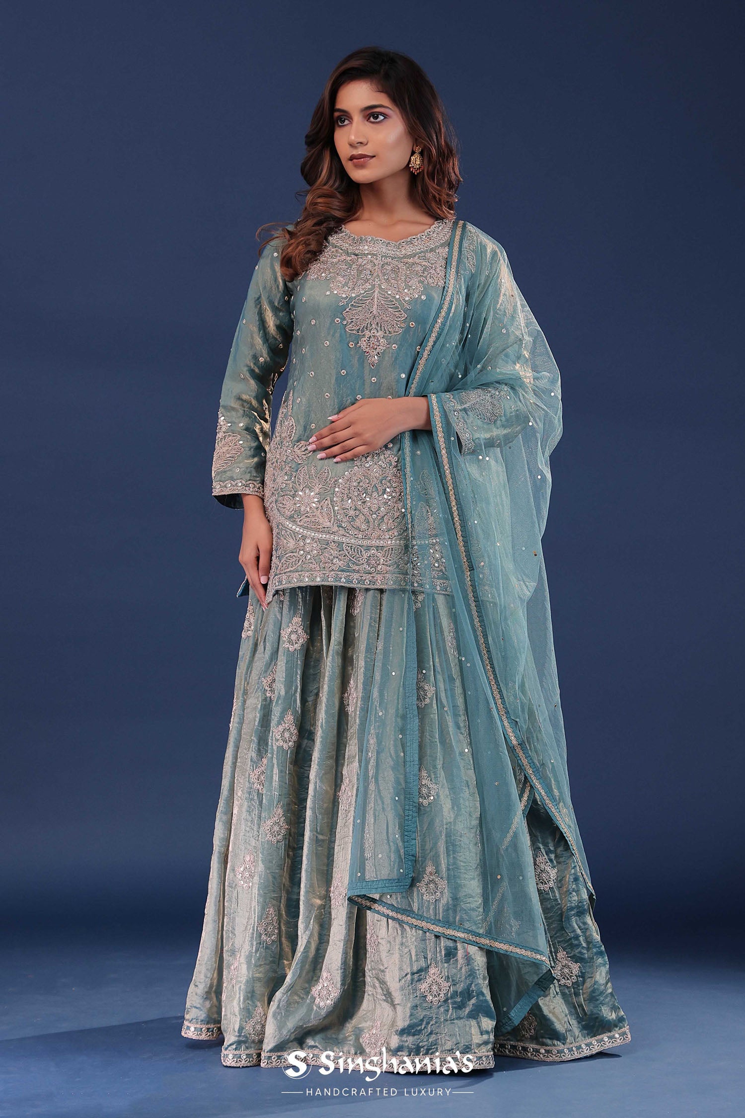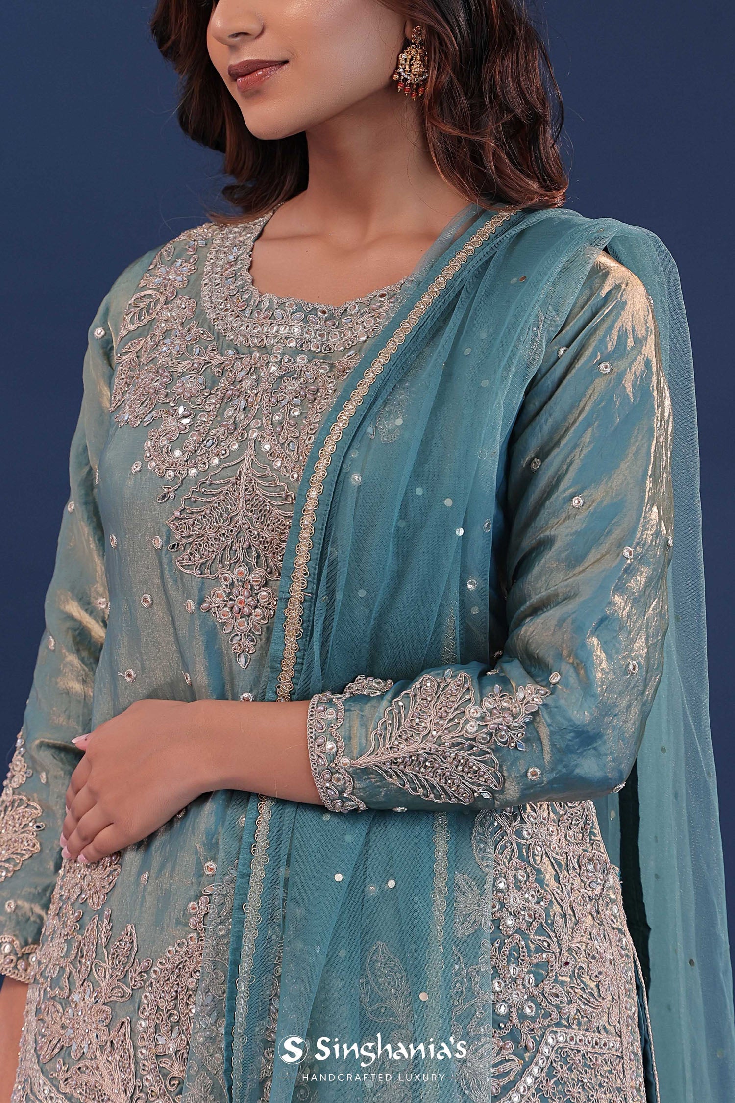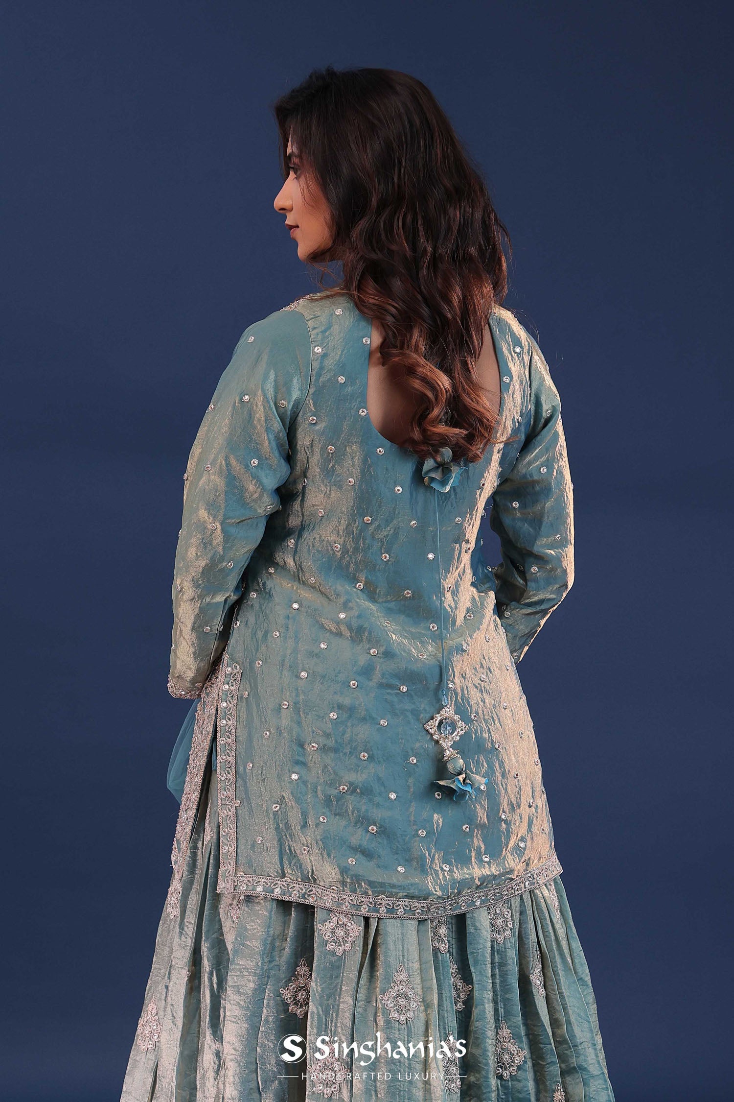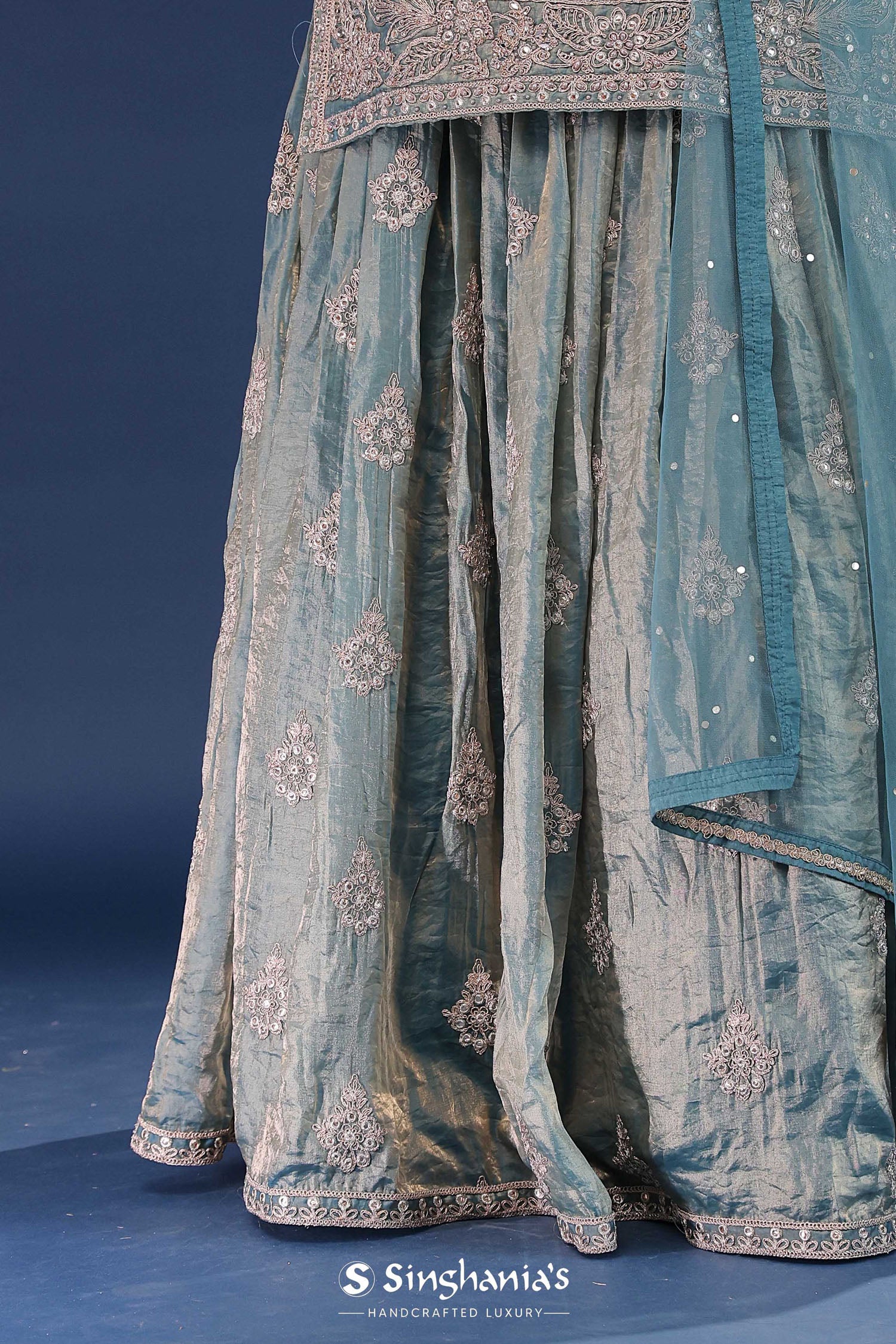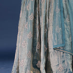 Pale blue tissue lehenga set features round neck kurta and mid-forearm sleeves adorned with mirror and embroidery along with matching lehenga with similar design work and small border . The netted dupatta adorned with mirror work and small width border adds the finishing touch to the entire fit