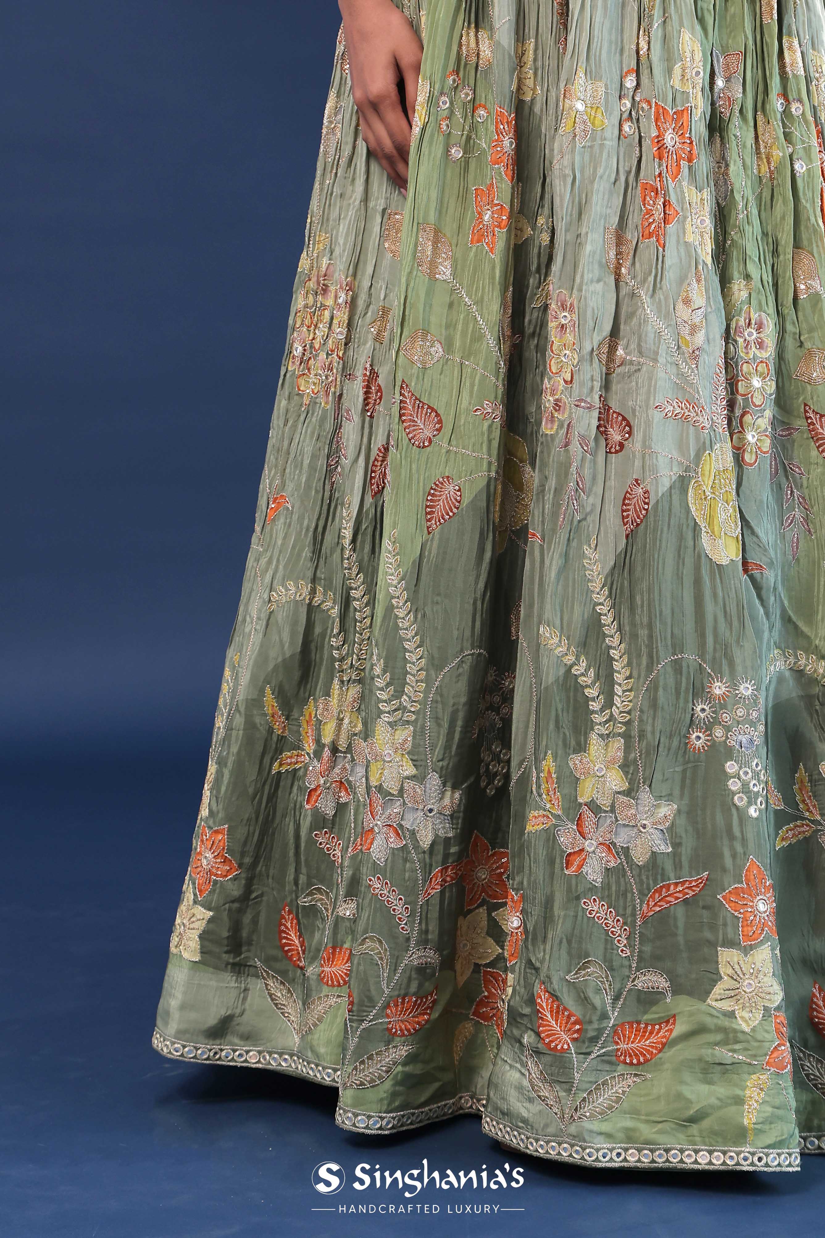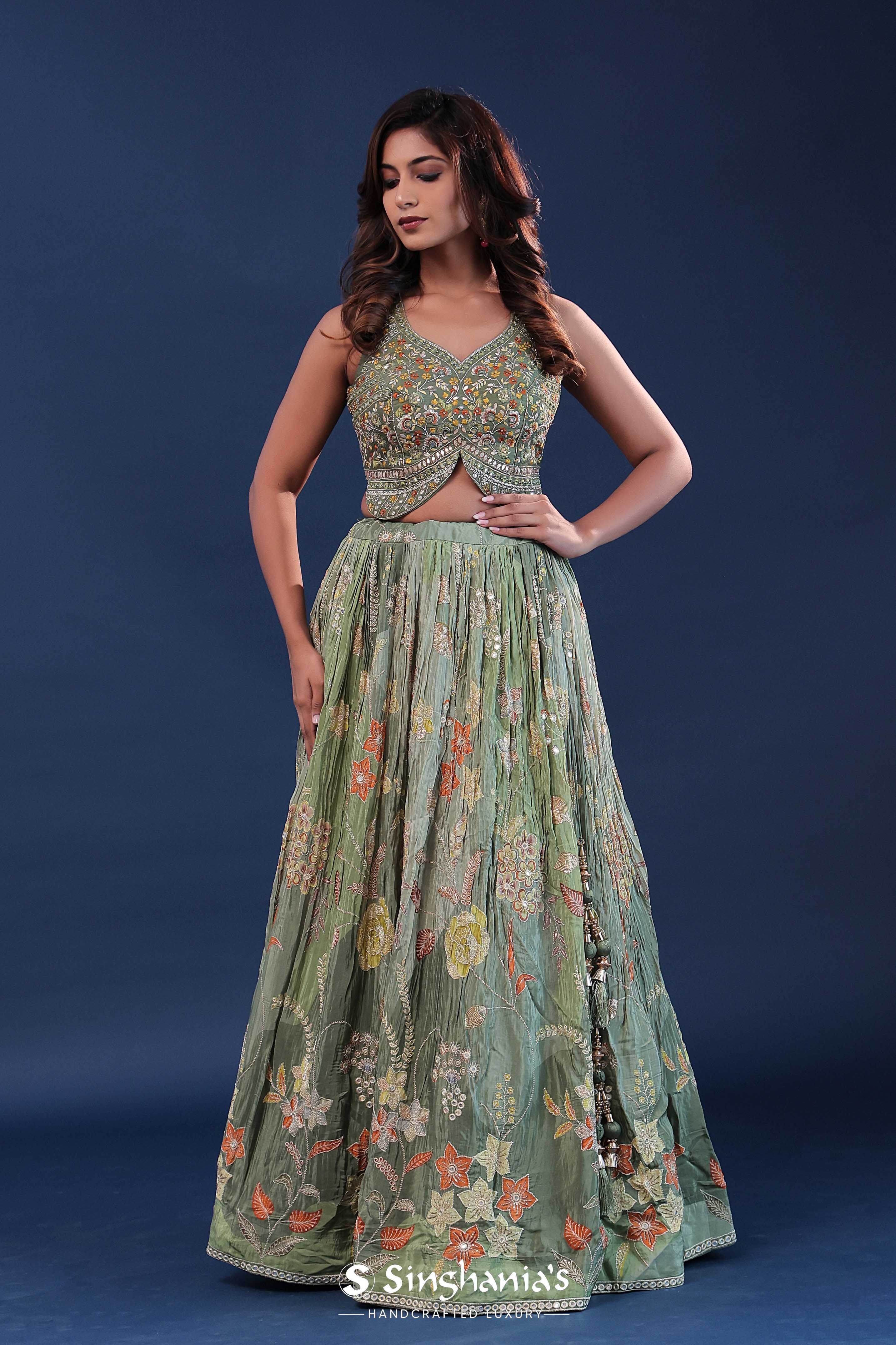 Pista green chinon georgette crush lehenga set features soft silk blouse adorned with floral embroidery woven densely all across the sleeveless blouse.The lehenga adorned with floral prints of contrast colors with mirror and embroidery work spread all across. Making it ideal choice for traditional occasions.