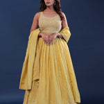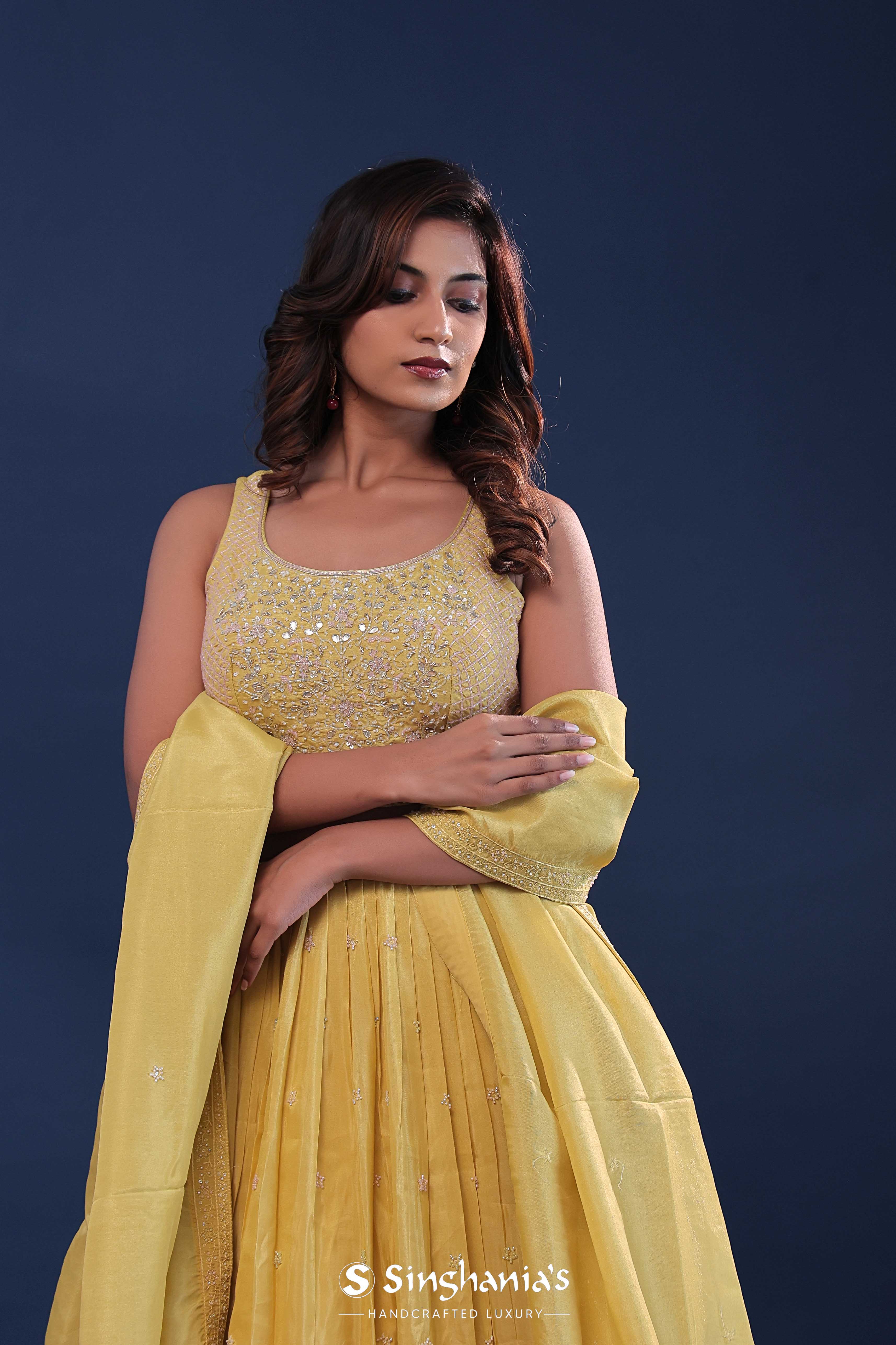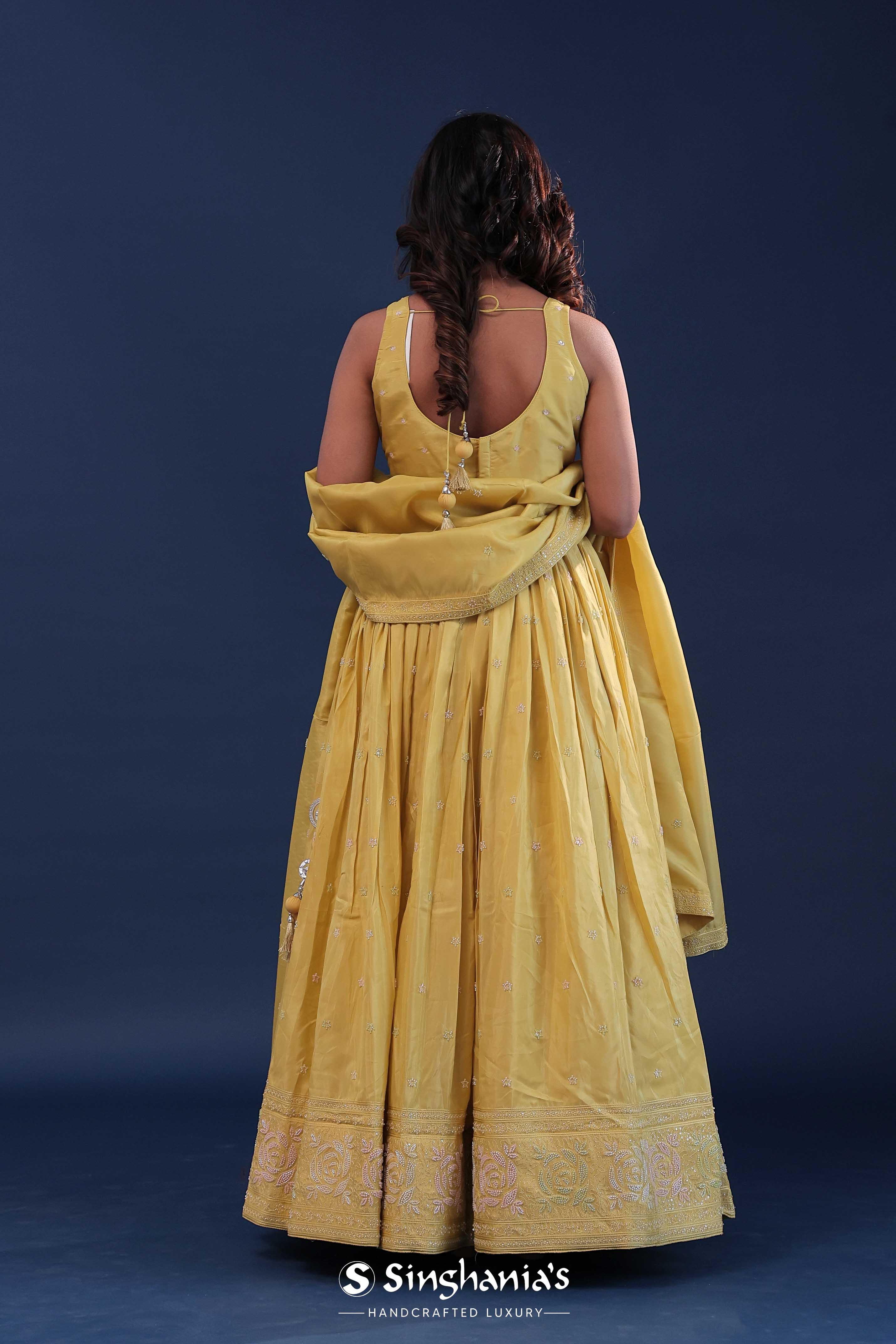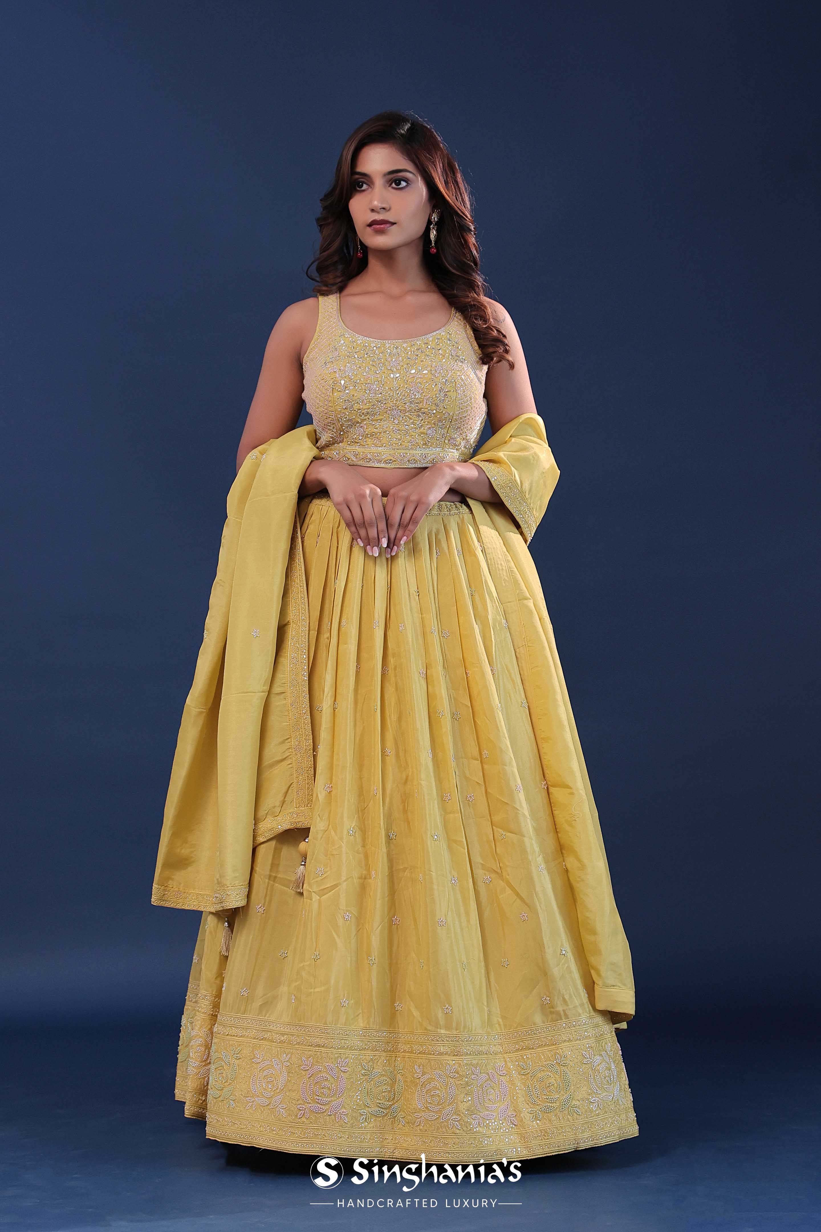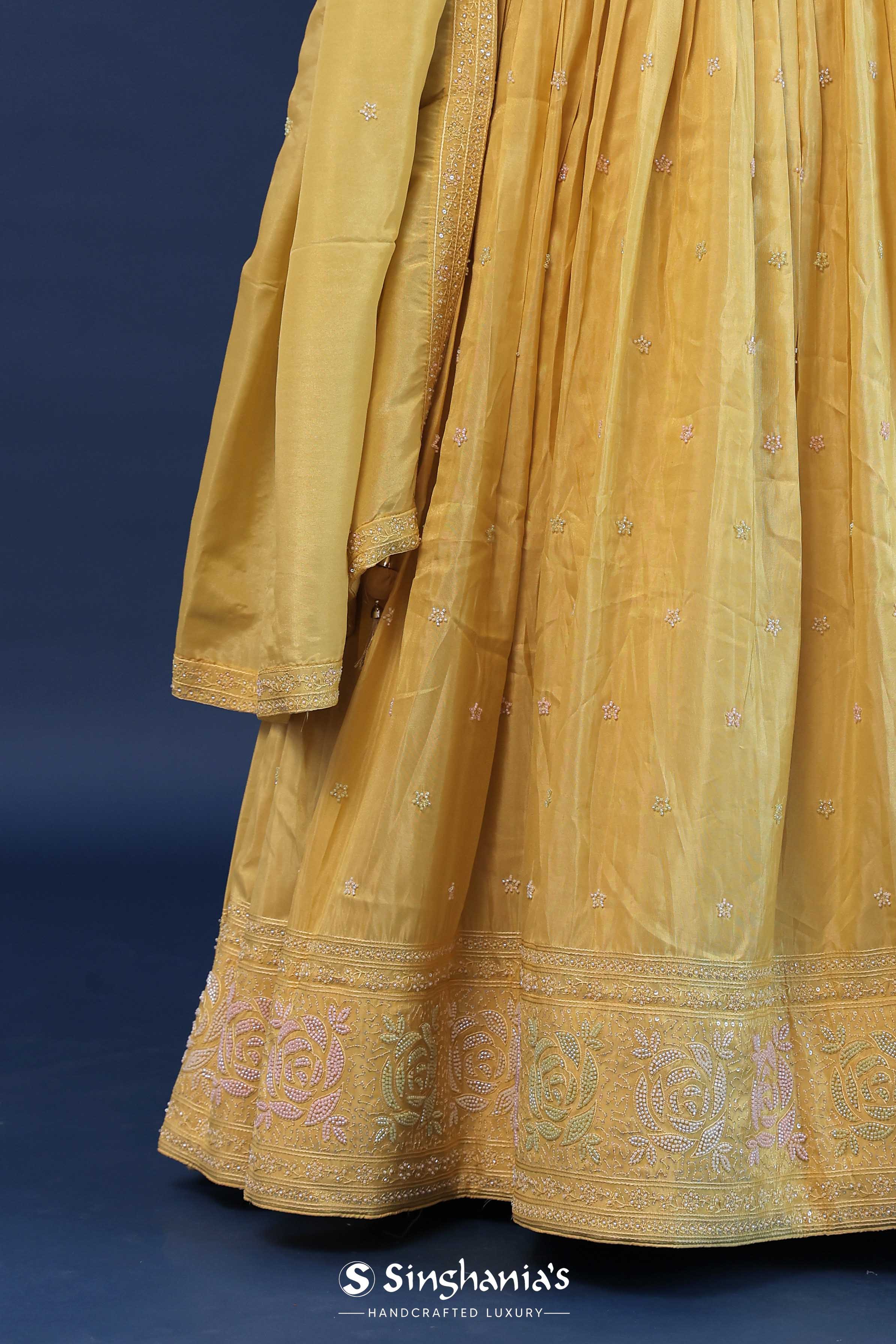 Royal yellow tissue organza lehenga set features soft silk round blouse adorned with kardana work along with self border lehenga with butti's spread all across the lehenga. The tissue organza dupatta is embellished with self border and kardana butti's making it elegant and classy to wear on any event