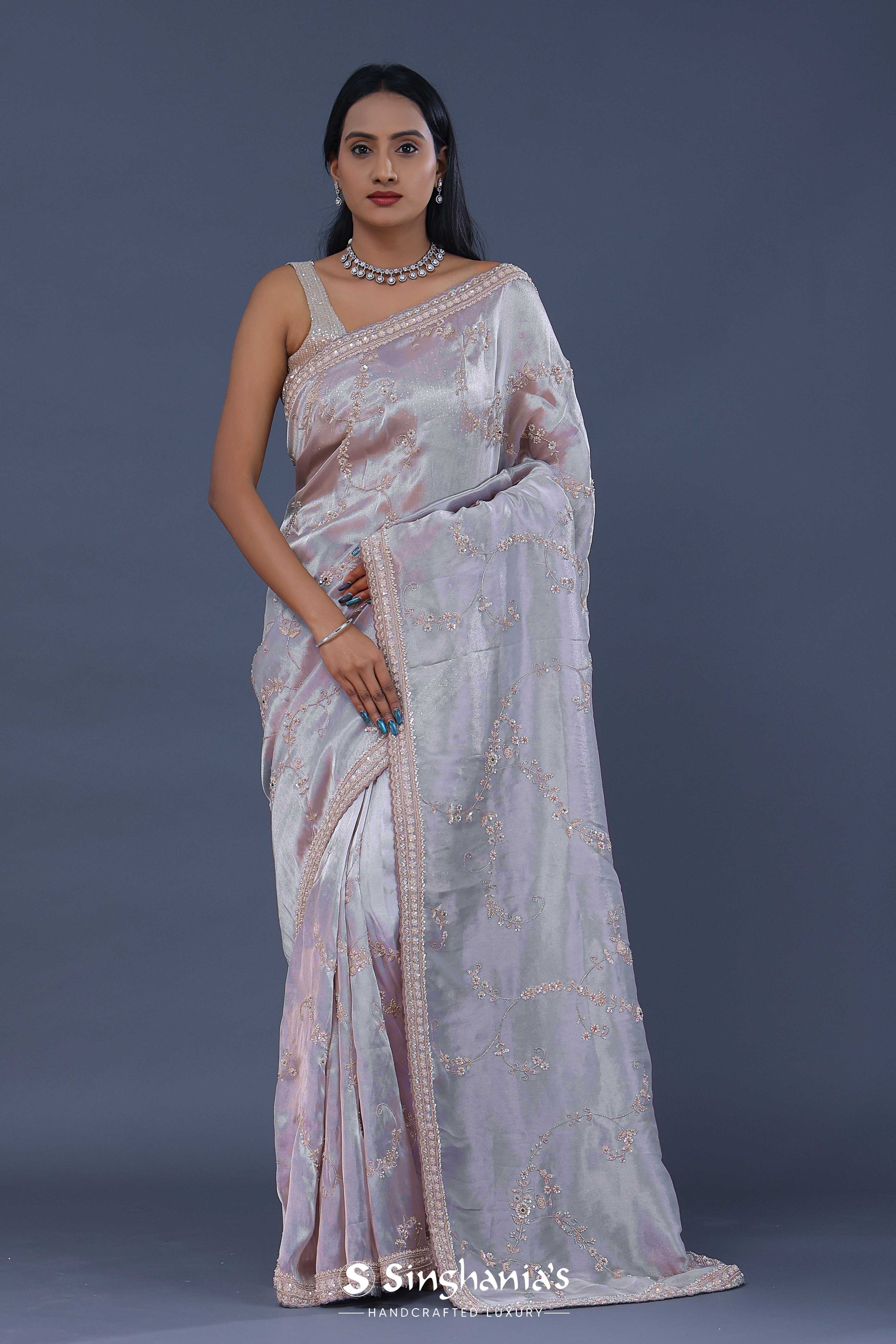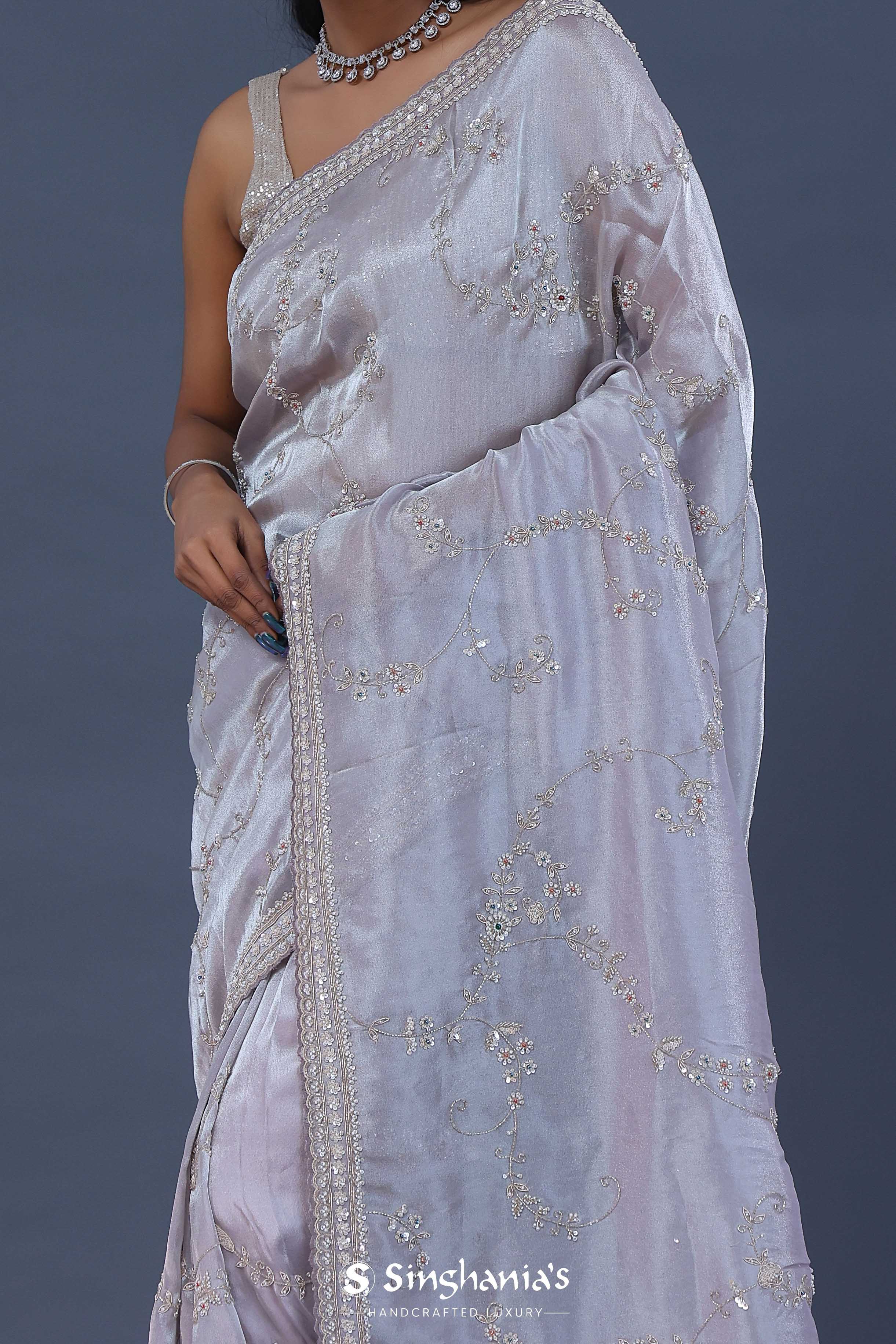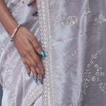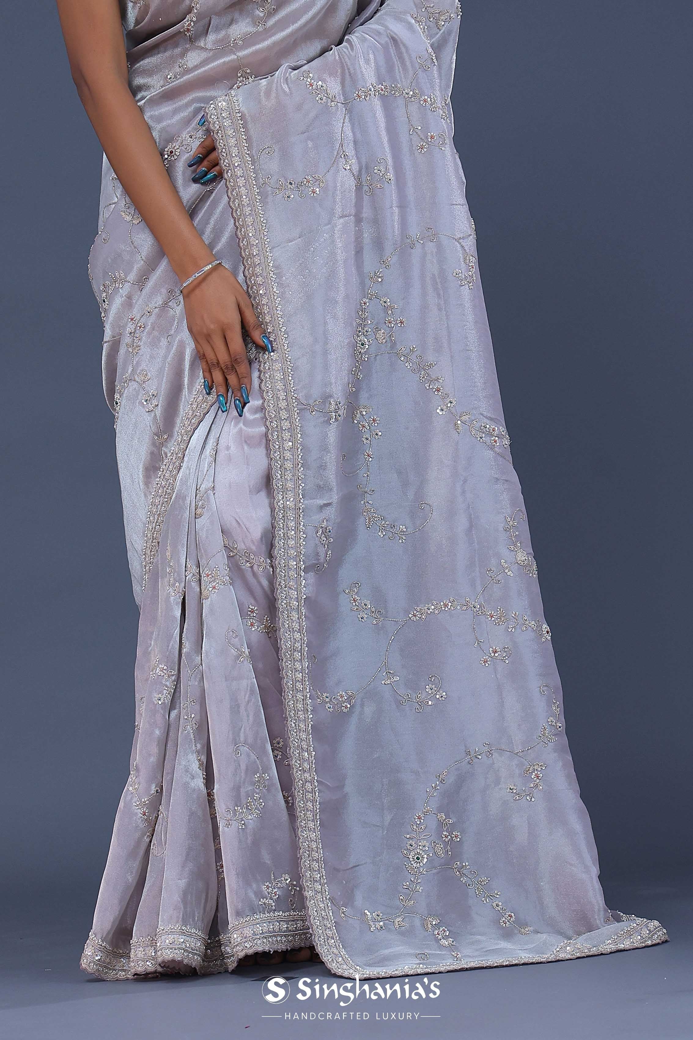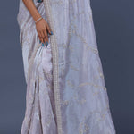 This lightweight and flowy blueish silver tissue saree features floral jaal formed by sequins and kardana on body and scallop border making it reflect grace and elegence at any occasions