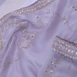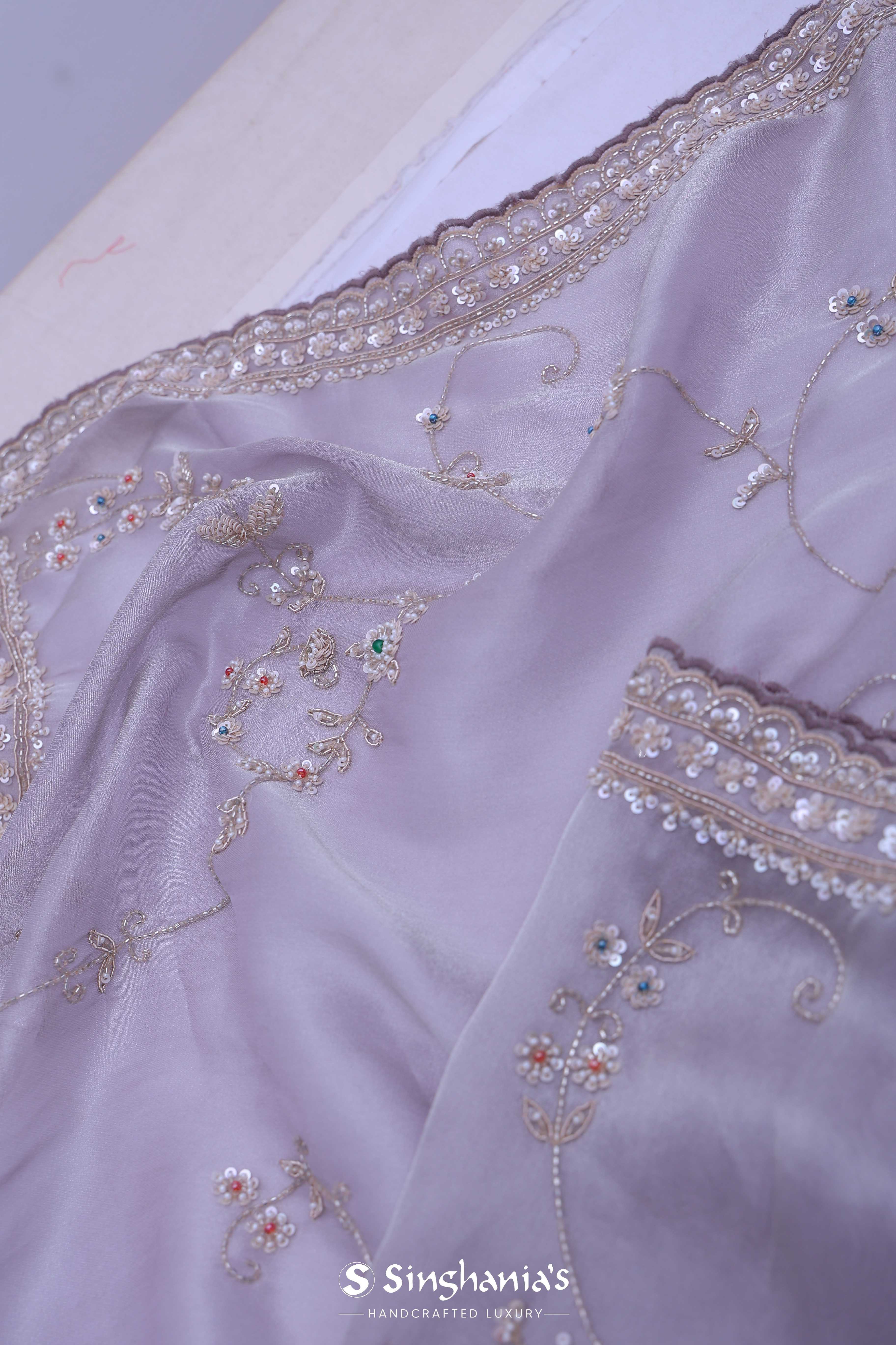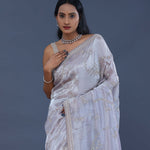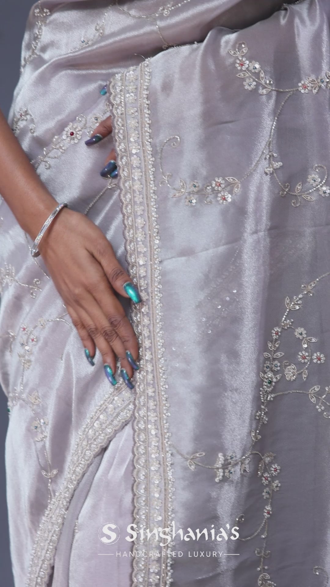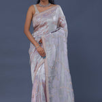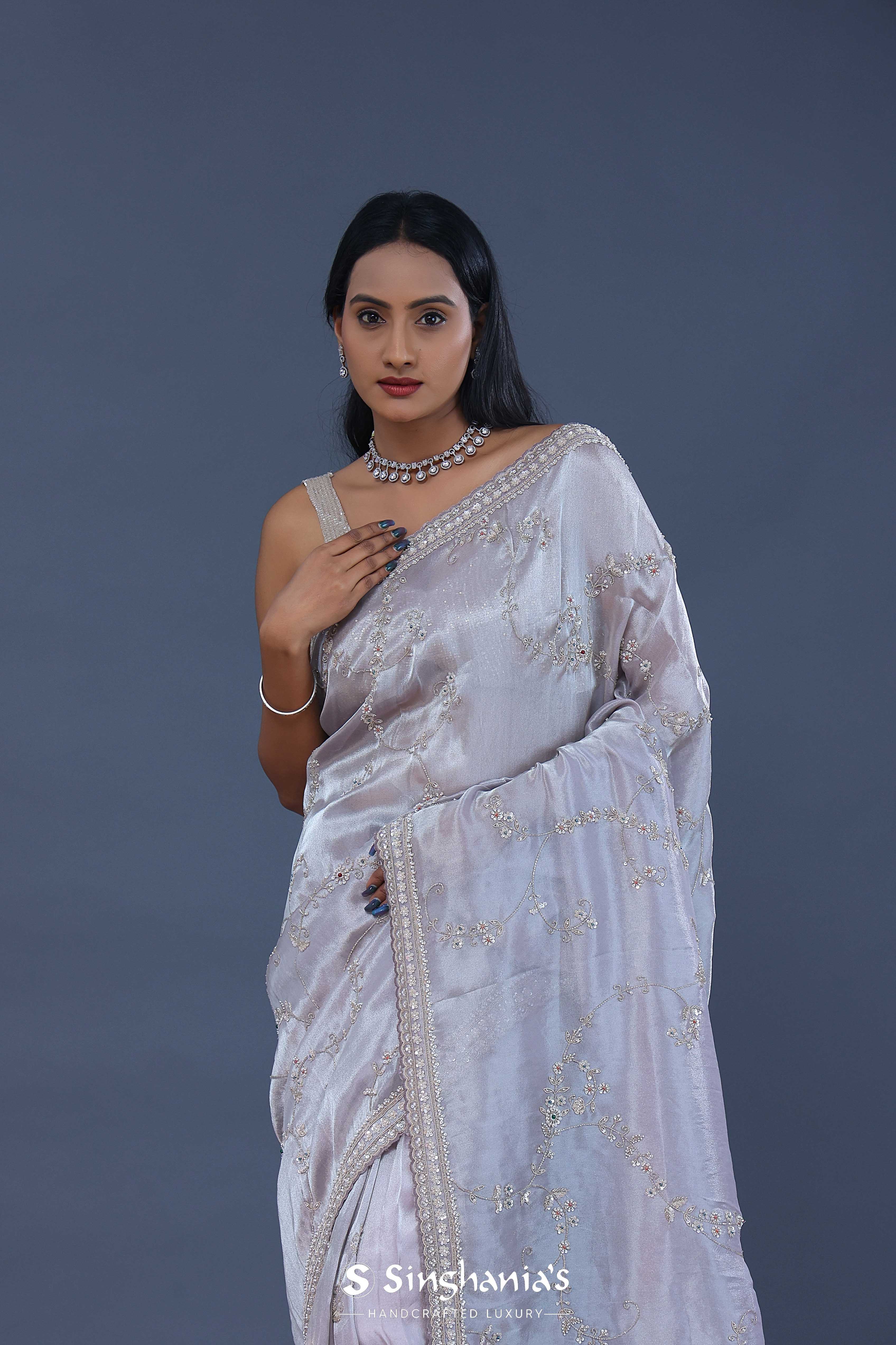 This lightweight and flowy blueish silver tissue saree features floral jaal formed by sequins and kardana on body and scallop border making it reflect grace and elegence at any occasions