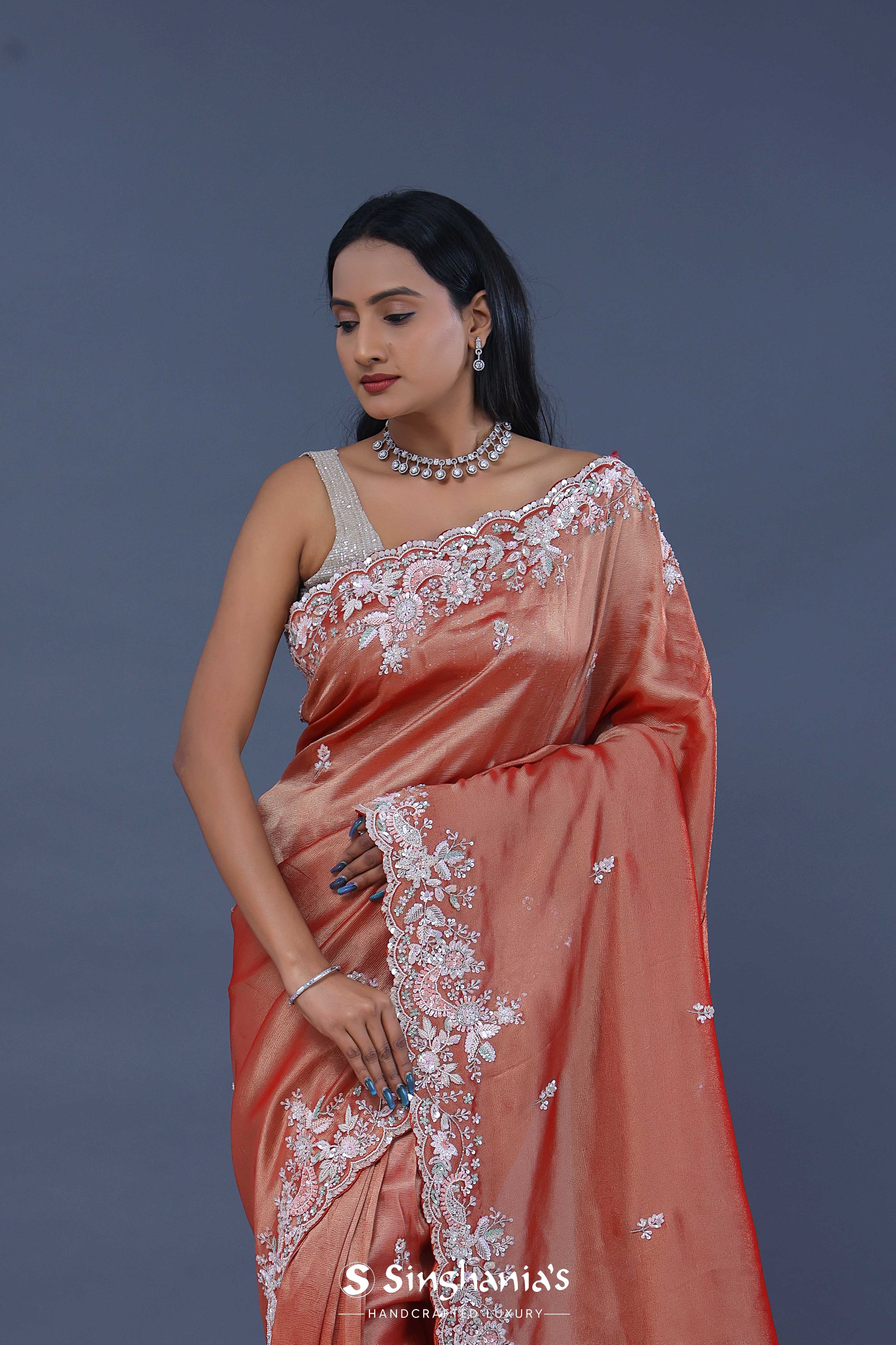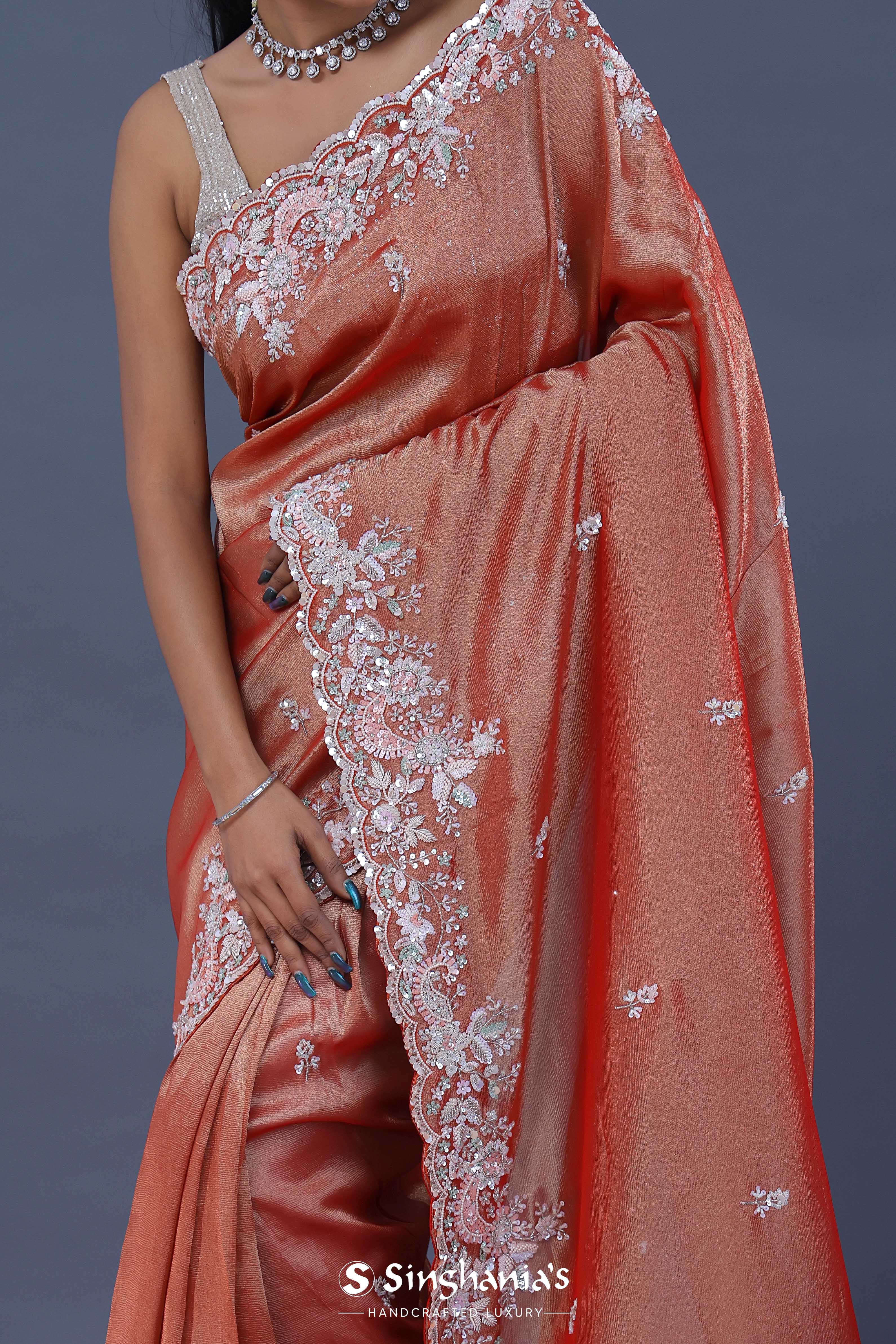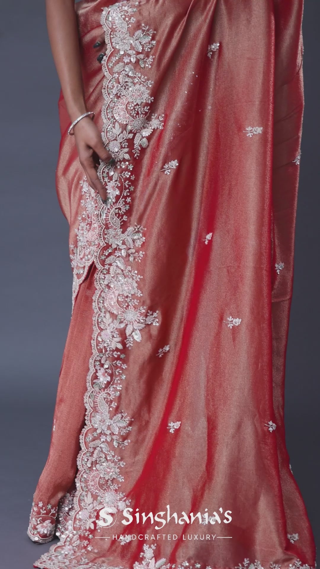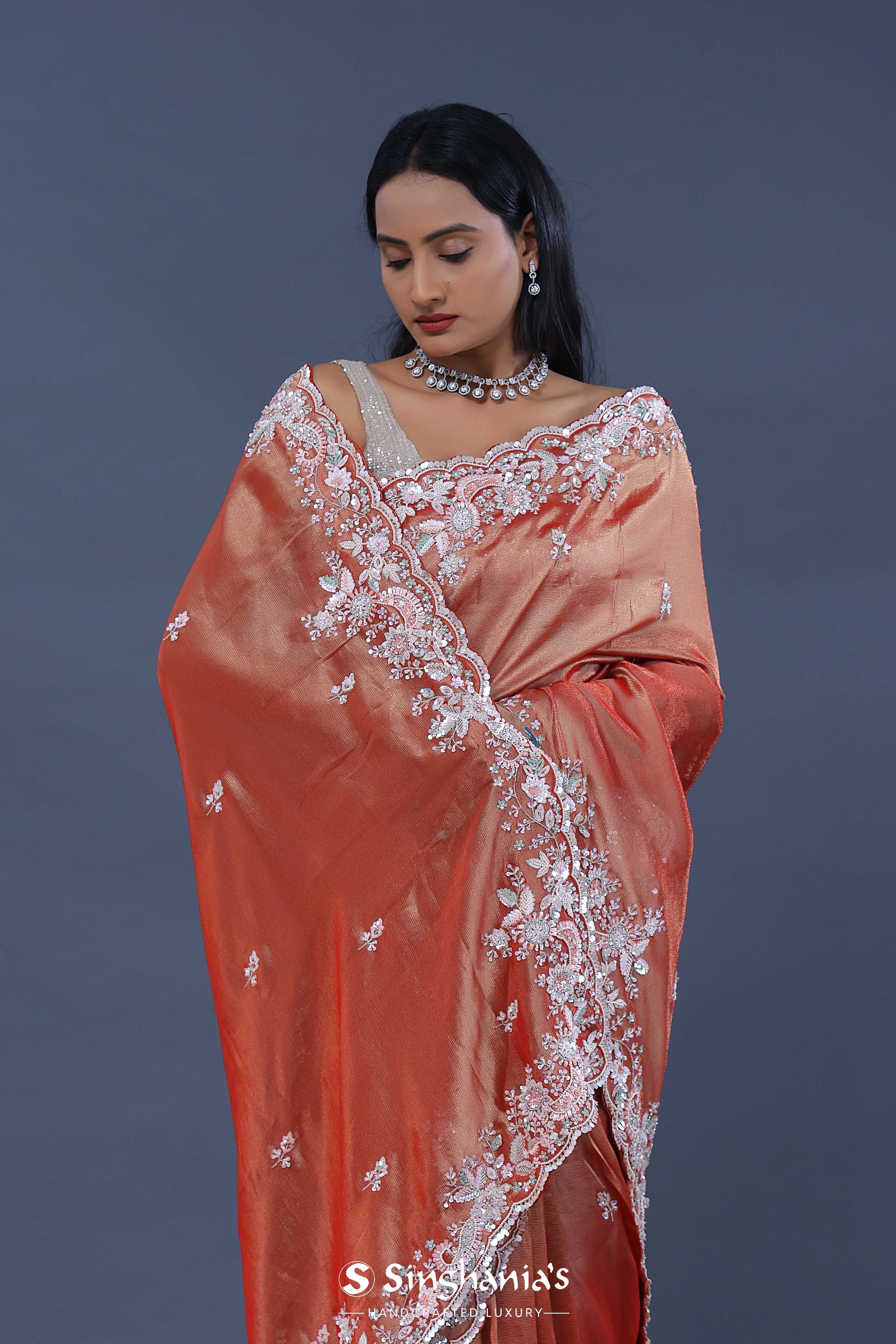 Chestnut brown tissue saree is sheen and delicate texture embellished with sequins , dyeable sequins beads at border and embroidered butti's are spread all across the saree making it special at any occasions .