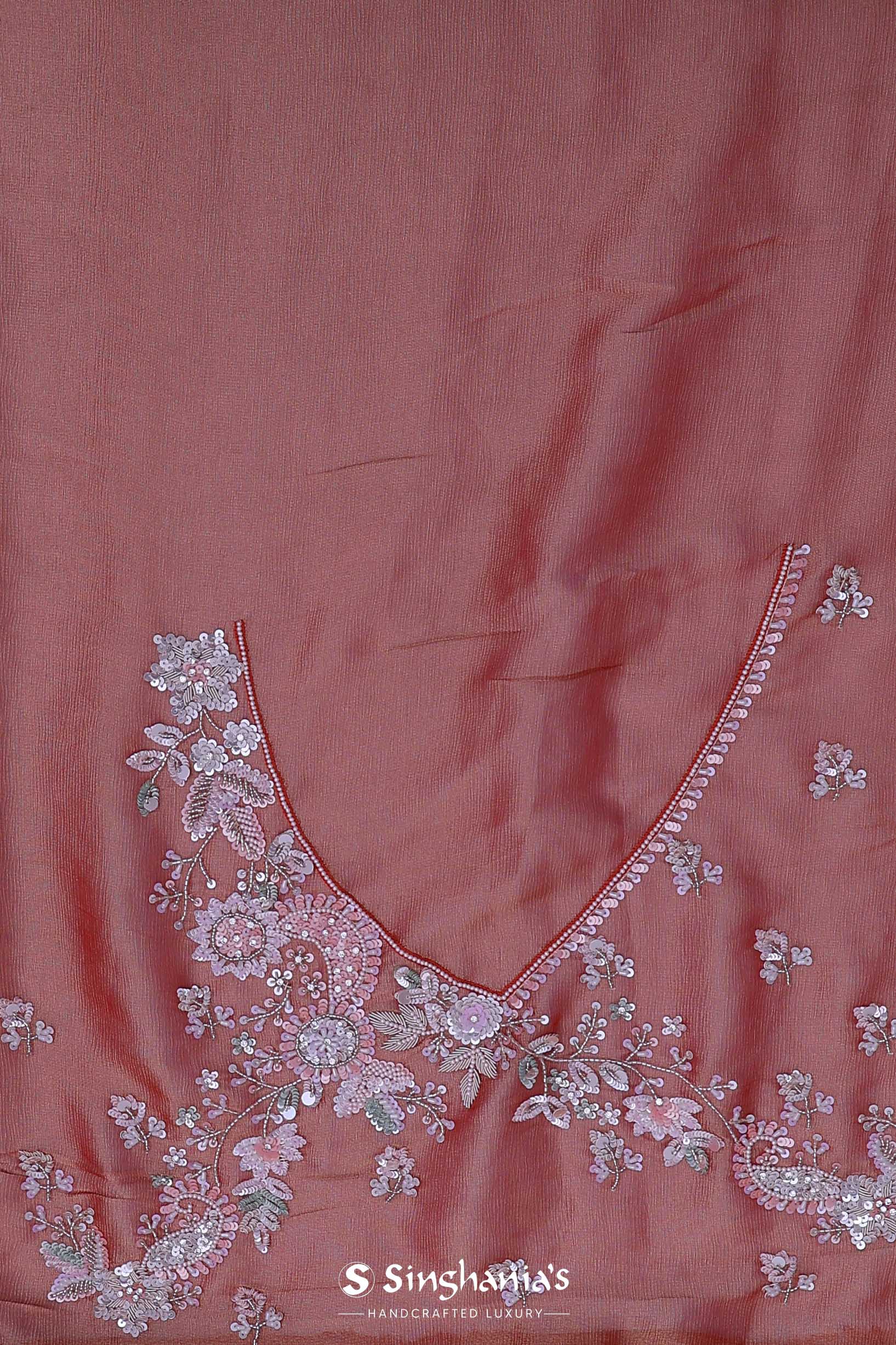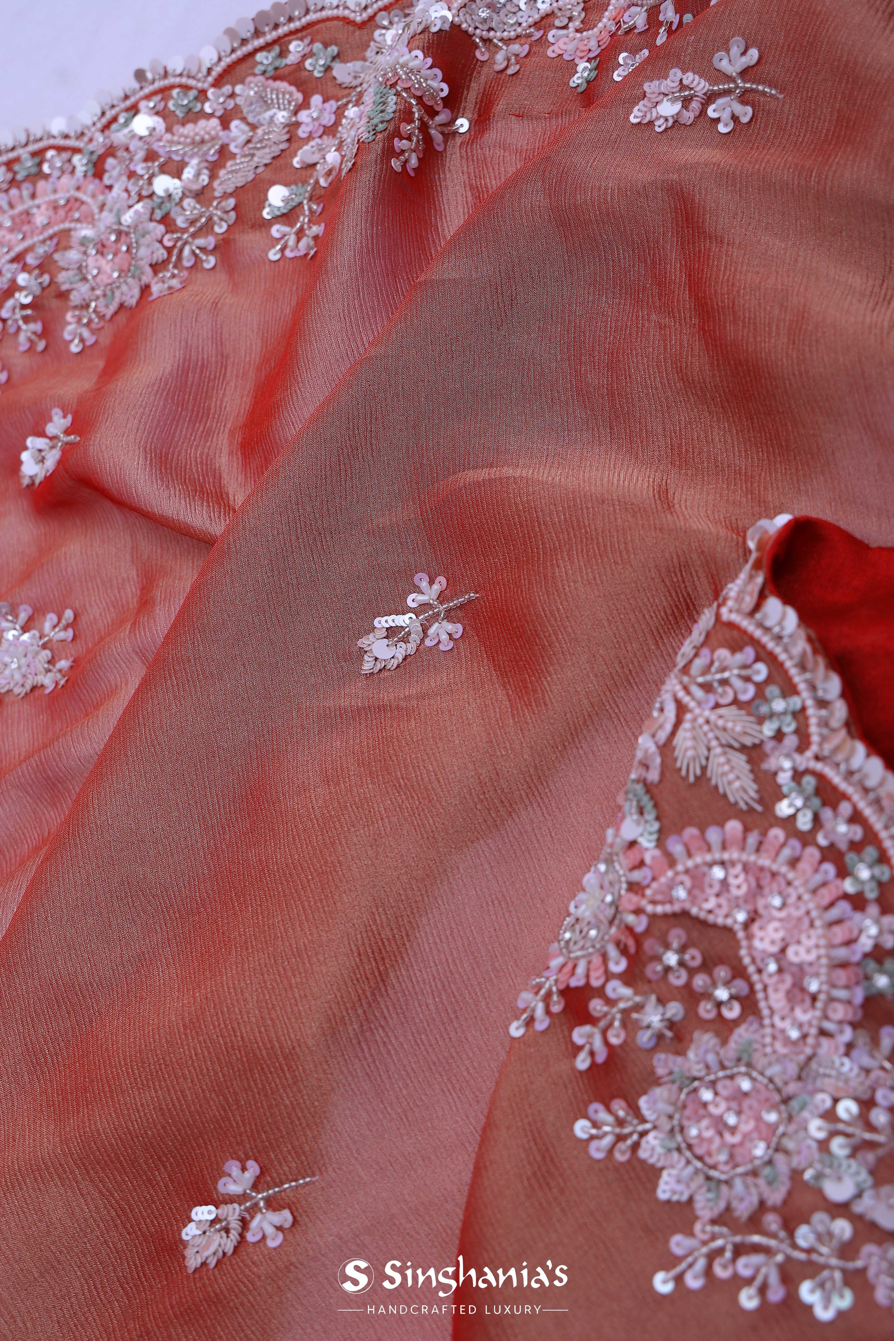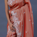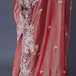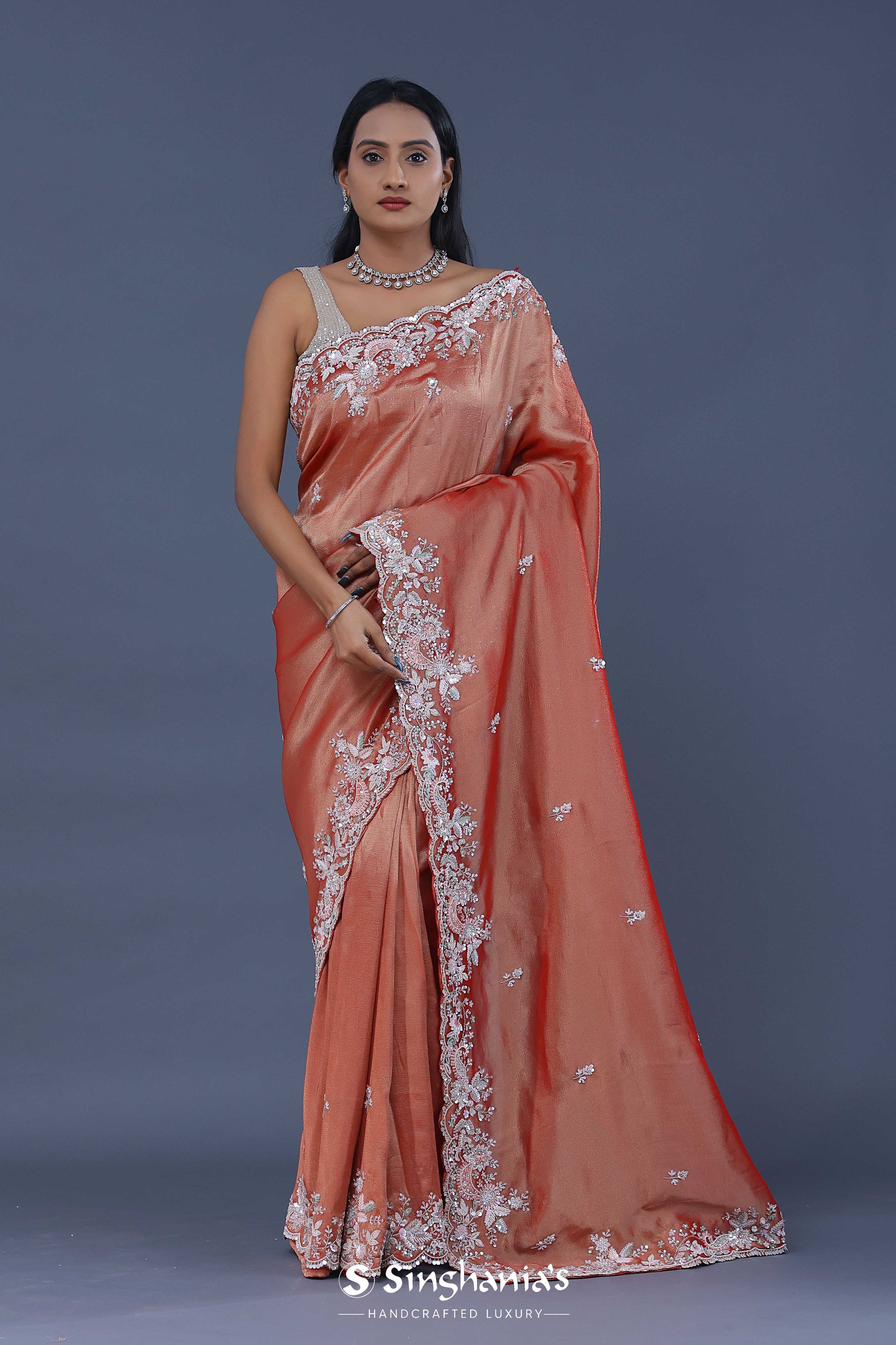 Chestnut brown tissue saree is sheen and delicate texture embellished with sequins , dyeable sequins beads at border and embroidered butti's are spread all across the saree making it special at any occasions .