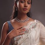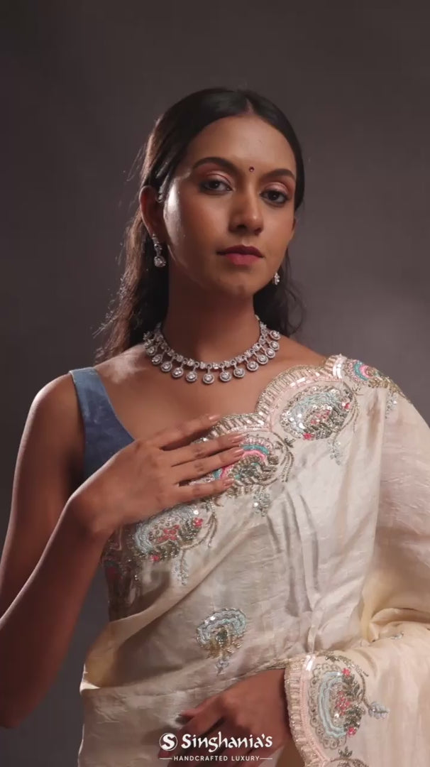 This cream organza saree is a vision of elegance, featuring delicate butti work scattered across the fabric. The saree is framed with a beautiful scallop border, intricately embellished with sequins and kardana work, adding a subtle shimmer and texture. The soft cream hue, paired with the fine detailing, makes it a perfect choice for weddings, receptions, or any festive occasion, offering a timeless and graceful appeal.