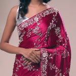 A richly fandango purple. saree with a silk base, which features floral jaal embroidered pattern. Added with intricately floral embroidered border, crafted with sequins and glass beads. Suitable for festive wear, and wedding parties.