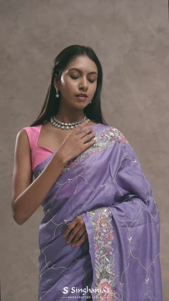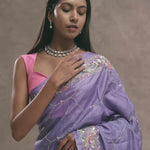 This lavender blue organza saree presents delicate embroidery on the border and an embroidery jaal on the body, blending soft elegance with detailed craftsmanship which is perfect for special events.