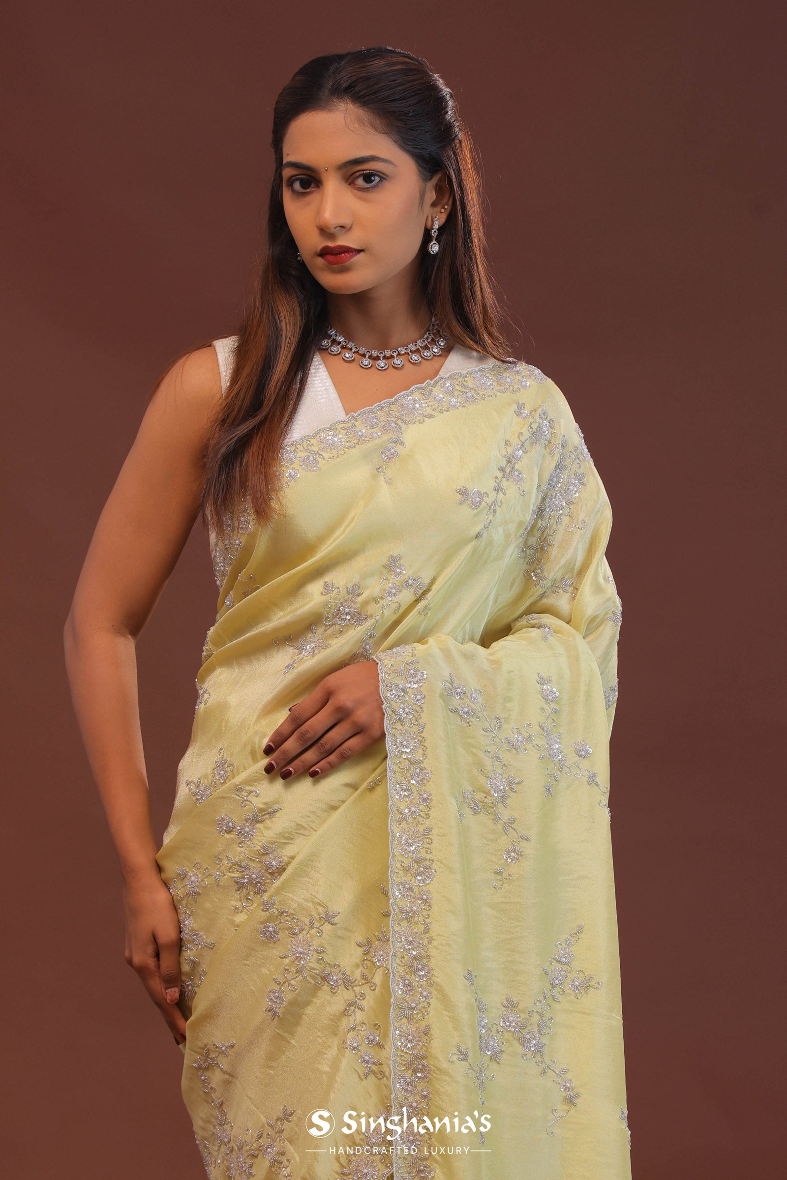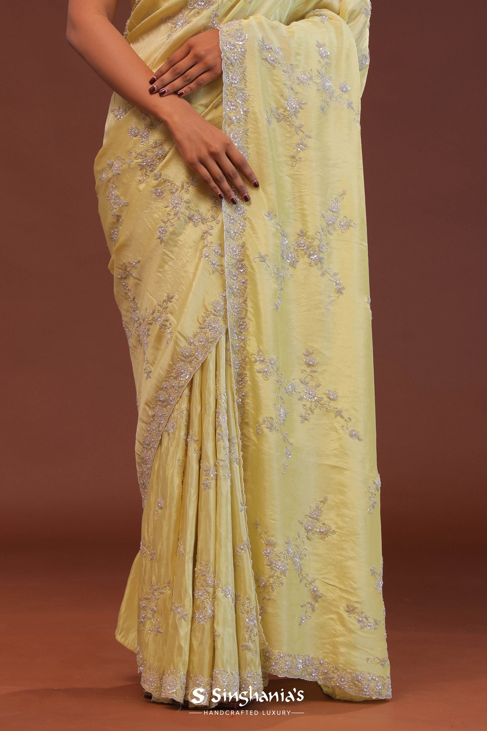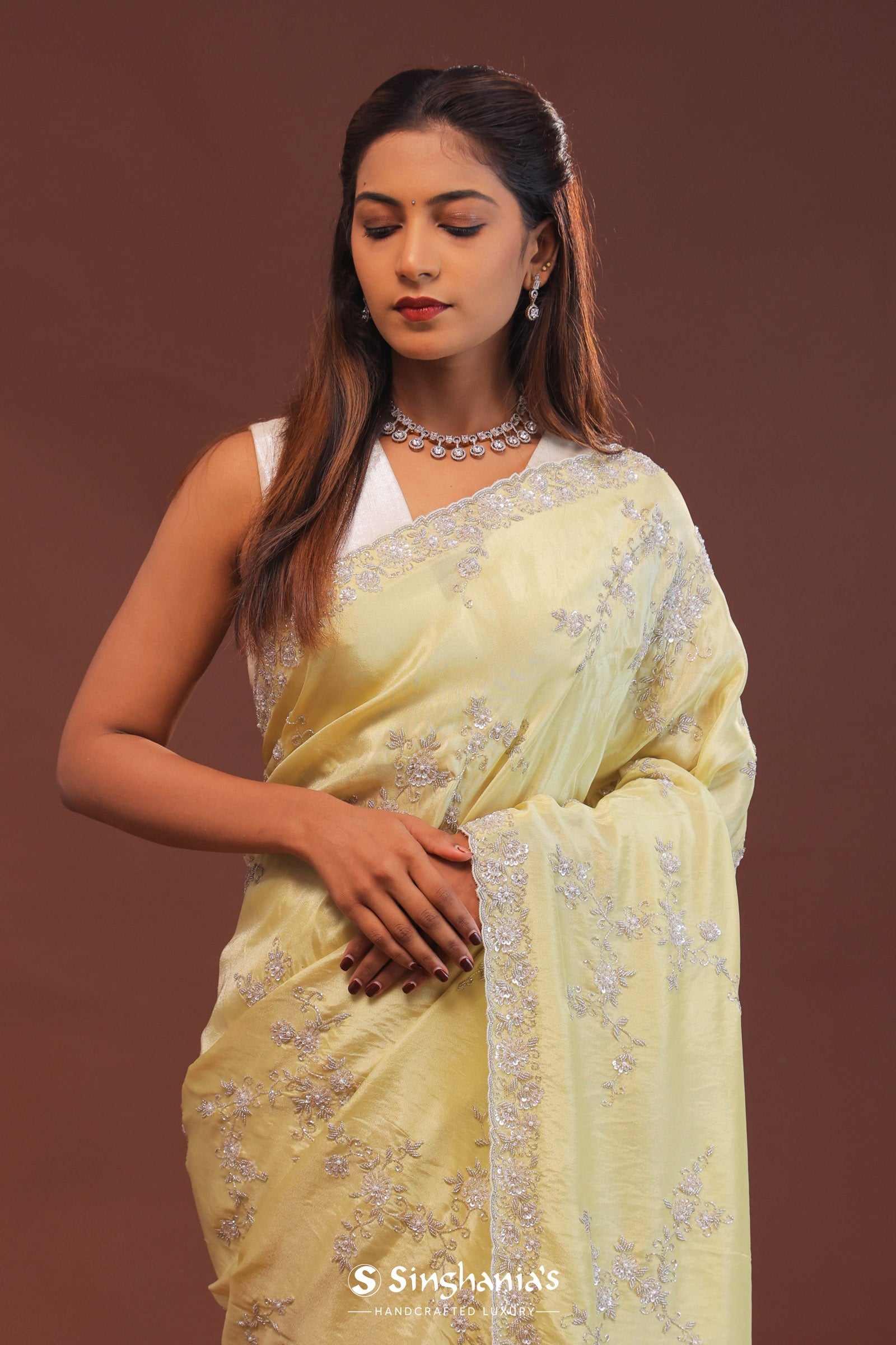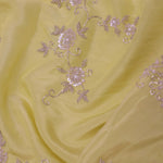 A beautifully embroidered light yellow organza saree with a scalloped border embellished with pearls, beads, and sequins in the shape of flowers. Delicate floral designs are also featured on the body, giving it a tasteful and balanced appearance.