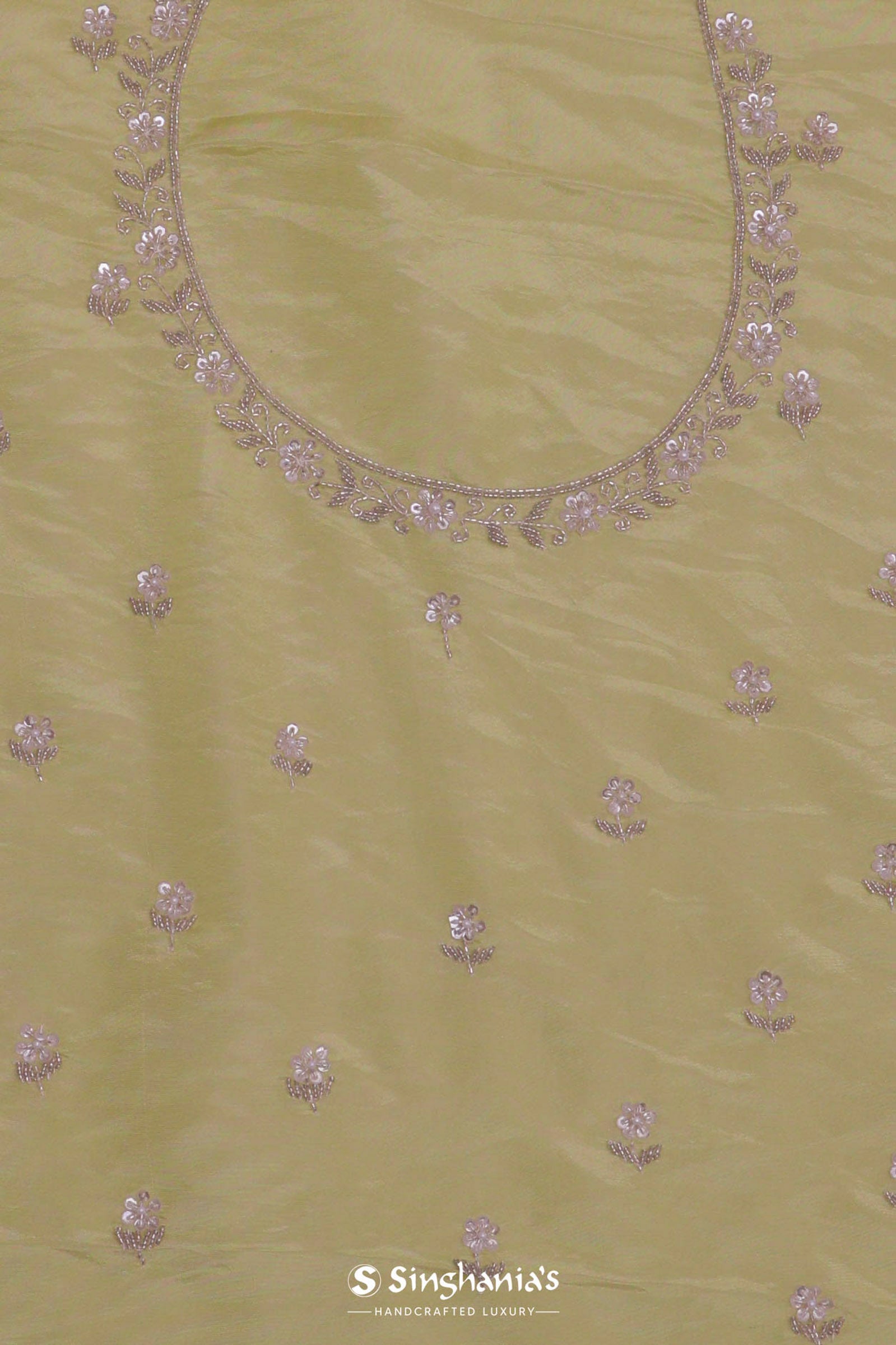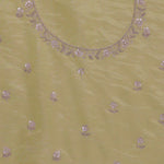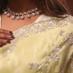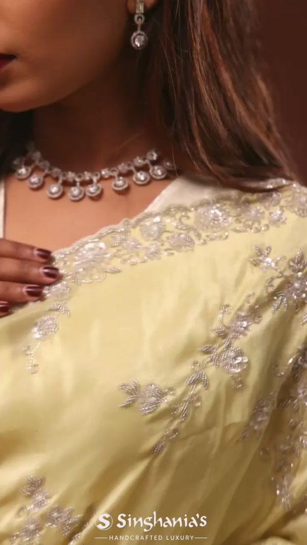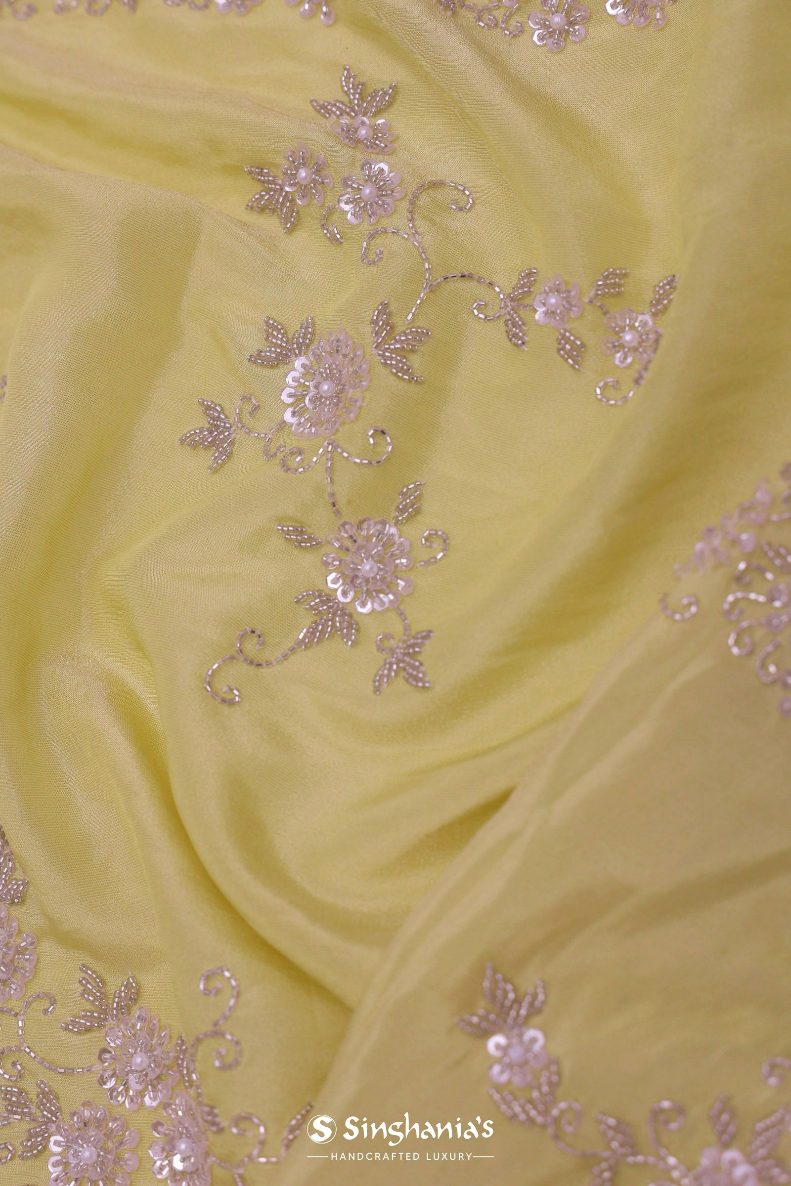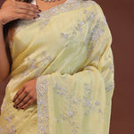 A beautifully embroidered light yellow organza saree with a scalloped border embellished with pearls, beads, and sequins in the shape of flowers. Delicate floral designs are also featured on the body, giving it a tasteful and balanced appearance.