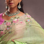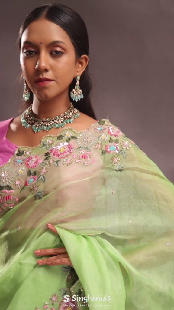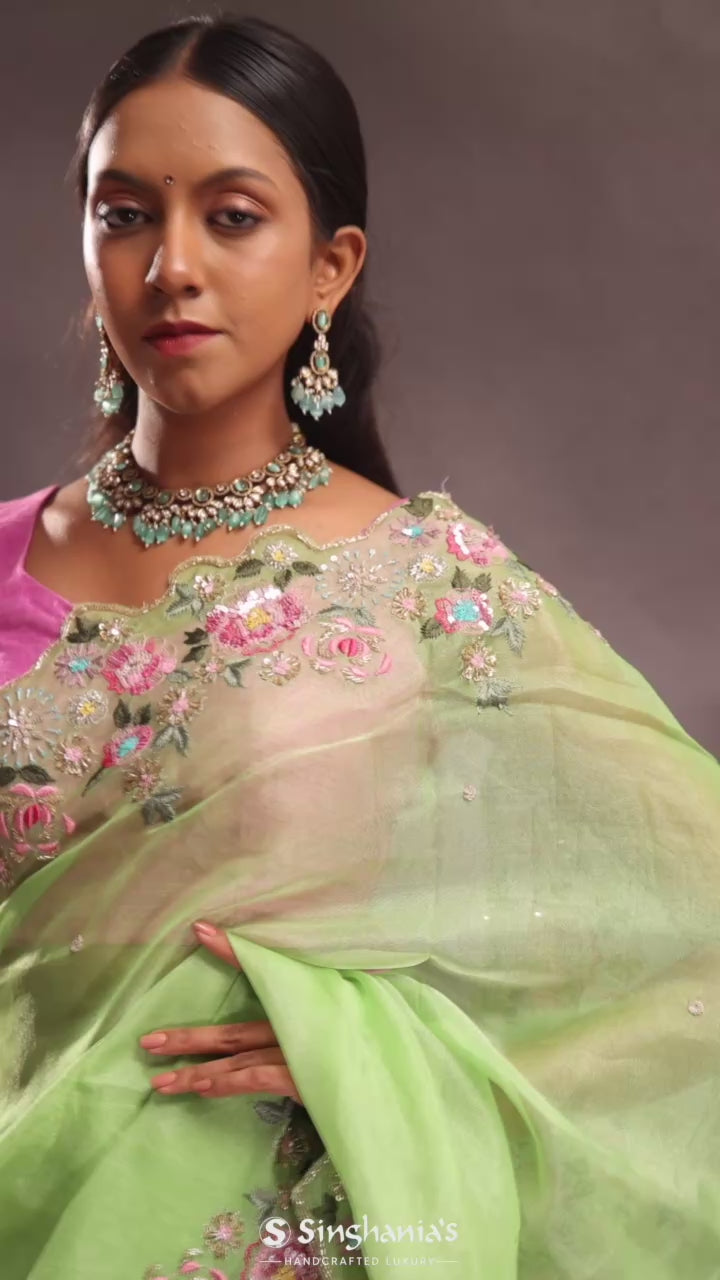 Lime Green Organza Embriodery Saree With Scallop Floral Border