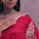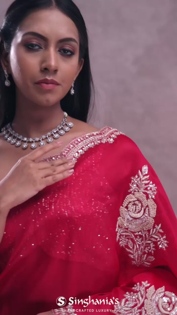 This stunning magenta organza saree is the epitome of elegance, crafted from a light yet luxurious fabric that drapes beautifully. The saree is adorned with intricate butta motifs, adding subtle charm to its rich hue. The scalloped border, enhanced with delicate sequin work, catches the light and adds a touch of sparkle, making it perfect for evening or festive occasions. The combination of sequins on both the butta and the border elevates the design, giving it a refined yet glamorous finish.