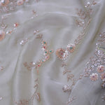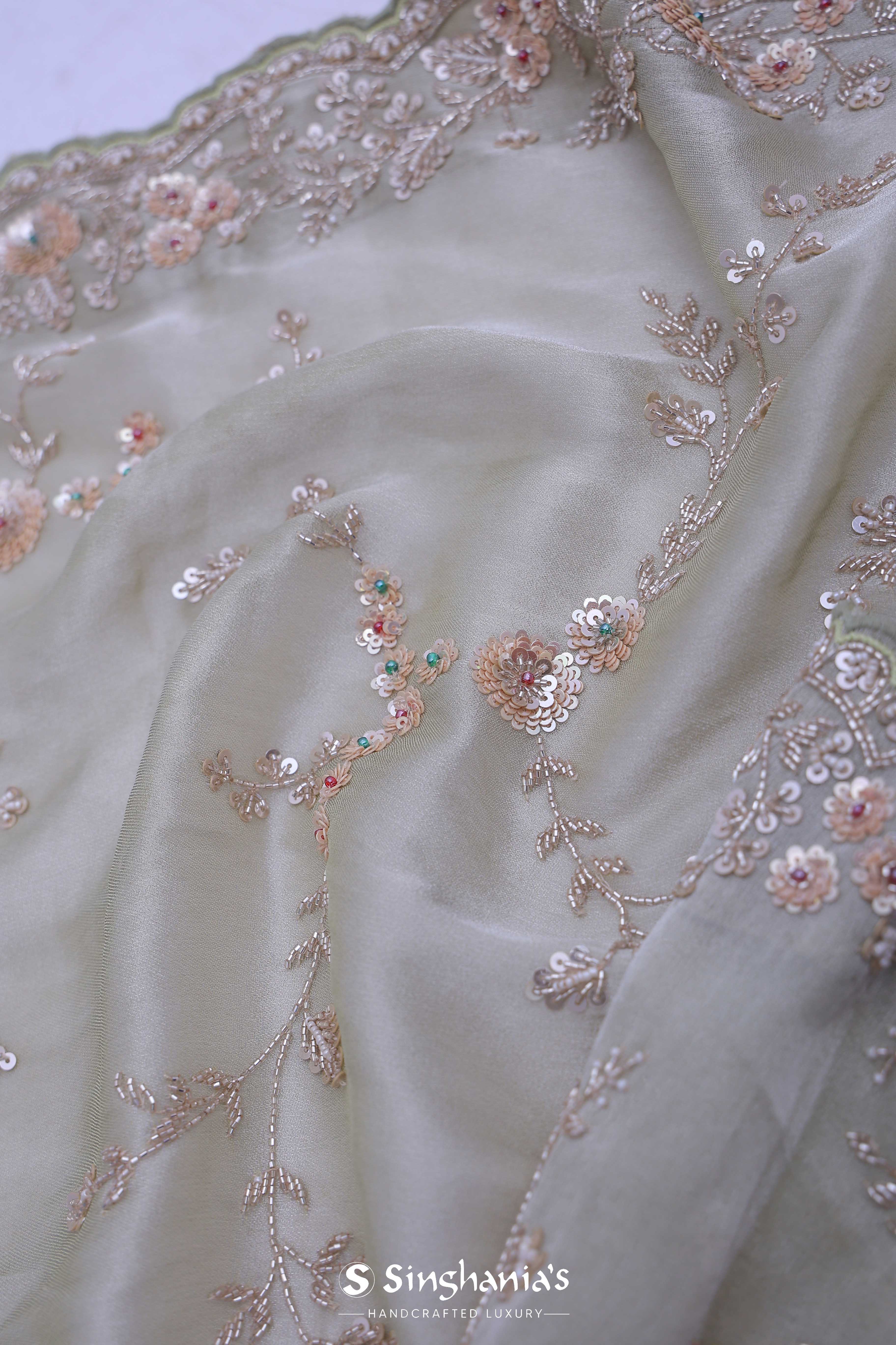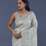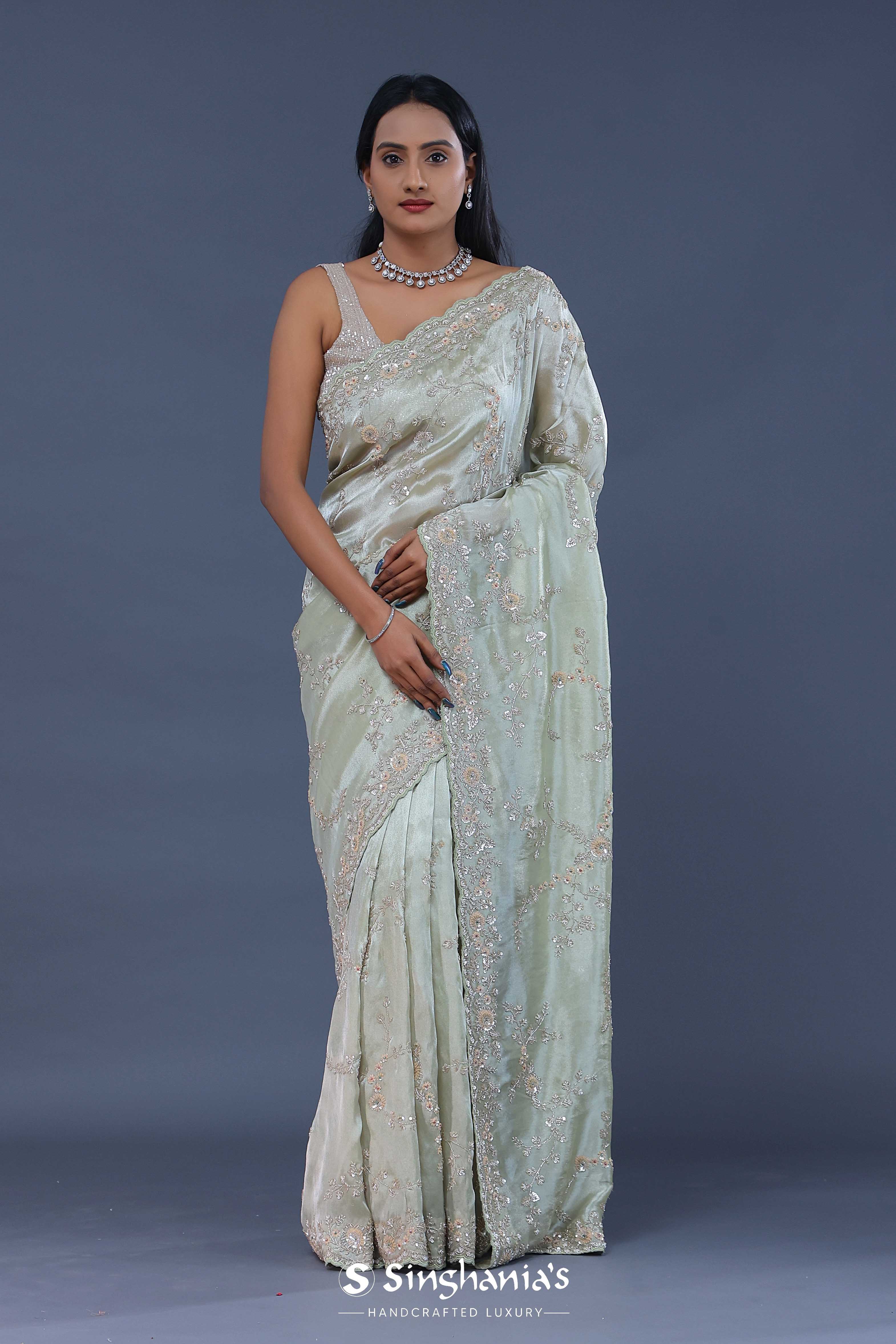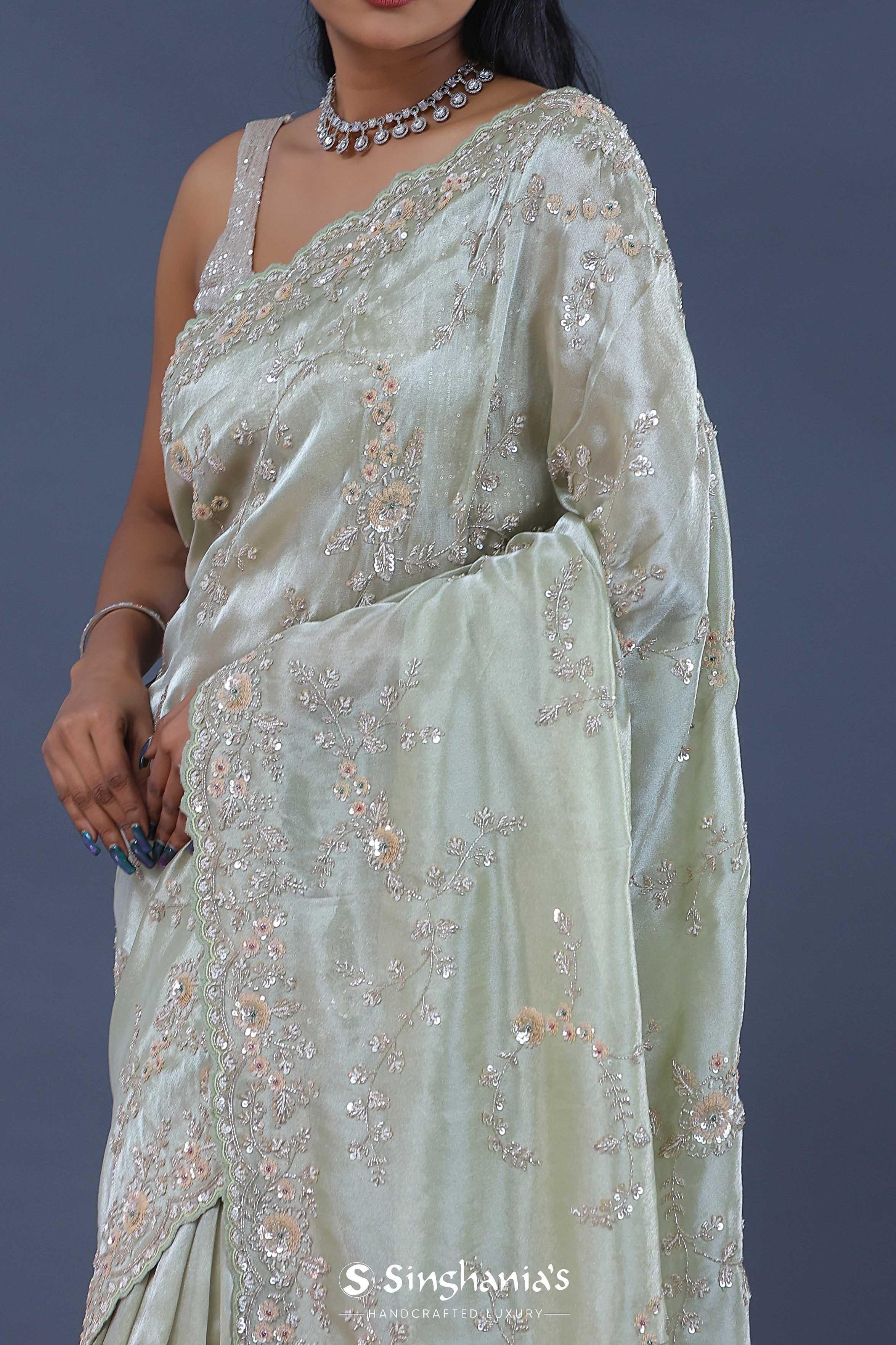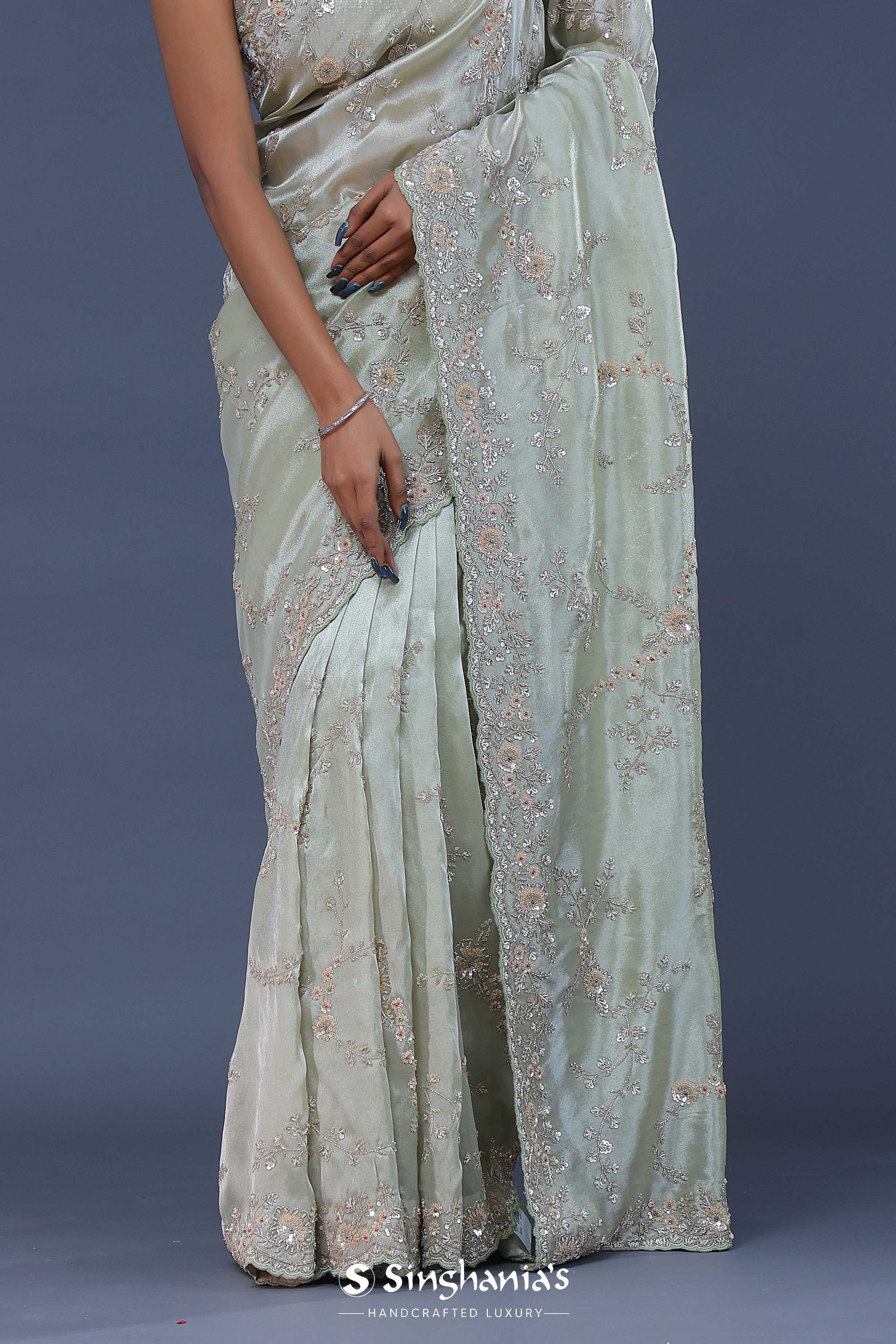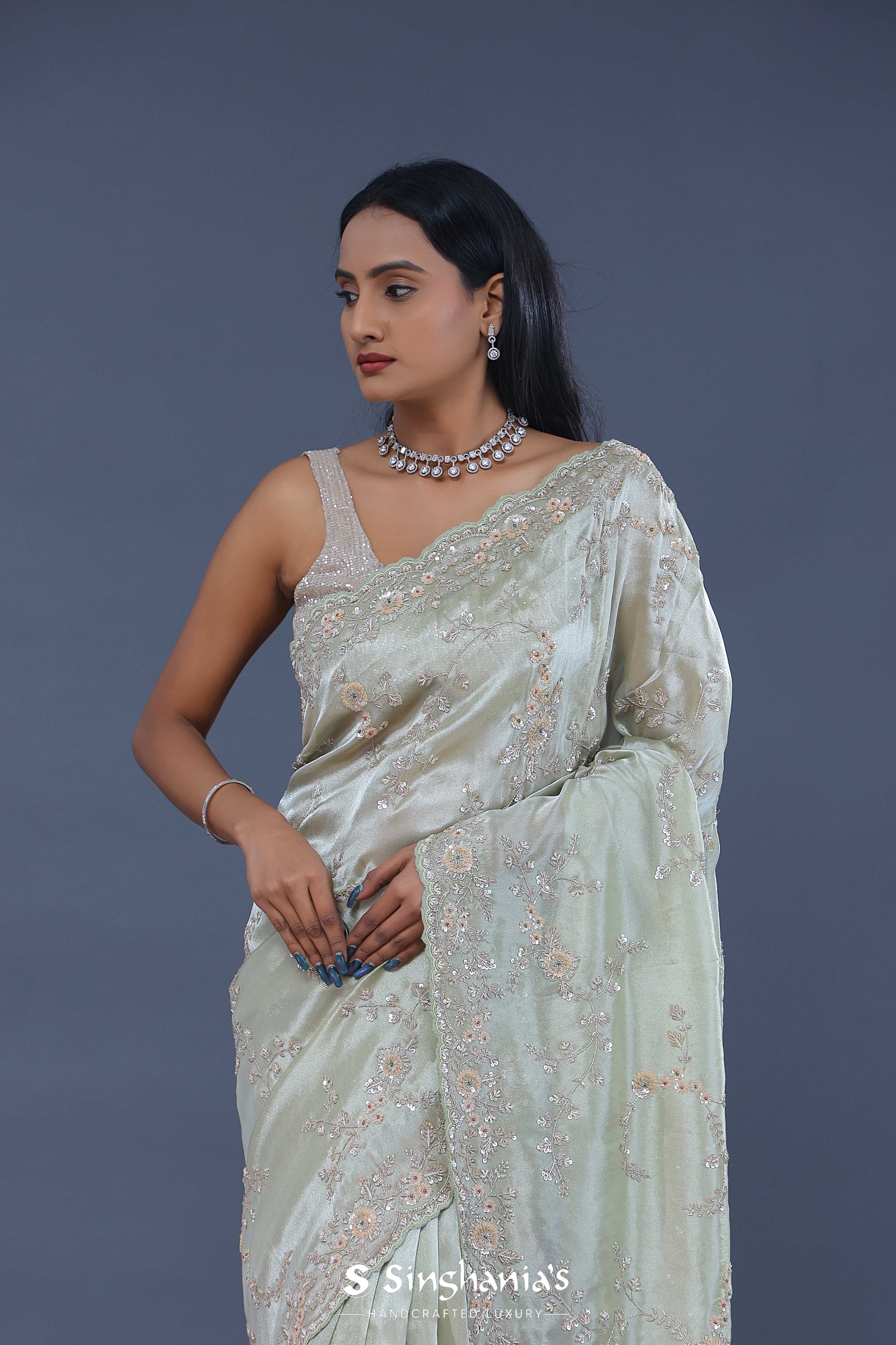This sheen and delicate texture of the pale pista green tissue saree embellished with floral jaal formed by dyeable sequins and kardana work on body and scallop border with making it special for your special occasions .