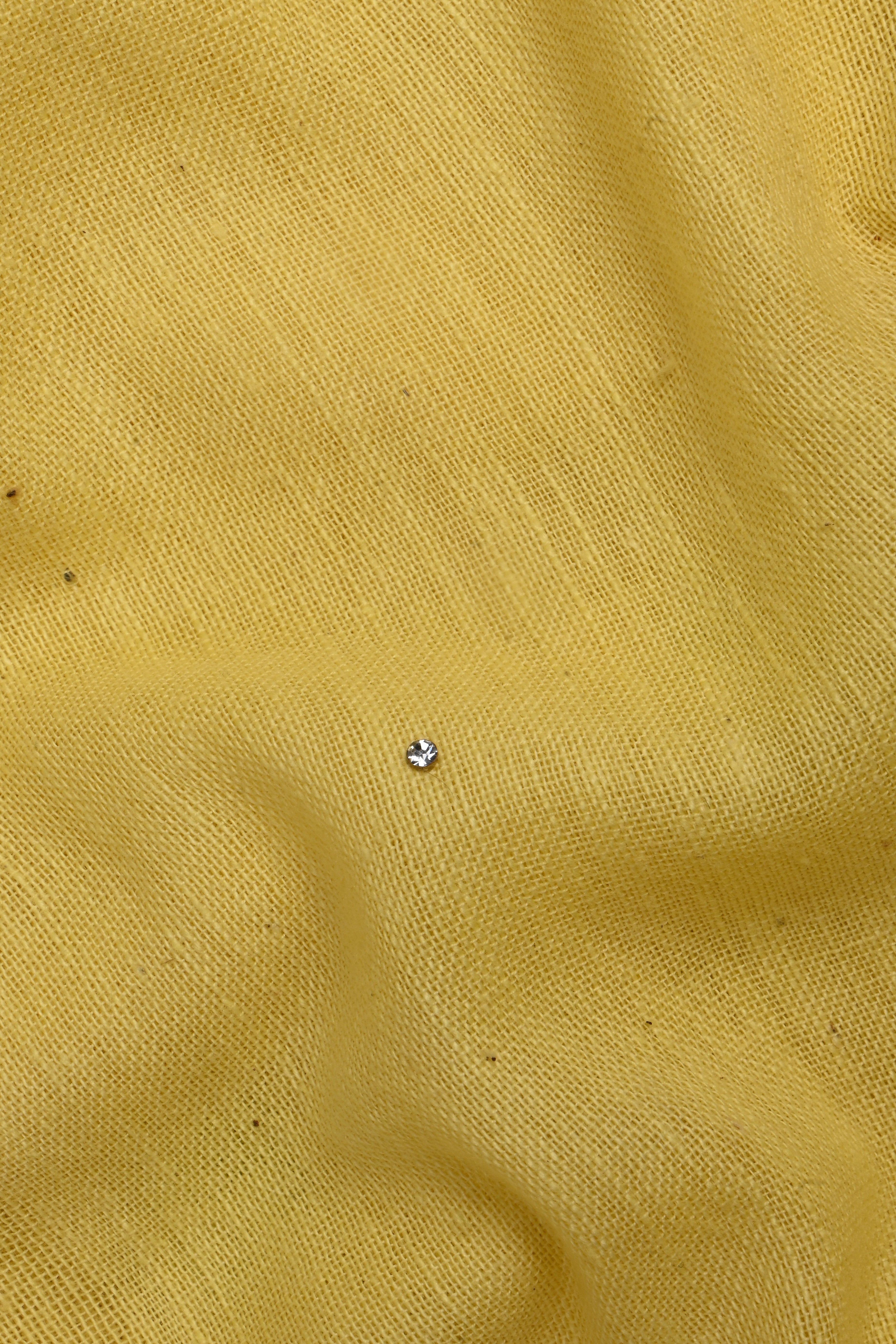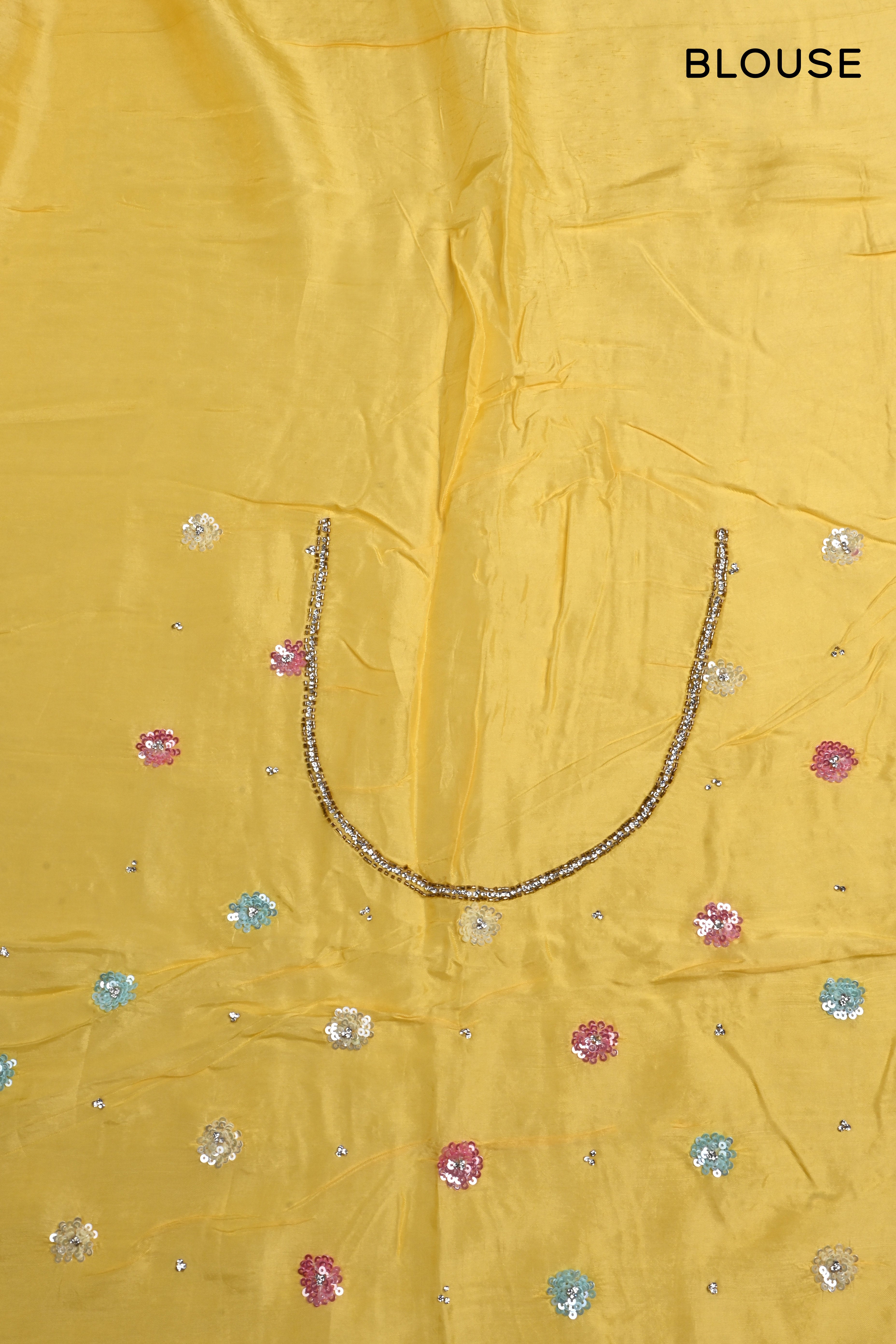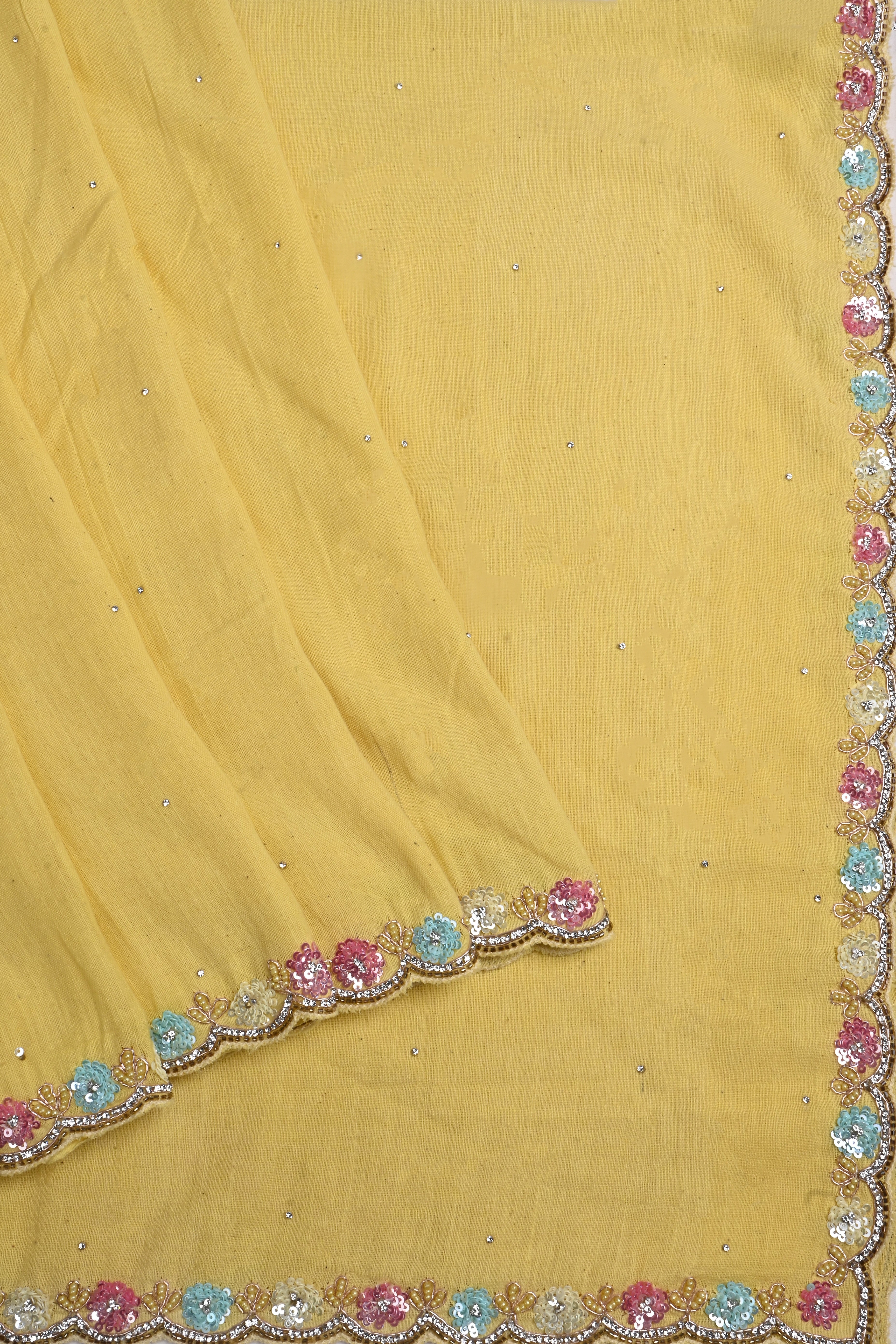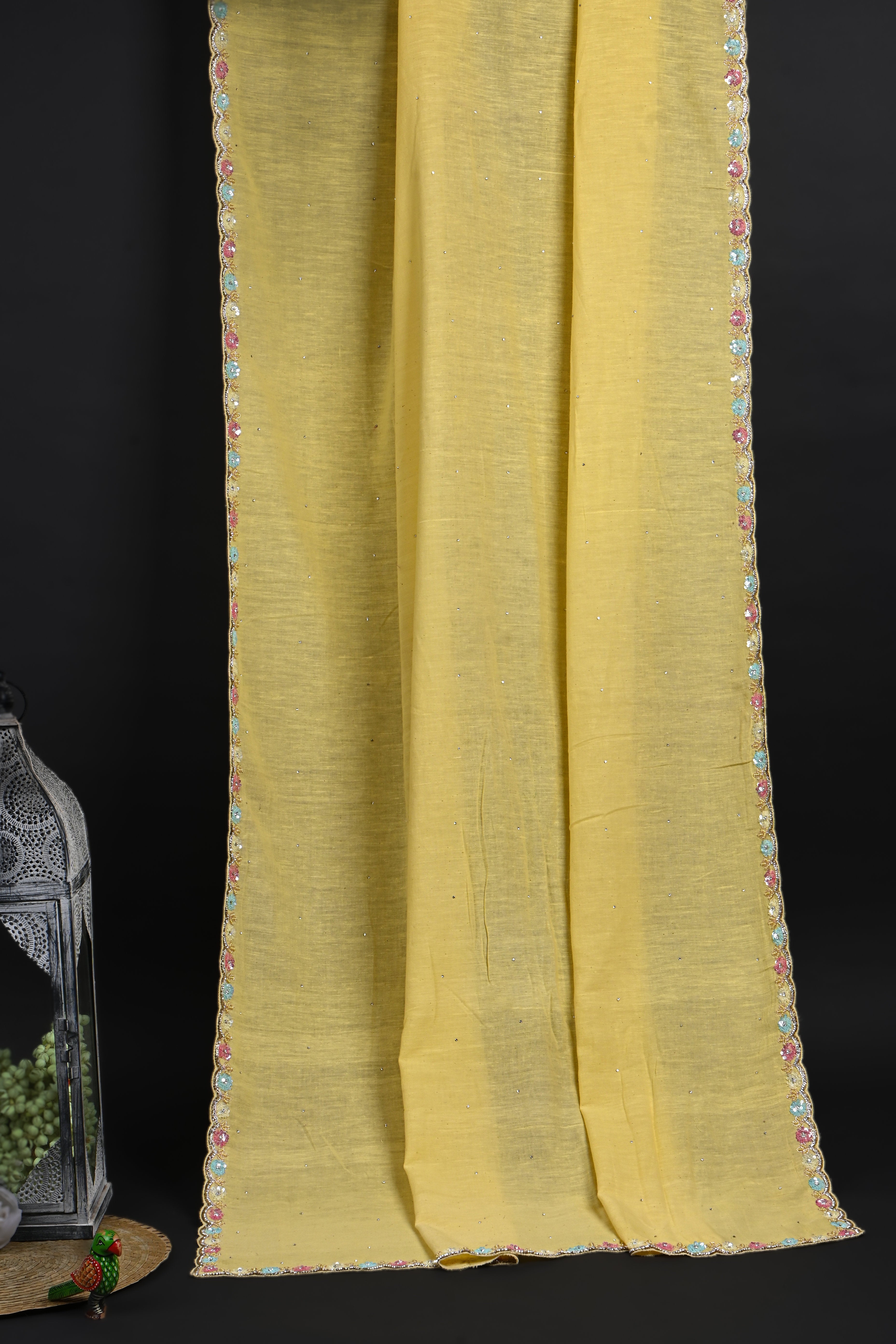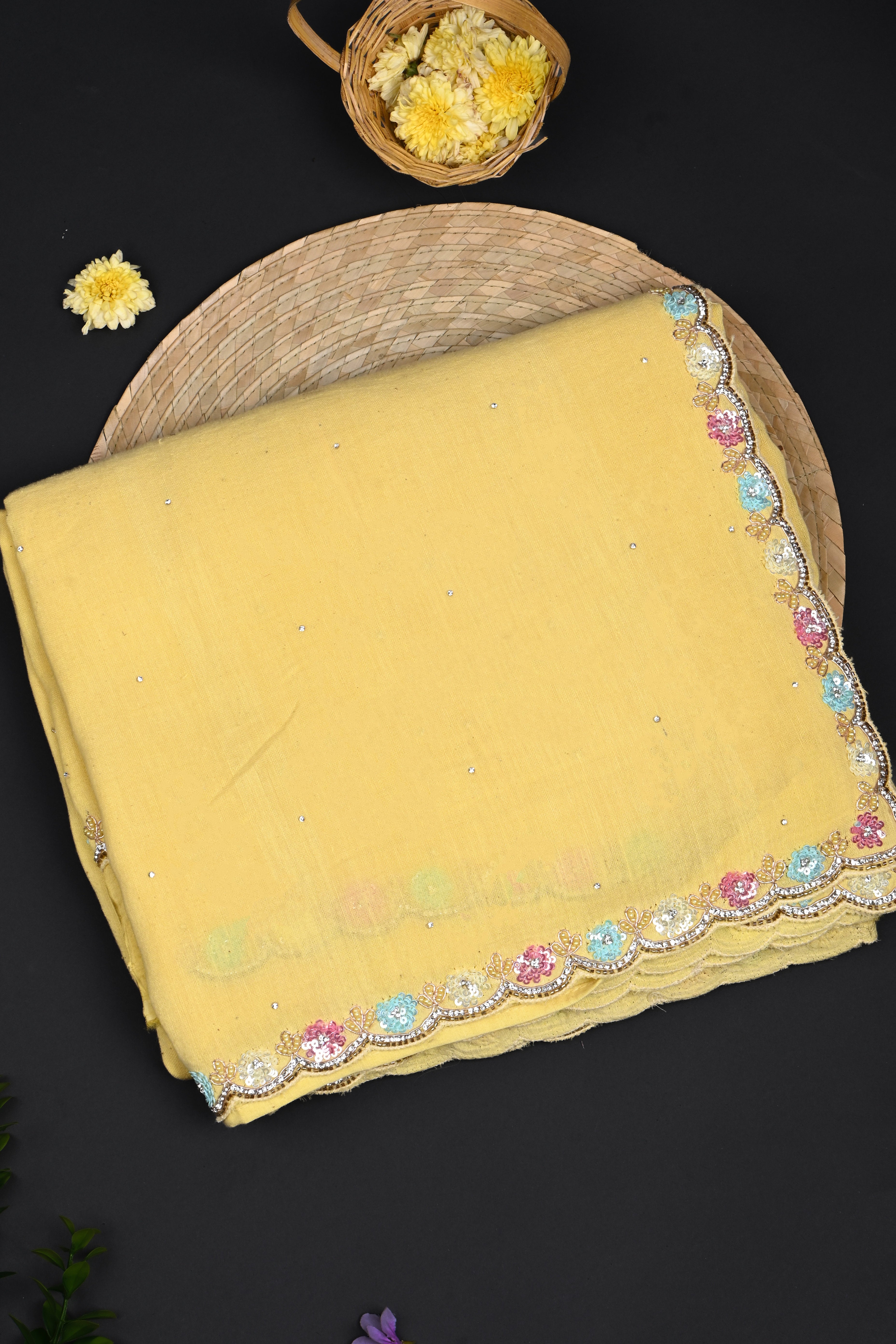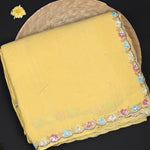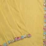 The pale yellow embroidered linen saree with floral embroidered scallop border and blouse for a classy neat ethnic look with grace.
