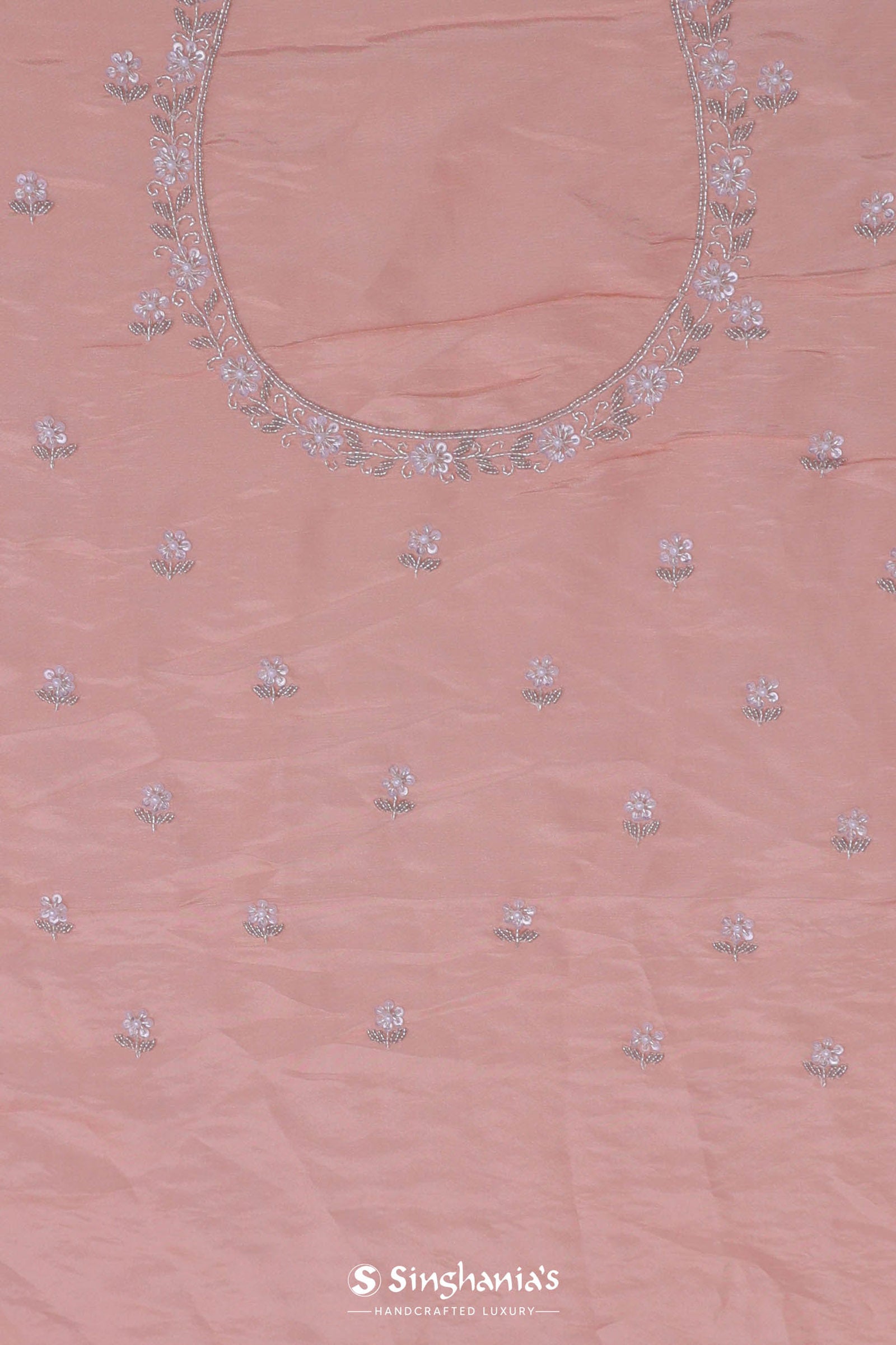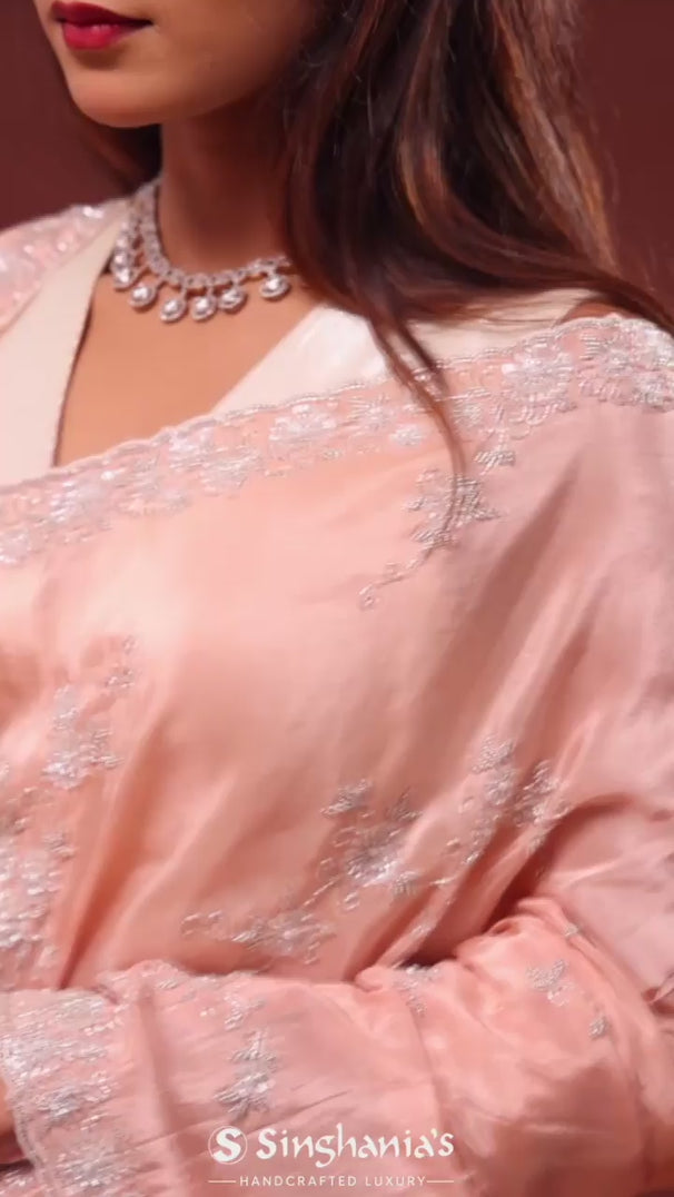 This beautiful peach organza embroidery saree has a delicate, feminine charm by the sequins and kardana design at border and on the body, thanks to its delicate threadwork and beautiful scallop border.