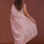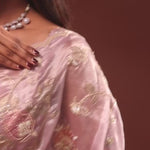 An organza saree in pink and purple with beautiful embroidery and a beaded scalloped border. Pearls, beads, and flowery gold pitta work adorn the body in a stunning way, combining tradition and elegance.